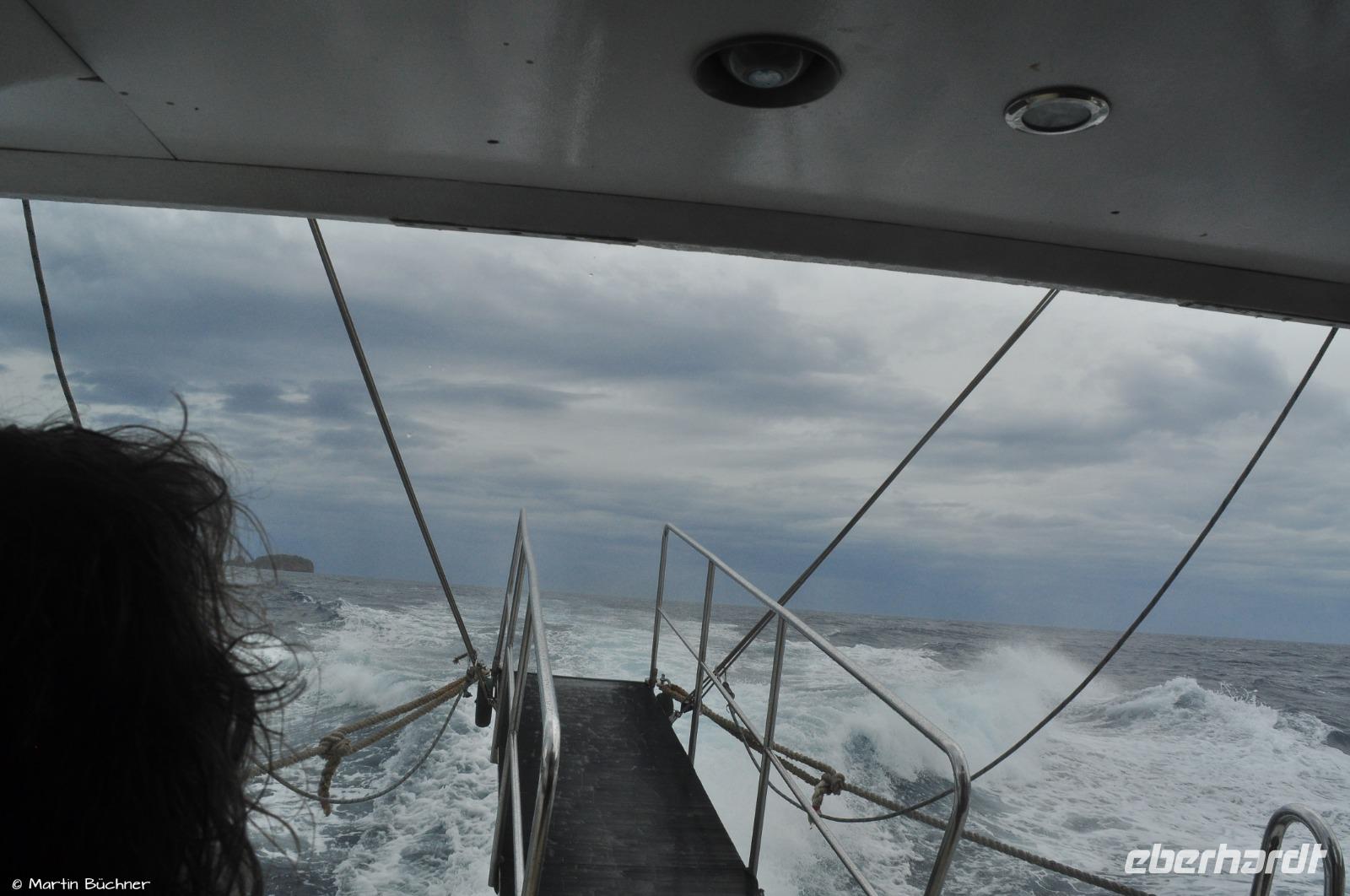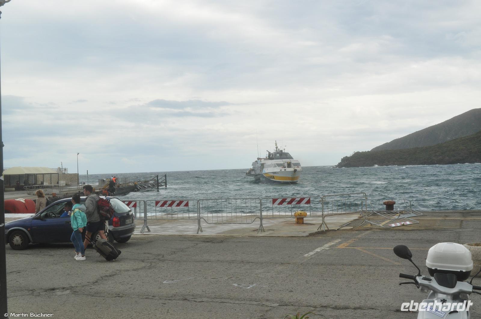 Erst später erfahren wir, dass zu diesem Zeitpunkt bereits die reguläre Fähre und mehrere Aliscafi (Tragflügelboote) aufgrund des hohen Seegangs ihre Anlegeversuche auf Vulcano angebrochen hatten. Ferner erfuhren wir, dass wir das letzte Boot an diesem Tag waren, das zwischen Vulcano und Lipari unterwegs war.