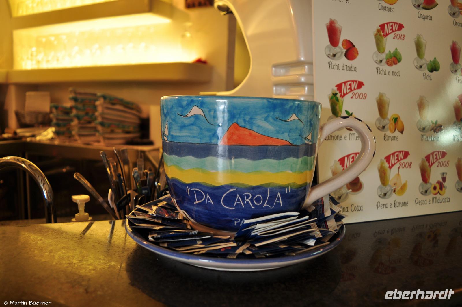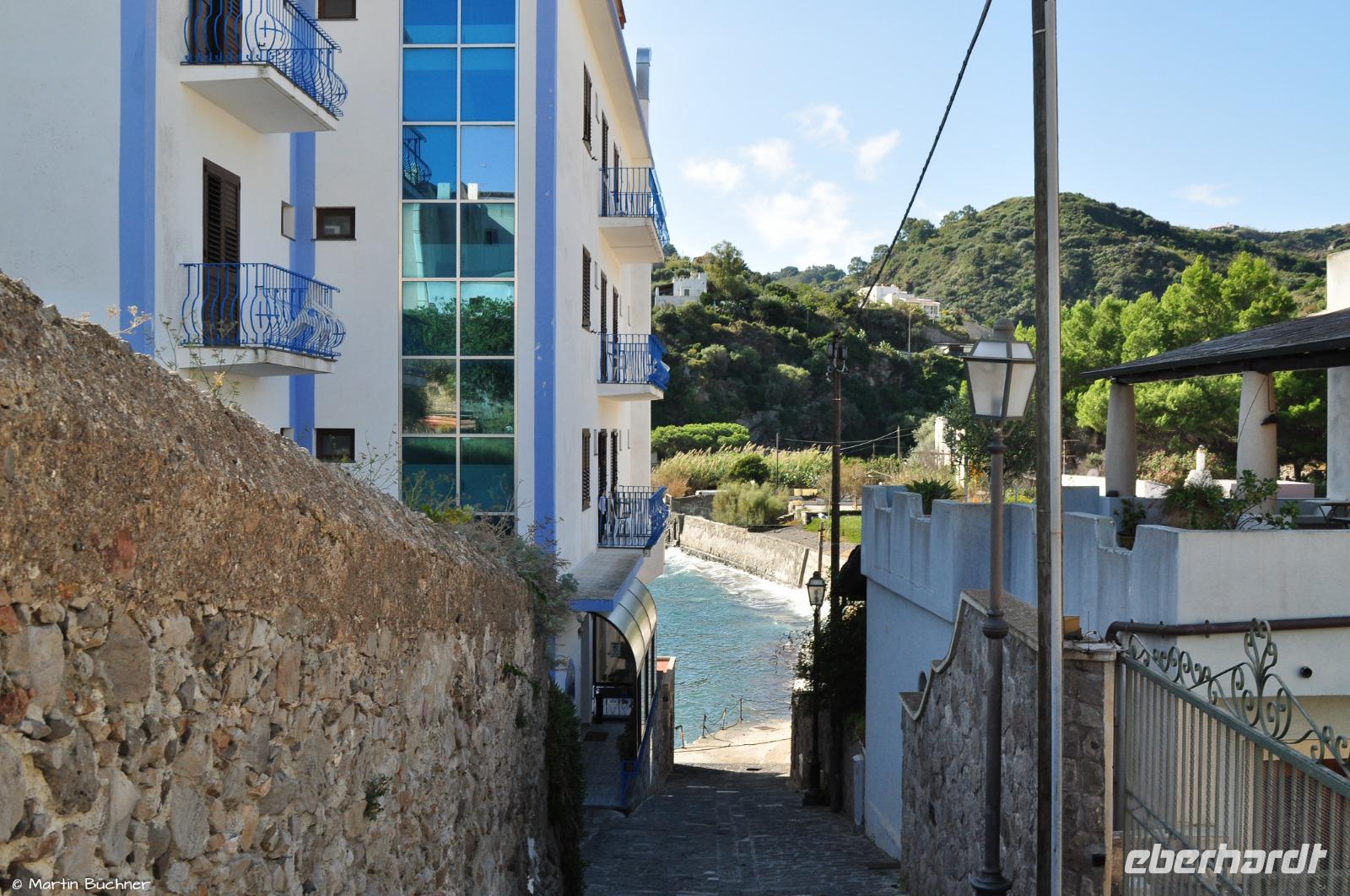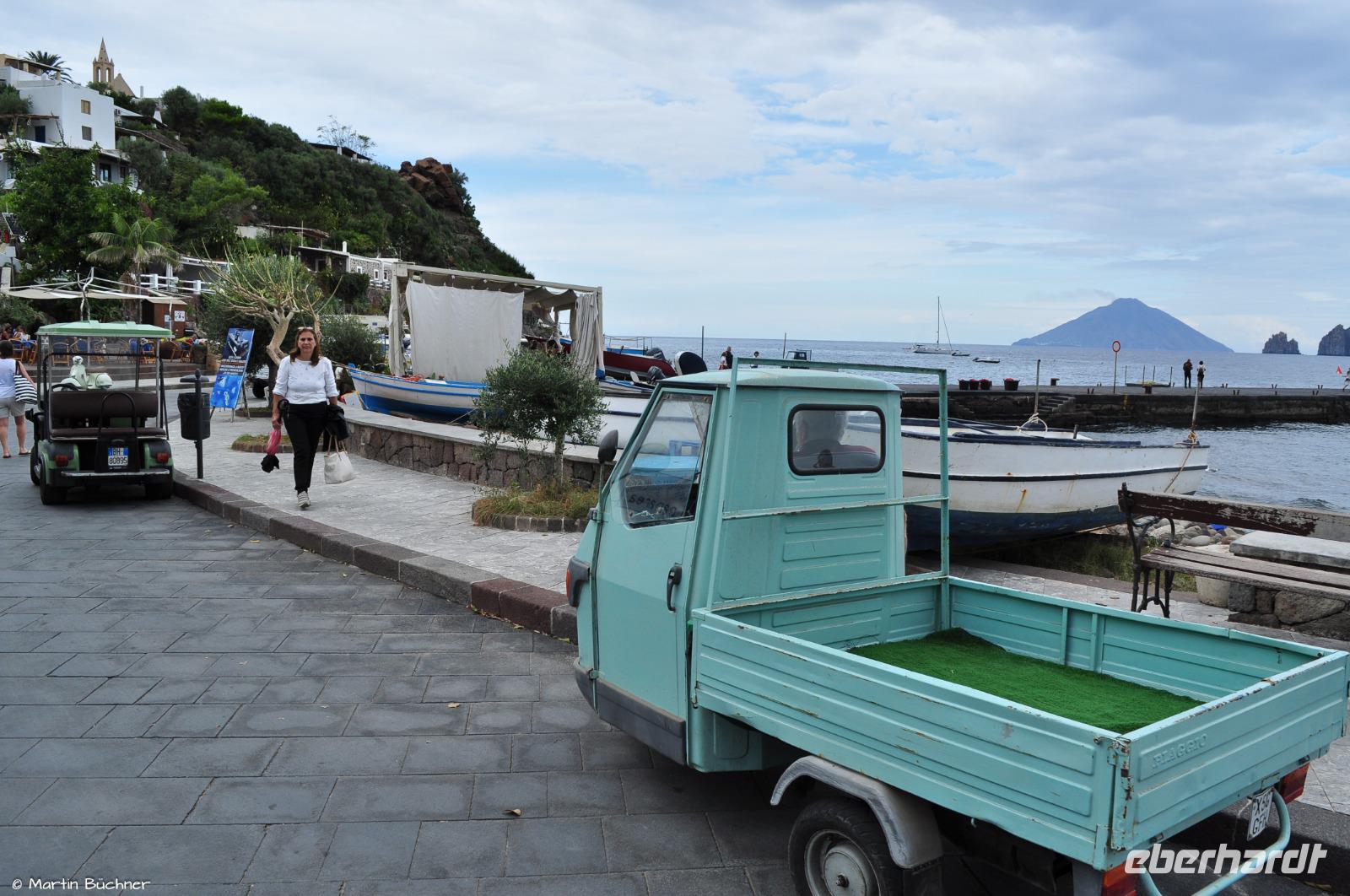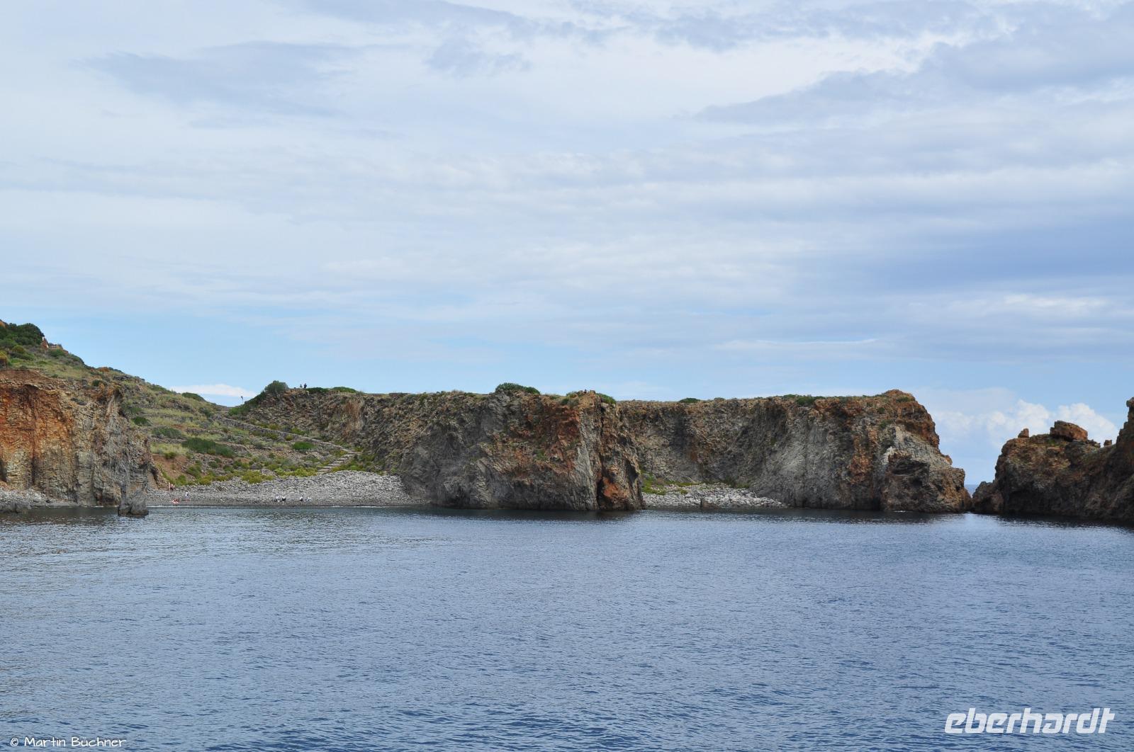 In der Mittagszeit bringt uns ein Boot samt Gepäck in Richtung Stromboli. Wir haben einen kurzen Zwischenstopp auf Panarea. Es reicht für einen kleinen Spaziergang durch den Ort und Genuss einer der berühmten Granitas. Die Insel ist in den Sommermonaten besonders bei den Reichen und Schönen beliebt, dann tummeln sich Millionäre und Milliardäre in Panareas Buchten.