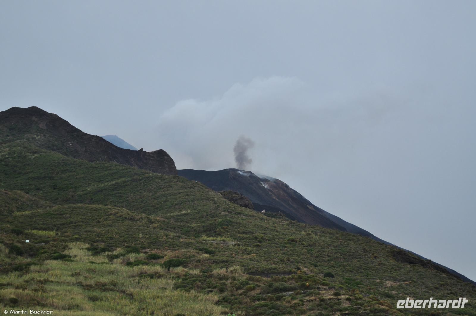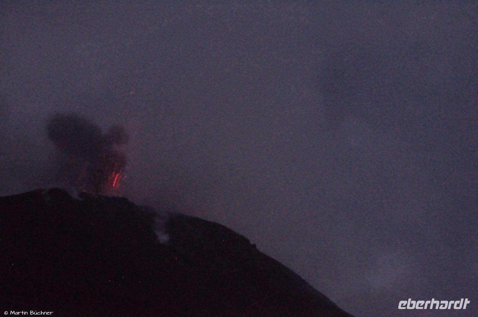 Oben angekommen, belohnt der Stromboli den fordernden Aufstieg mit ein paar heftigen Eruptionen. Es sei erwähnt, dass die Insel und auch der Weg zum Gipfel heute recht leer sind, da aufgrund der Wetterlage auf See (nicht am Stromboli selbst!), alle Ausflüge von anderen Inseln nach Stromboli abgesagt wurden. Heute legen folglich keine Ausflugsboote an.