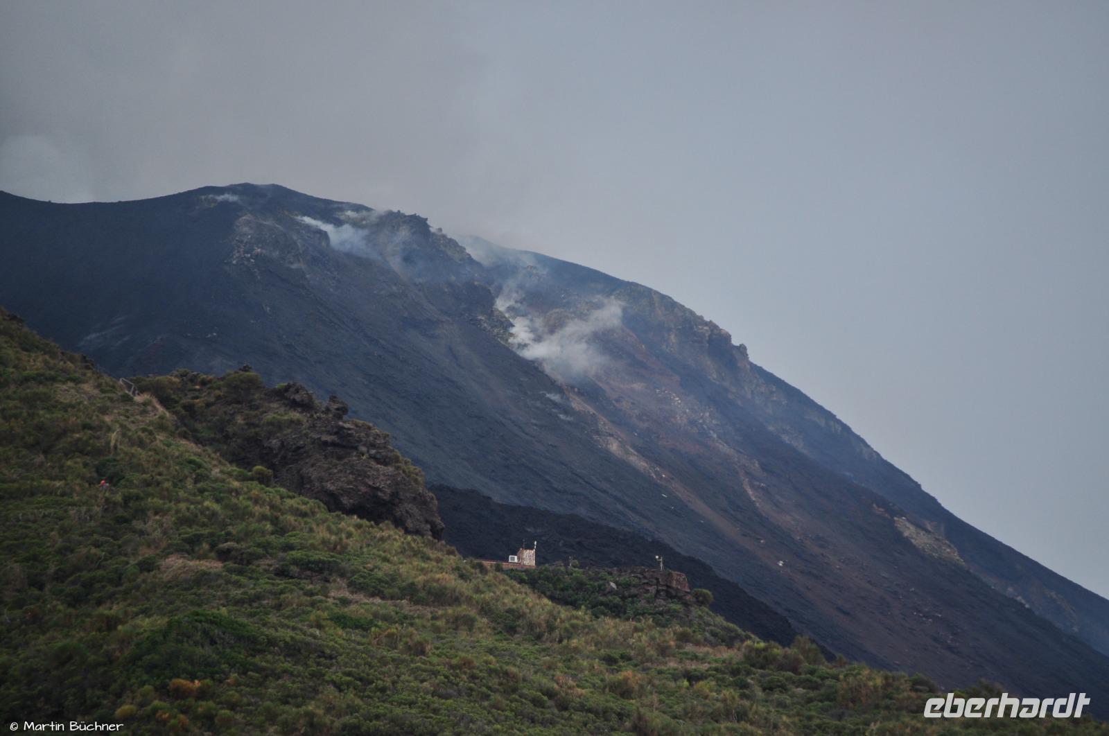 Die Agentur entscheidet, dass ein Aufstieg möglich ist. Eine Dame entscheidet sich gegen den Aufstieg. Ich biete Ihr an, gemeinsam zur Sciara del Fuoco zu gehen, damit auch sie Ihr Vulkan-Erlebnis bekommen kann. Der andere Teil der Gruppe steigt mit Monika und dem Vulkan-Guide zum Gipfel auf.