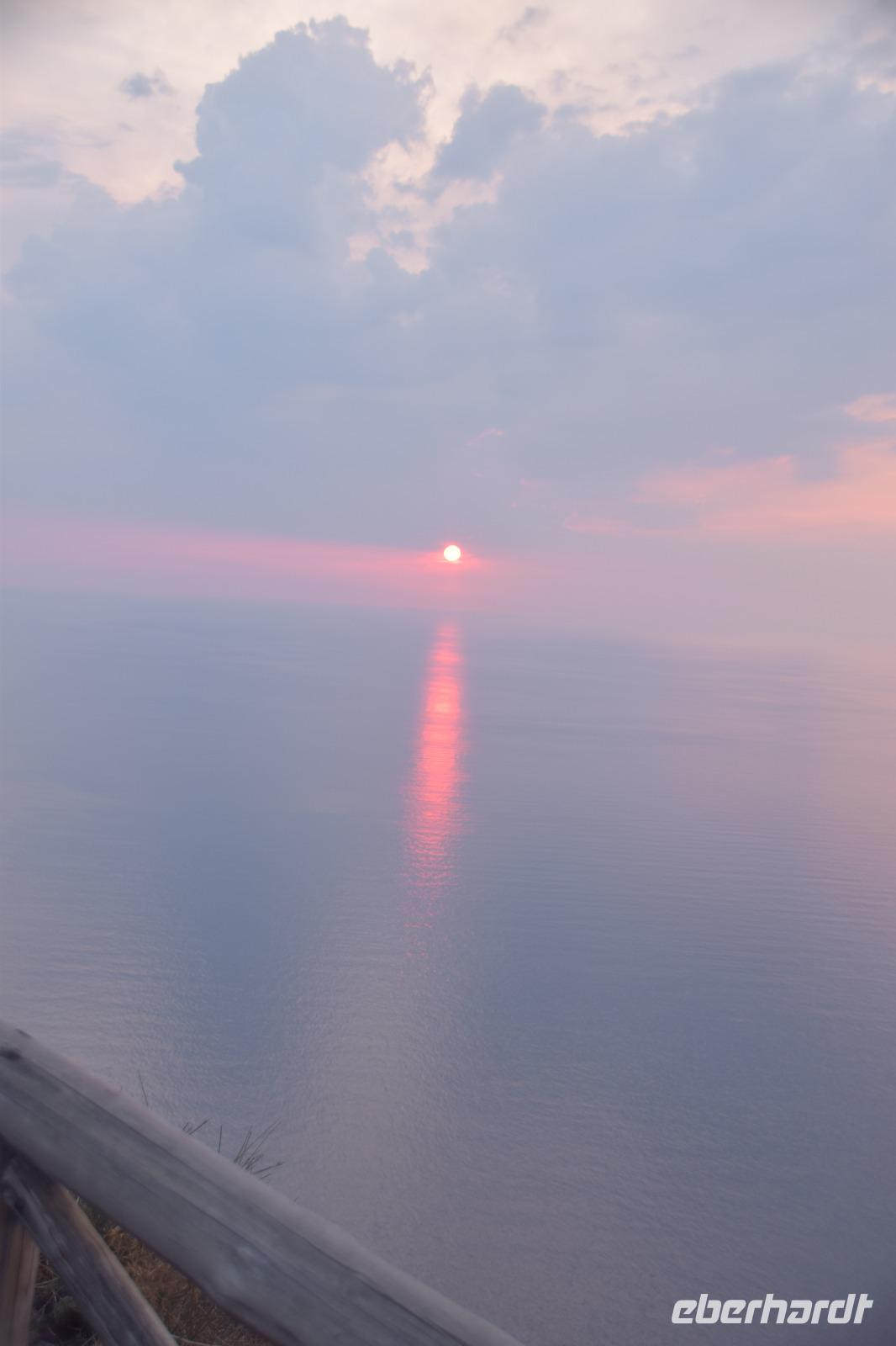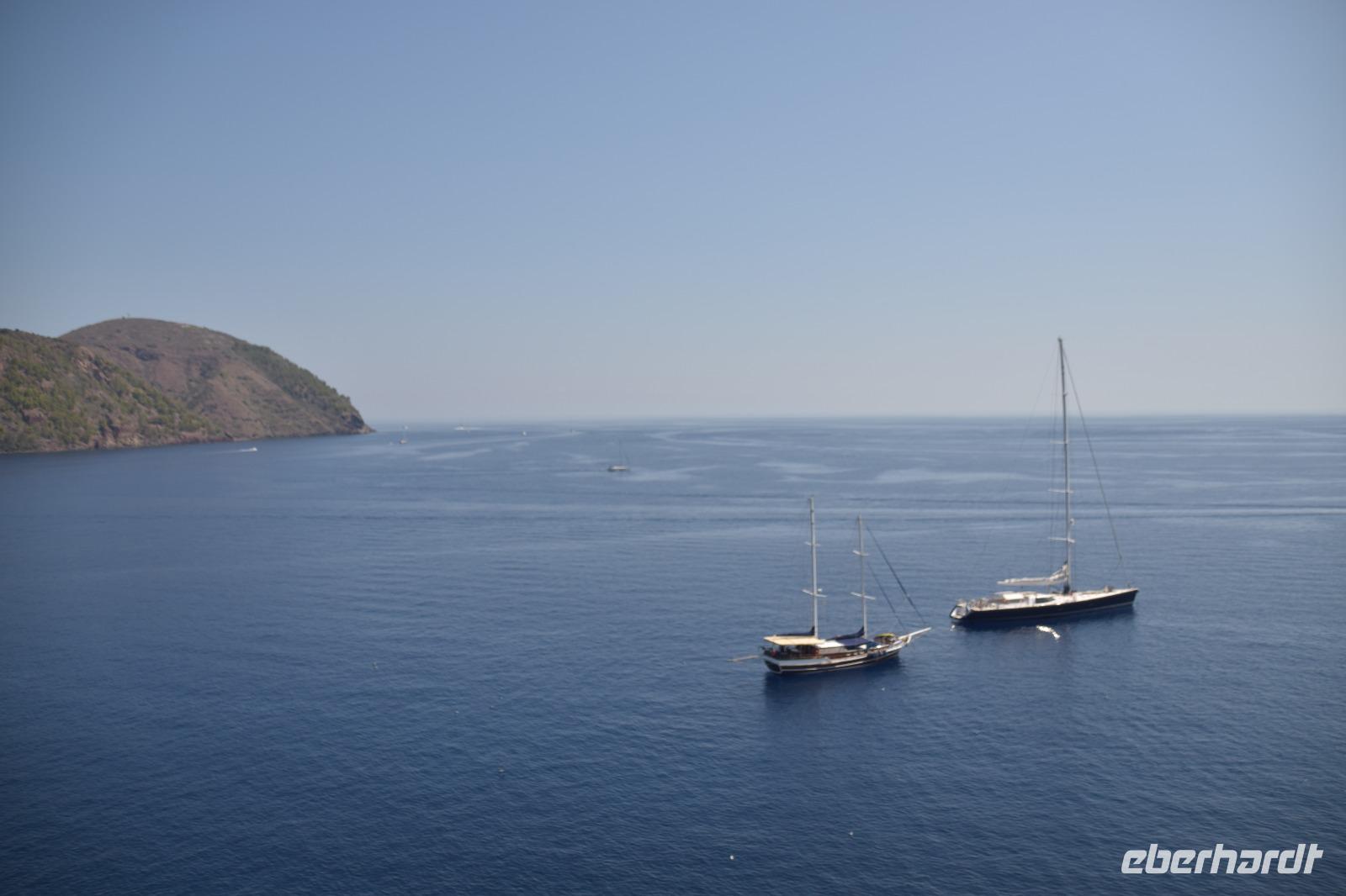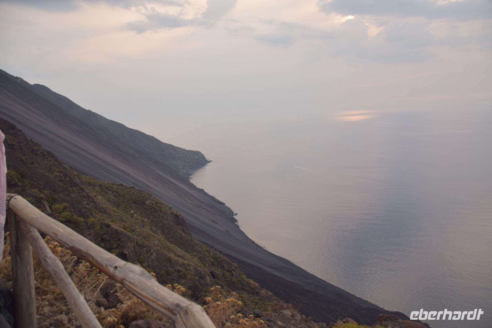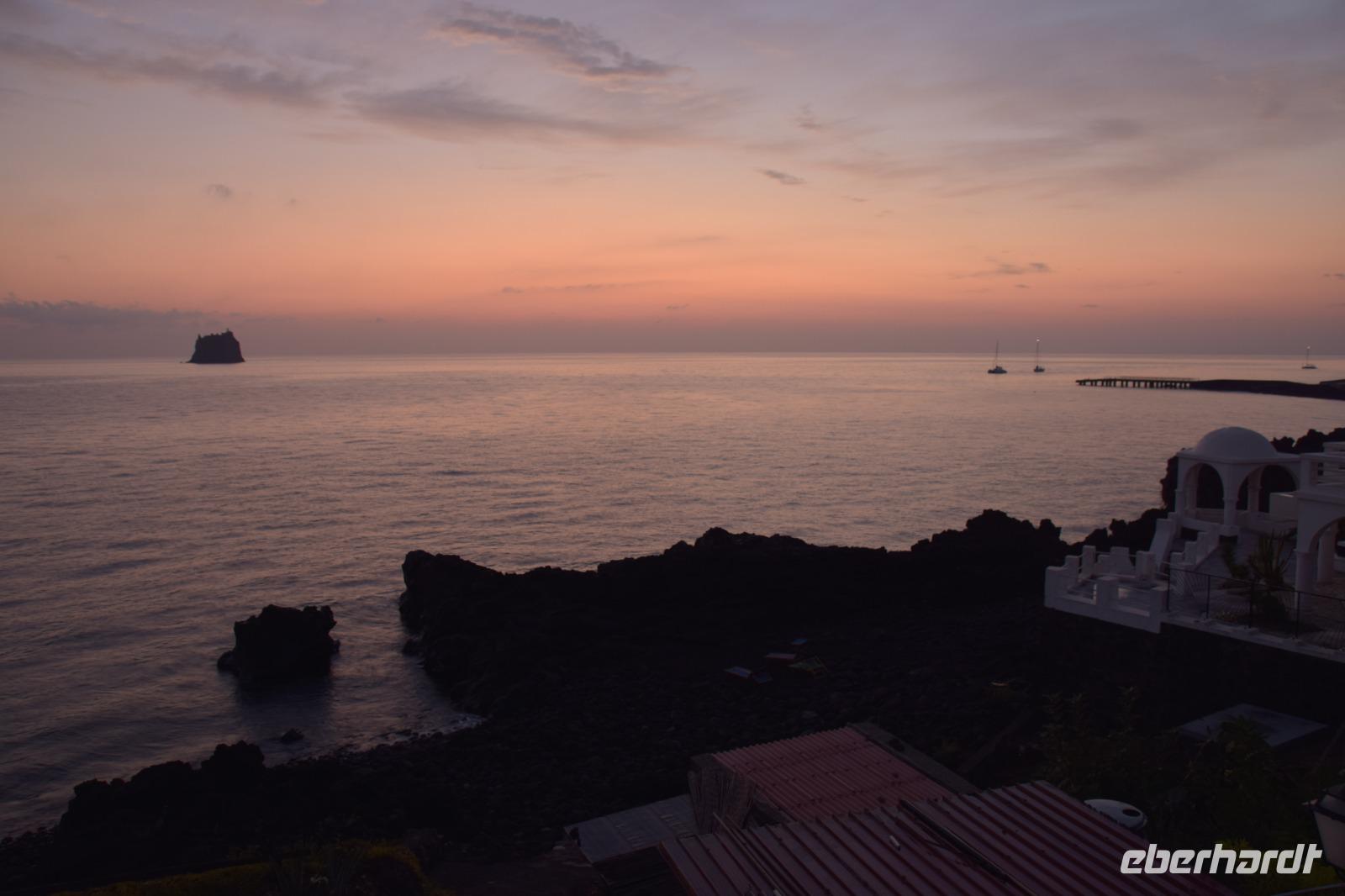 Eines der Highlights der Reise stand heute auf dem Tagesplan. Da unsere Wanderung entlang des Stromboli aber erst am Nachmittag anstand, konnten alle den Vormittag frei nutzen. Der strahlende Sonnenschein und die ruhige See lockten zu einem erfrischenden Bad. Zum Mittag trafen wir uns alle im Hotelrestaurant. Wieder waren wir, abgesehen von der Familie des Besitzers die einzigen Gäste und wurden dementsprechend kulinarisch verwöhnt. Um 16 Uhr startete dann die lang ersehnte Wanderung vom Kirchenvorplatz aus. Zuerst ein gutes Stück bergauf, bis wir etwa 400 Höhenmeter erreichten. Dann wanderten wir auf etwa einer Höhe bleibend entlang des Vulkans. Ab und zu passierten wir auch eine Schlucht. Der späte Nachmittag brachte auch viel Schatten, was das wandern noch angenehmer machte. Unser Ziel erreichten wir mit der einzigen noch begehbaren Aussichtsterrasse. Wir hatten großes Glück, denn wir waren fast die ersten dort und konnten deshalb schon so einige Eruptionen mit folgender Rauchwolke und herabfallenden Geröll in Ruhe bewundern. Je weiter der Abend voran rückte, desto voller wurde die Terrasse. Kurz nach Sonnenuntergang, welcher heute aufgrund von einigen Wolken etwas verhalten war, entschieden wir uns zu unseren Abendessen im alten Observatorium zu gehen. Hier begann das wahre Spektakel. Unser Tisch war perfekt platziert und wir konnten in etwa 10 minütigen Takt leuchtend orange-rote Eruptionen bewundern, während wir genüsslich unsere Antipasti und Pizza verspeisten. Es viel uns schwer nach einigen Stunden diesen wunderbaren Ort zu verlassen. Aber auf dem Heimweg gab es noch einen kleinen Bonus für Auge. Wir stellten uns an den Wegesrand, knipsten unsere Taschenlampen aus und genossen einen atemberaubenden Sternenhimmel. Durch die fehlende Straßenbeleuchtung ist die Lichtemission sehr gering und dadurch kann man in wolkenfreien Nächten diesen bewundern. Mit tollen Eindrücken vom Tag ging es danach direkt ins Bett.