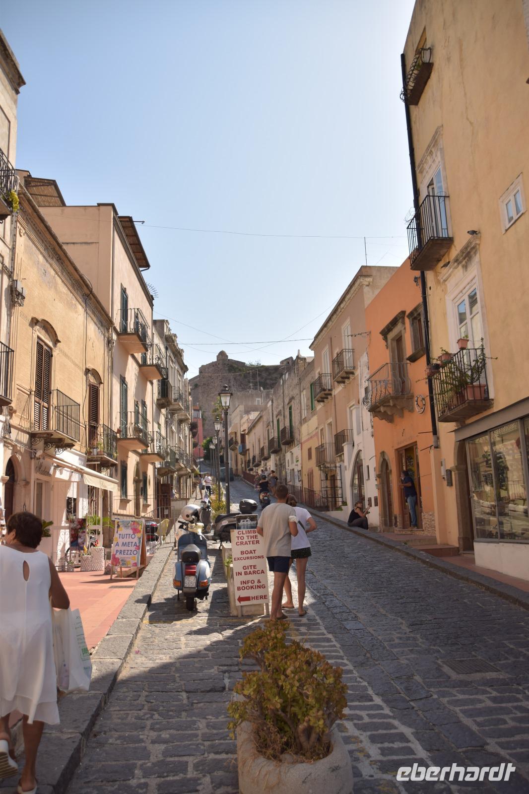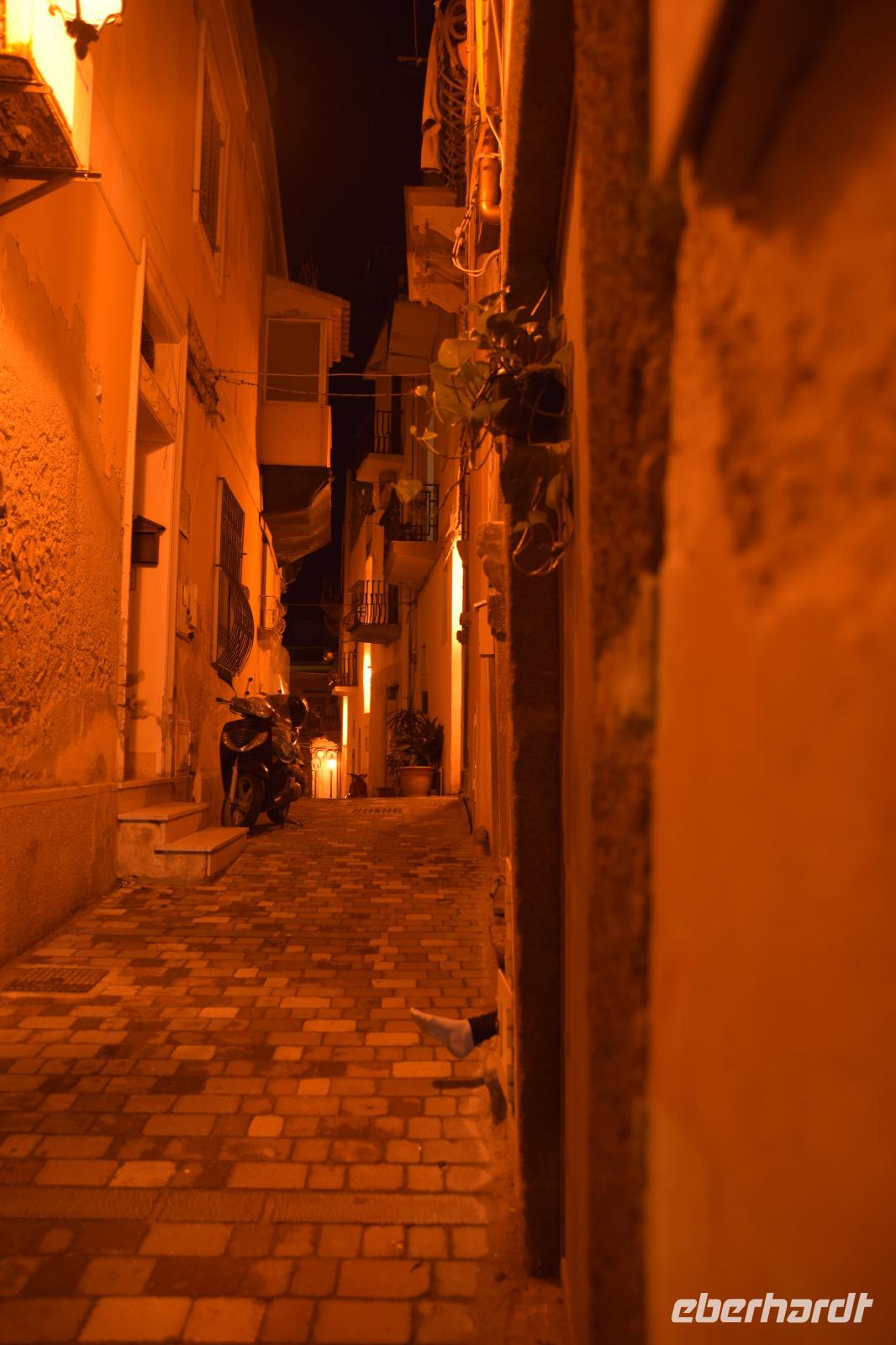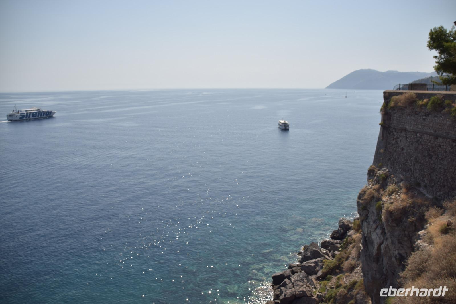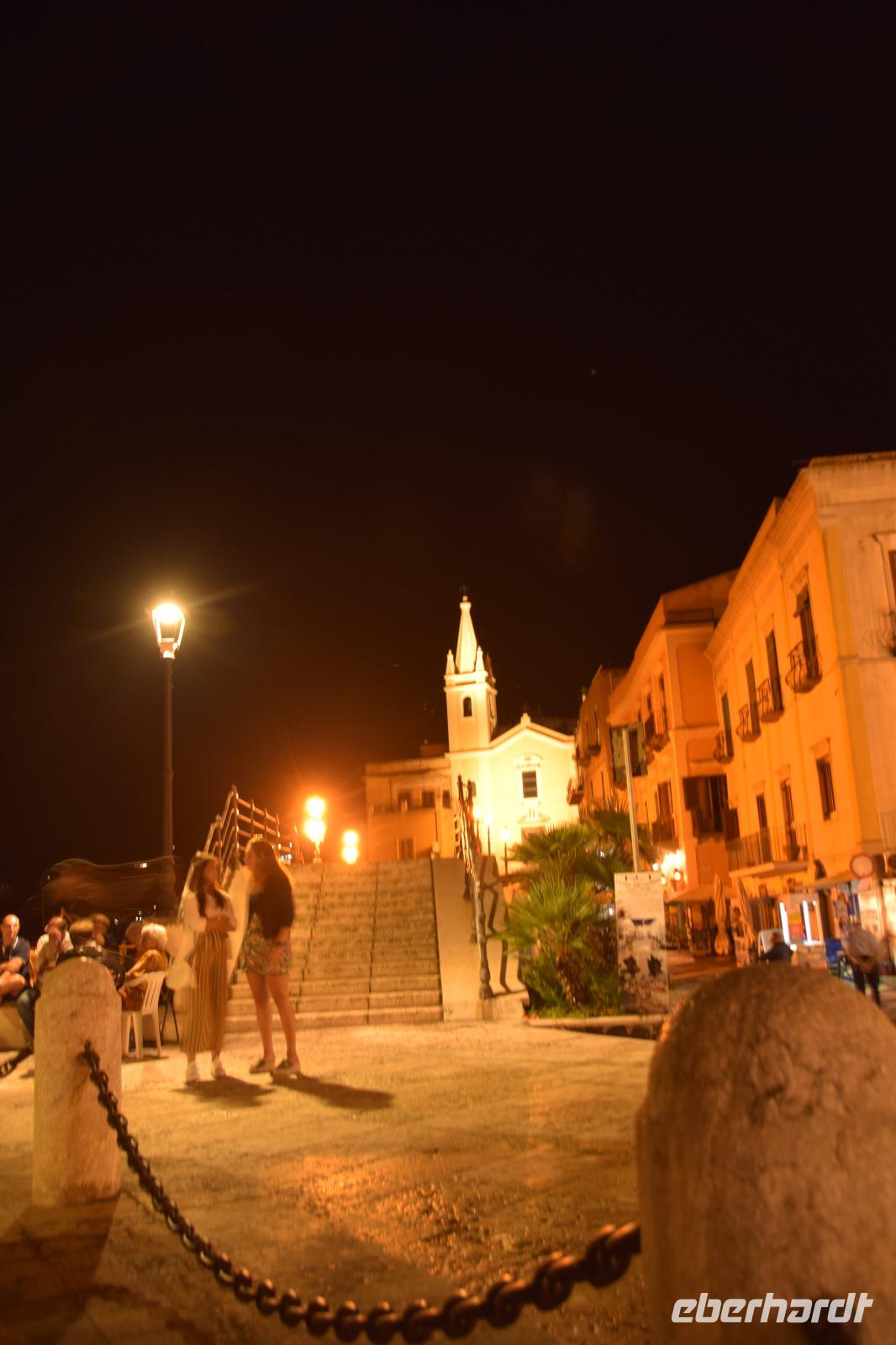 Eines der Highlights der Reise stand heute auf dem Tagesplan. Da unsere Wanderung entlang des Stromboli aber erst am Nachmittag anstand, konnten alle den Vormittag frei nutzen. Der strahlende Sonnenschein und die ruhige See lockten zu einem erfrischenden Bad. Zum Mittag trafen wir uns alle im Hotelrestaurant. Wieder waren wir, abgesehen von der Familie des Besitzers die einzigen Gäste und wurden dementsprechend kulinarisch verwöhnt. Um 16 Uhr startete dann die lang ersehnte Wanderung vom Kirchenvorplatz aus. Zuerst ein gutes Stück bergauf, bis wir etwa 400 Höhenmeter erreichten. Dann wanderten wir auf etwa einer Höhe bleibend entlang des Vulkans. Ab und zu passierten wir auch eine Schlucht. Der späte Nachmittag brachte auch viel Schatten, was das wandern noch angenehmer machte. Unser Ziel erreichten wir mit der einzigen noch begehbaren Aussichtsterrasse. Wir hatten großes Glück, denn wir waren fast die ersten dort und konnten deshalb schon so einige Eruptionen mit folgender Rauchwolke und herabfallenden Geröll in Ruhe bewundern. Je weiter der Abend voran rückte, desto voller wurde die Terrasse. Kurz nach Sonnenuntergang, welcher heute aufgrund von einigen Wolken etwas verhalten war, entschieden wir uns zu unseren Abendessen im alten Observatorium zu gehen. Hier begann das wahre Spektakel. Unser Tisch war perfekt platziert und wir konnten in etwa 10 minütigen Takt leuchtend orange-rote Eruptionen bewundern, während wir genüsslich unsere Antipasti und Pizza verspeisten. Es viel uns schwer nach einigen Stunden diesen wunderbaren Ort zu verlassen. Aber auf dem Heimweg gab es noch einen kleinen Bonus für Auge. Wir stellten uns an den Wegesrand, knipsten unsere Taschenlampen aus und genossen einen atemberaubenden Sternenhimmel. Durch die fehlende Straßenbeleuchtung ist die Lichtemission sehr gering und dadurch kann man in wolkenfreien Nächten diesen bewundern. Mit tollen Eindrücken vom Tag ging es danach direkt ins Bett.