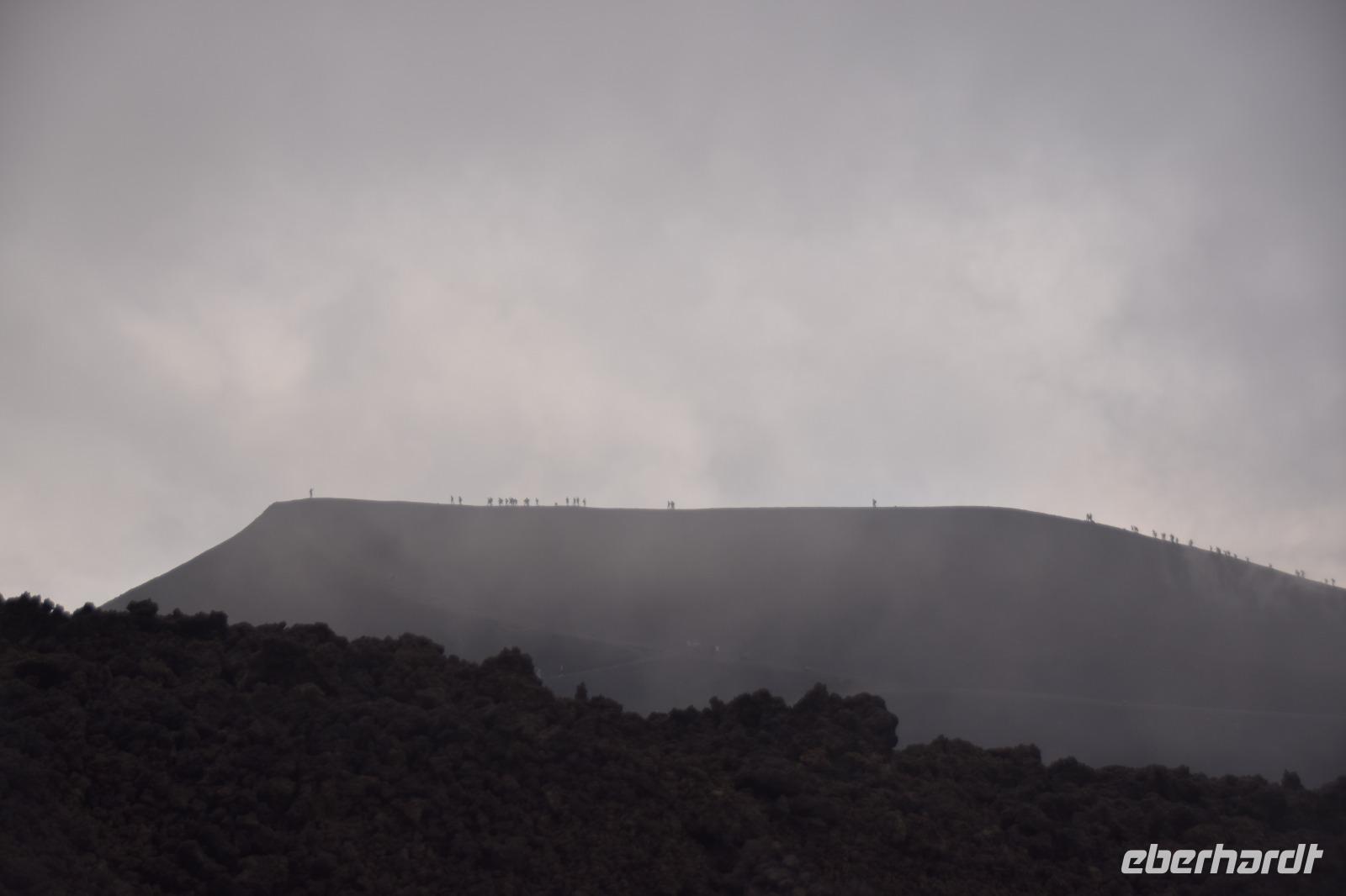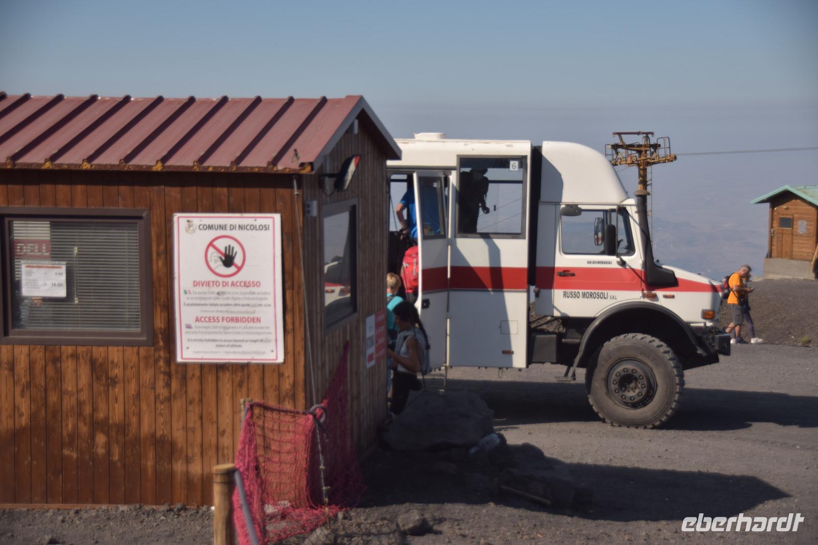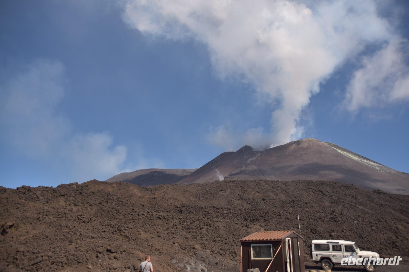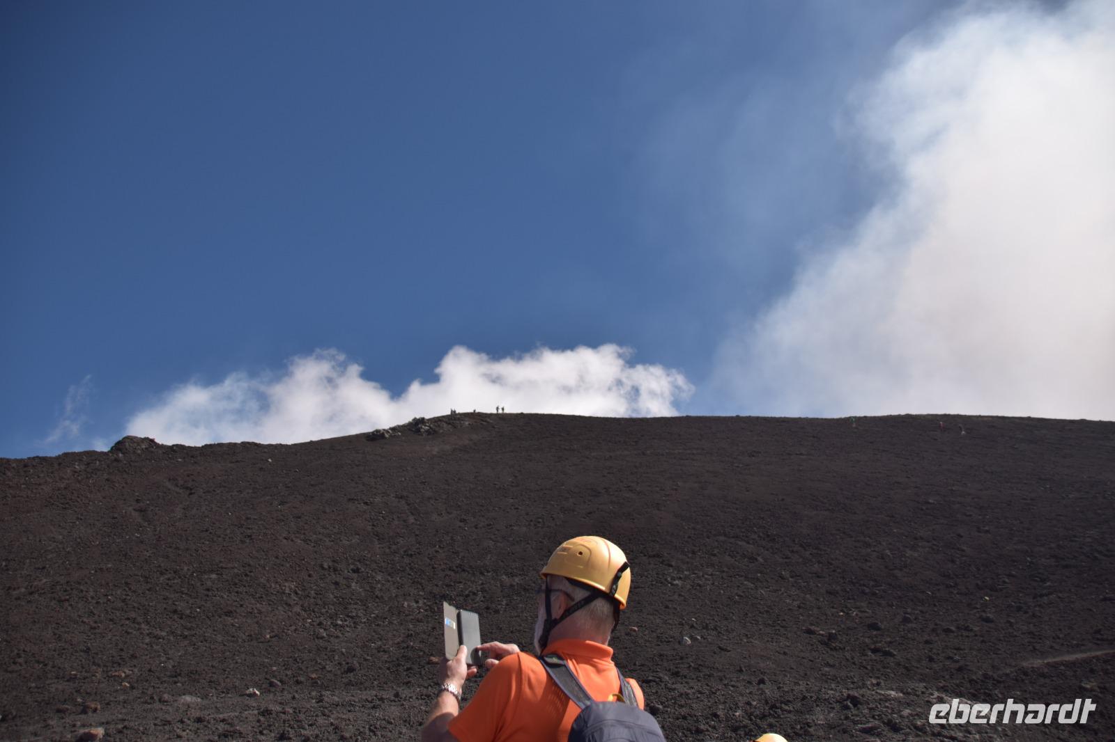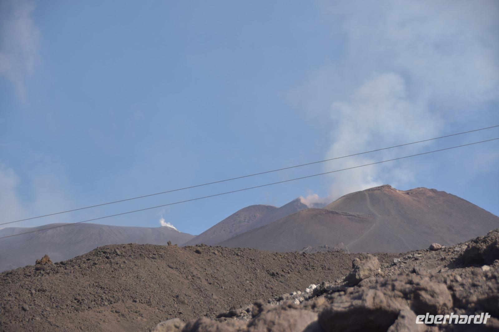 Das erste Ziel war die Talstation der Seilbahn. Hier versorgten sich alle mit einen Snack fürs Mittag und erledigten notwendige Toilettengänge. Dann ging es jeweils zu viert in der Seilbahn hoch zur Bergstation und von hier aus mit Allradfahrzeugen auf die Höhe von 2900 m. Die dünne Luft machte sich schon etwas bemerkt und von hier aus starteten wir mit unseren Bergführer Daniele zum Krater. Auf dem Weg hinauf durch die schwarze Mondlandschaft erfuhren wir einige Interessante Dinge um den Ätna und seine letzten Ausbrüche. Am Krater angekommen, zeigte sich uns ein spektakulärer Anblick. Überall rauchte und rumpelte es und der Krater war gesäumt von gelben Schwefelbändern. Nach einigen beeindruckenden Momenten machten wir uns wieder über den Schotter rutschend abwärts. Auf der Ebene bei 2900 m angekommen, legten wir unsere Pause ein und ließen uns die Panini schmecken. Danach starteten wir den letzten Teil unserer Rundwanderung zum Sammelpunkt der Allradfahrzeuge. Von da aus zur Seilbahn und mit dieser zur Talstation. Unserer Bus brachte uns wieder sicher ins Hotel, wo wir uns das Abendessen schmecken ließen.