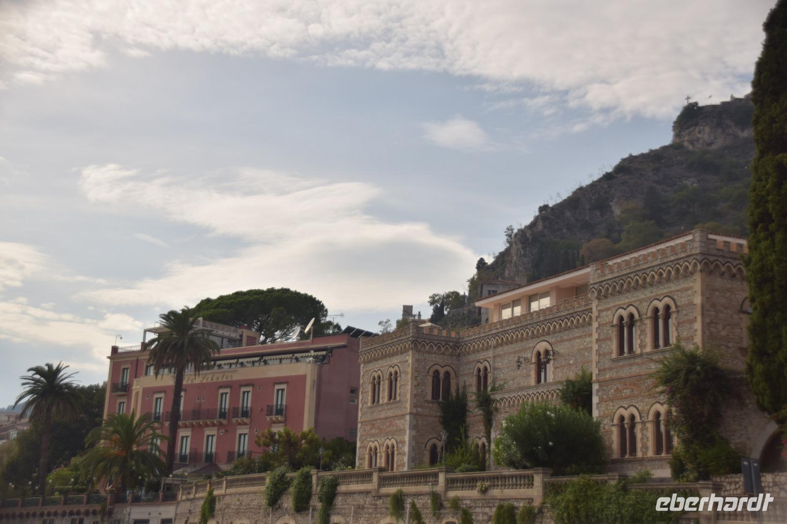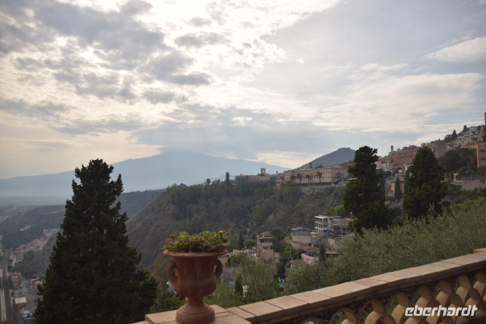 Der Transfer wartet schon und nachdem das Gepäck verladen war, ging es direkt zum Hotel in Giardini Naxos. Vorbei fahrend am mächtigen Ätna, konnten wir aufgrund von niedrig hängenden Wolken keinen Blick auf ihn werfen. Nach einer Dreiviertel Stunde Fahrt erreichten wir unsere Unterkunft für die nächsten Tage und konnten direkt einchecken. Jetzt konnte sich jeder etwas erholen und erfrischen, bevor wir einen kleinen Spaziergang durch die Straßen Giardini Naxos bis zum Strand und der Bucht machten. Trotz des trüben Wetters war dieser gut besucht und jeder aus unserer Gruppe konnte schon einmal die Füße ins warme Mittelmeer hängen. Da es langsam zu tröpfeln begann, machten wir uns auf dem Rückweg zum Hotel, mit einen kurzen Stopp im Supermarkt. Alle freuten sich auch schon auf das Abendessen, da die letzte Mahlzeit - das Frühstück - schon etwas her war. Auch hier gab es einige coronabedingte Änderungen zu beachten, dennoch schmeckte es vorzüglich. Nach einen kurzen Kennenlernrunde und einem Drink an der Bar ging es dann auch schon ins Bett, um fit für den nächsten Tag zu sein.