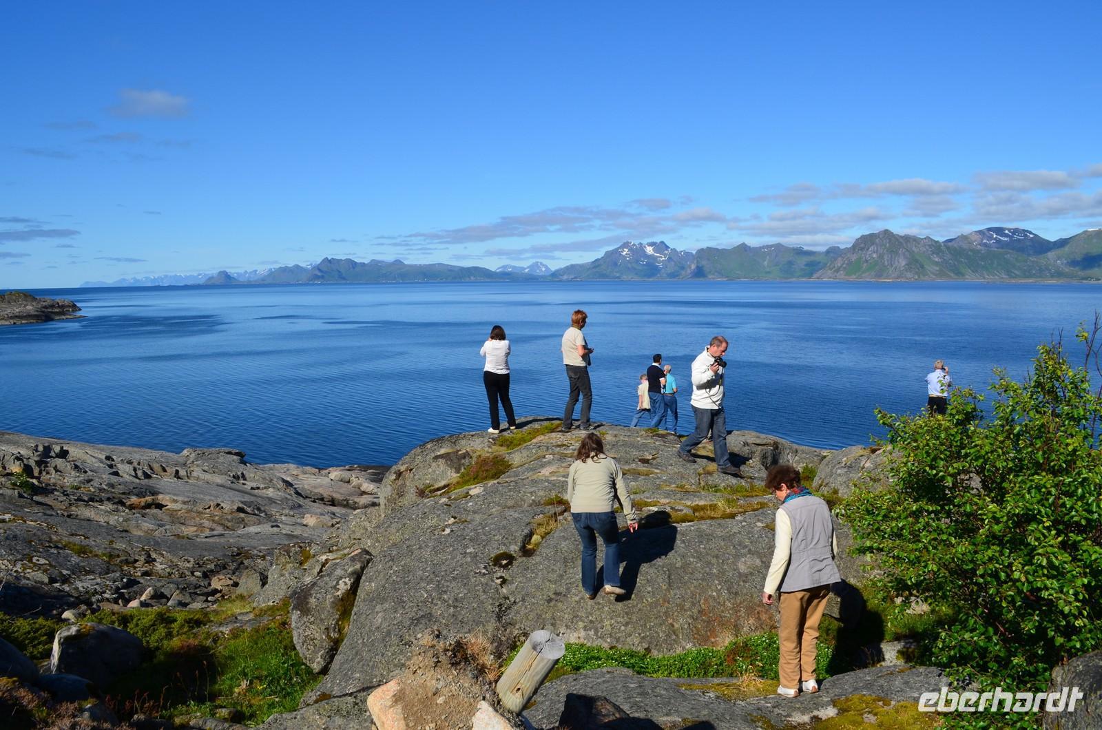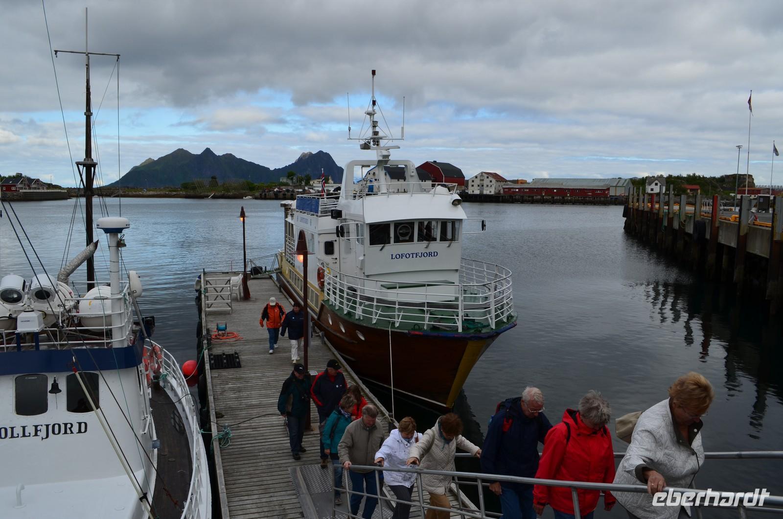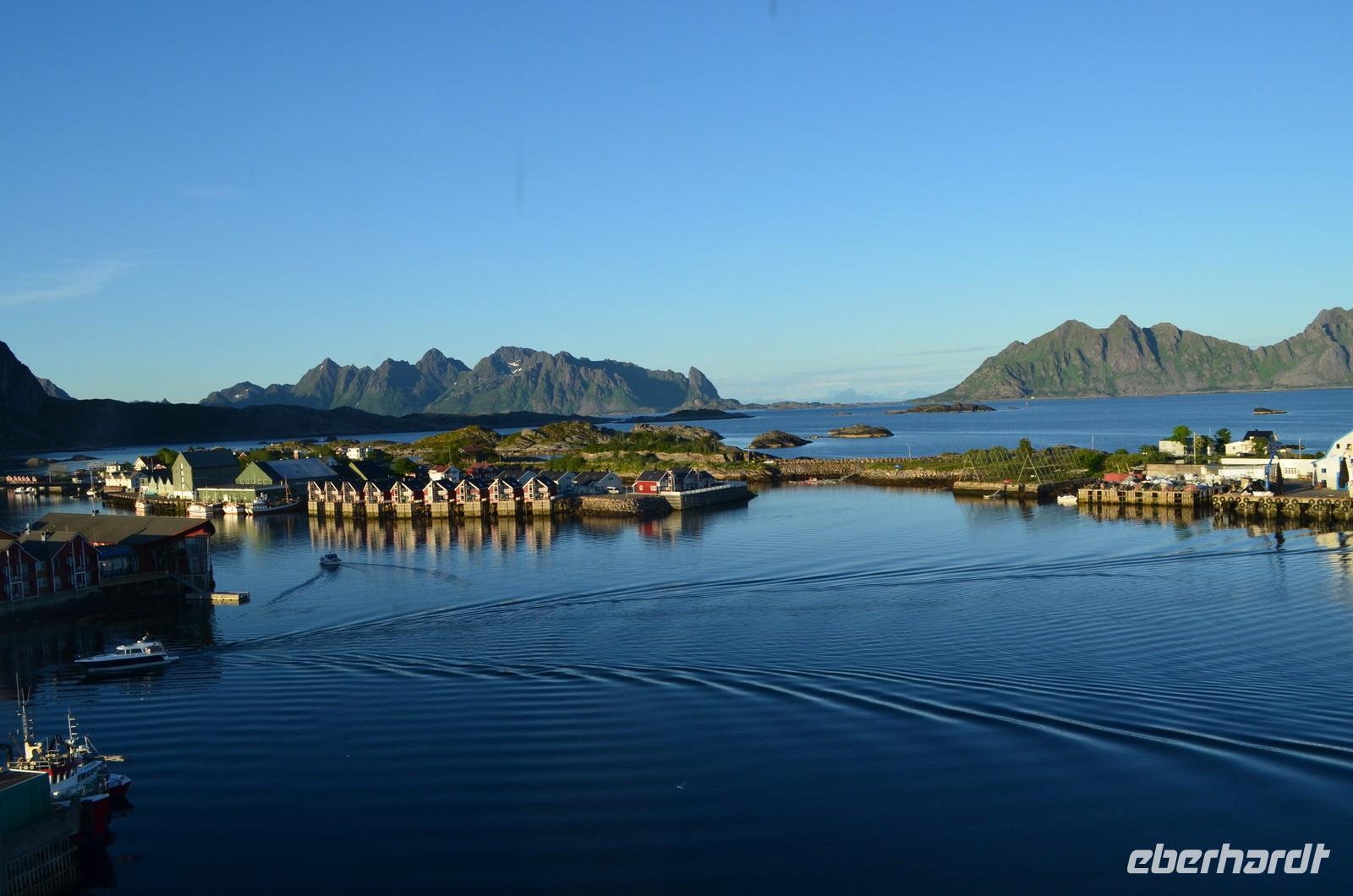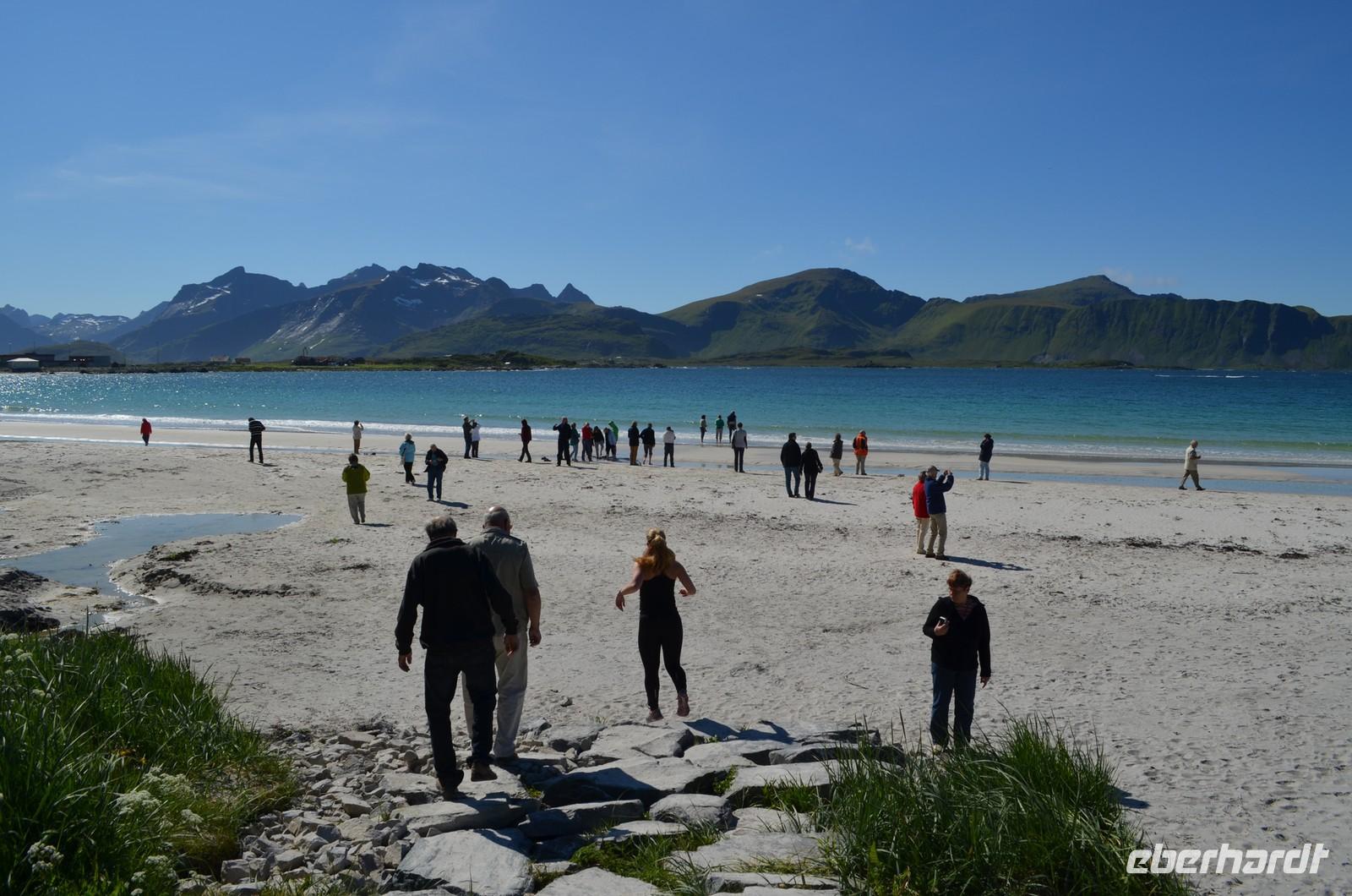 Heute starten wir zur Lofoten-Rundfahrt, erster Fotostopp ist an der Küste nach Honningsvaer, dem schönen Fischerort, den wir anschließend besuchen. Von hier geht es weiter nach Borg, natürlich nicht ohne an der tollen Aussicht davor anzuhalten. In Borg steht der Besuch des Wikinger-Museums auf unserem Programm. Die Führung beginnt mit neuem Ausstellungsteil - der Präsentation von Videos mit Erläuterungen und einem 10 Min.-Film, sowie der Ausstellung aller Fundstücke. Anschließend wird die Führung im Wikingerhaus fortgesetzt und den Abschluss bildet die Wikingersuppe - wobei alle Gäste als eberhardt-WOW je ein Glas Bier erhalten. Die Weiterfahrt führt uns über Lekness und Flakstedt bis Ramberg. Am weißen Sandstrand von Ramberg entsteht unser Gruppenfoto.