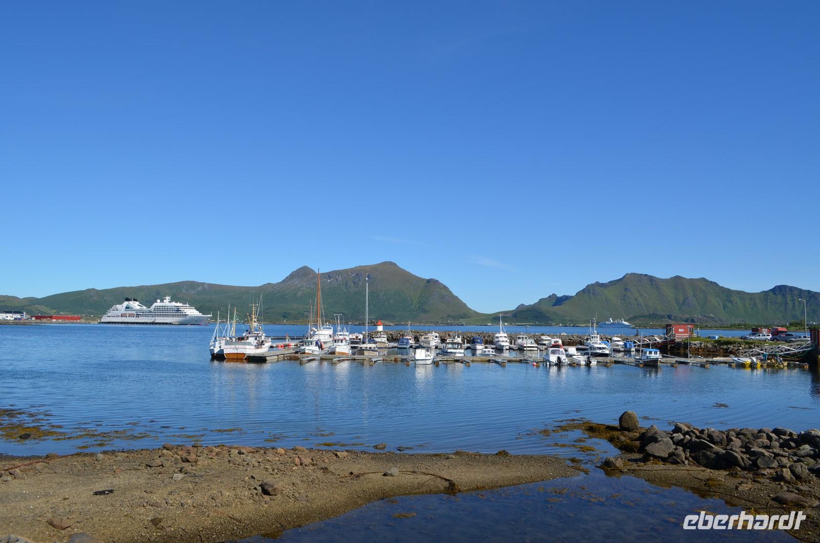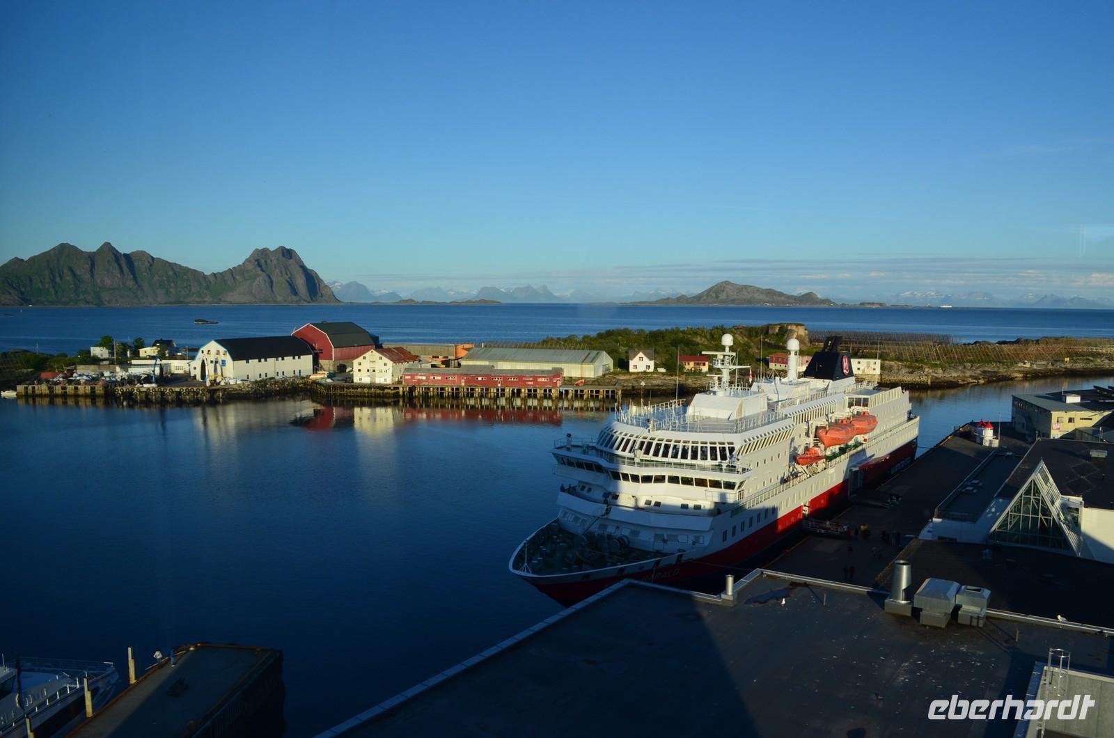 Später können wir das Einlaufen des Hurtigrutenschiffes in den Hafen beobachten und unser Abendessen genießen.