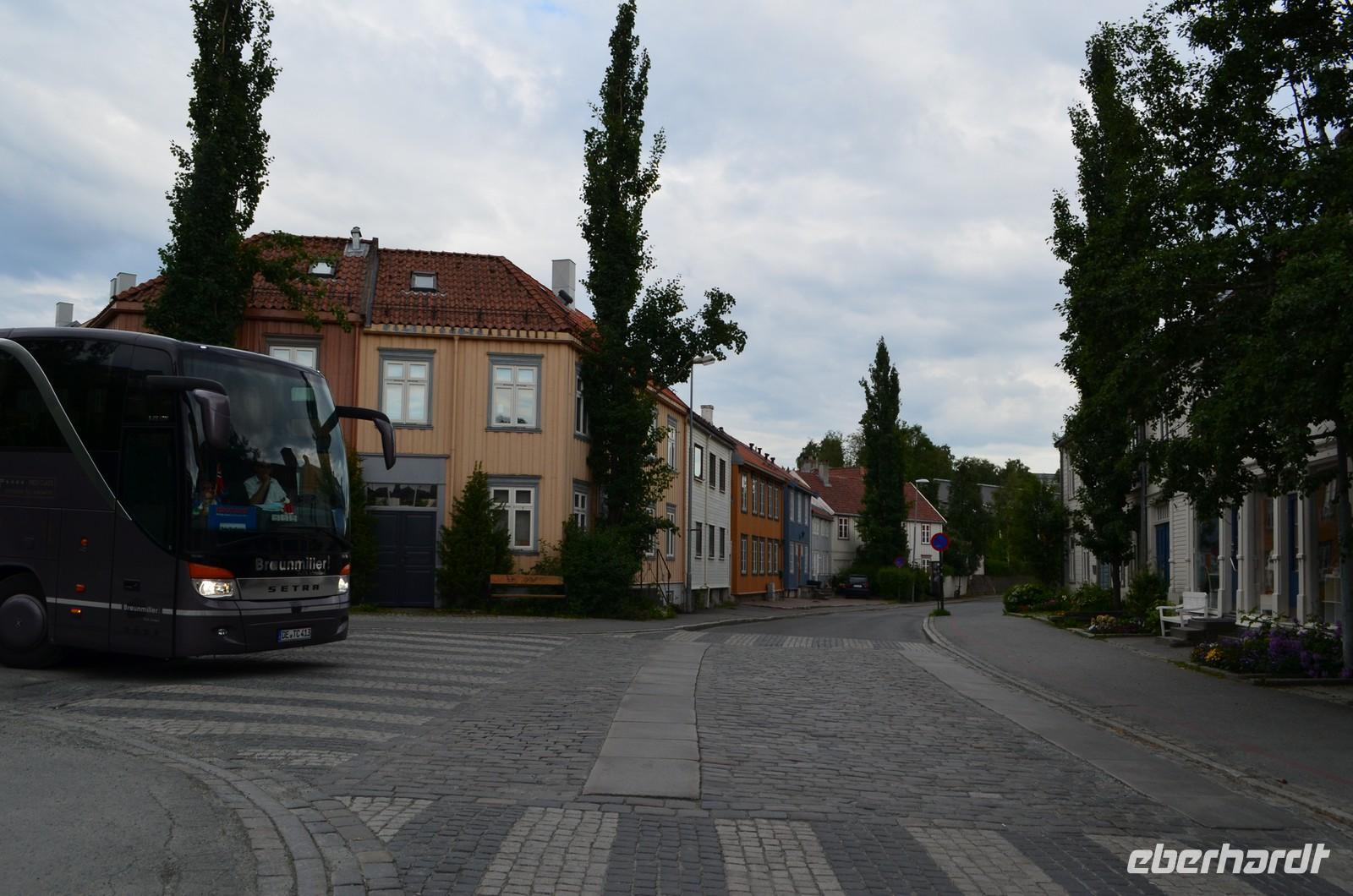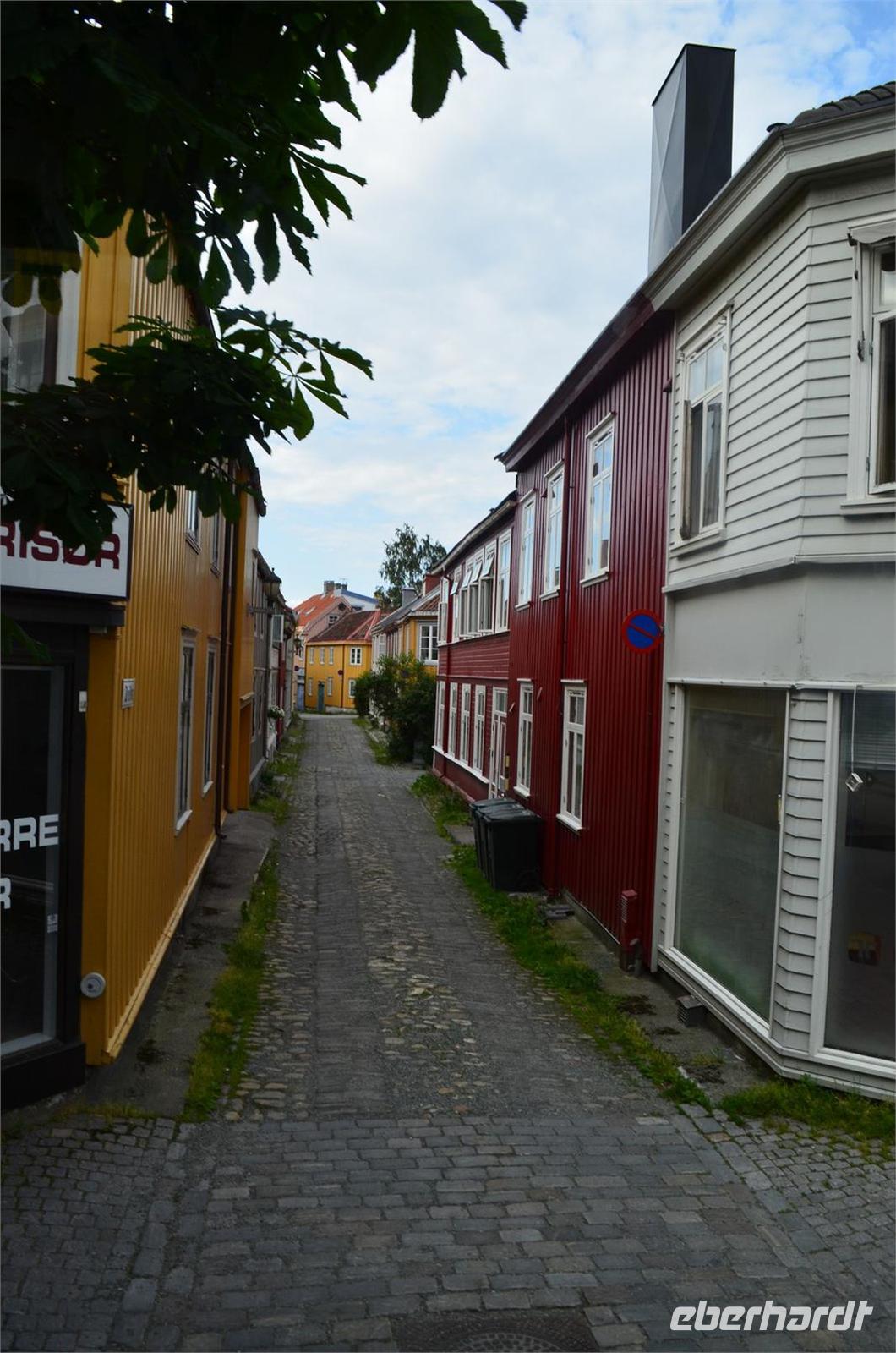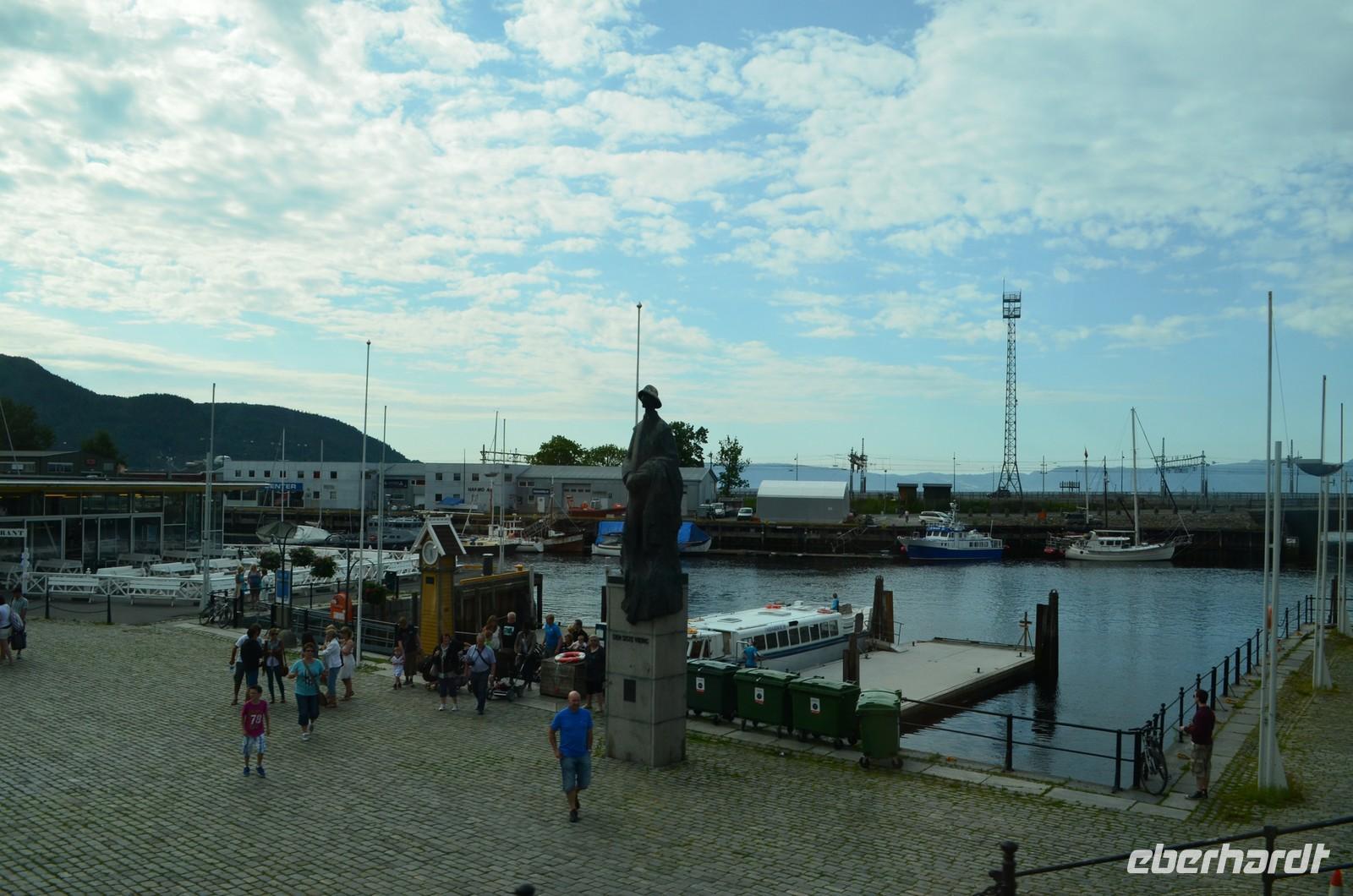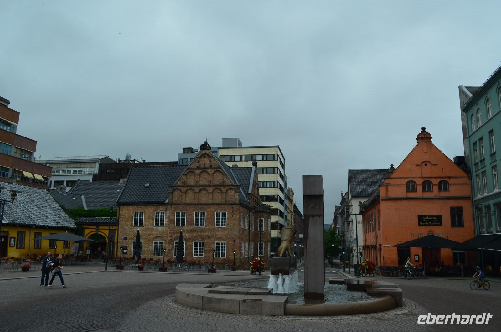 Am nächsten Morgen ist es regnerisch, trotzdem unternehmen wir nach dem Kofferladen einen kleinen Stadtrundgang durch die Straßen mit den historischen Holzhäusern, dem Dom, dem Amundsen-Denkmal und dem Hafen.