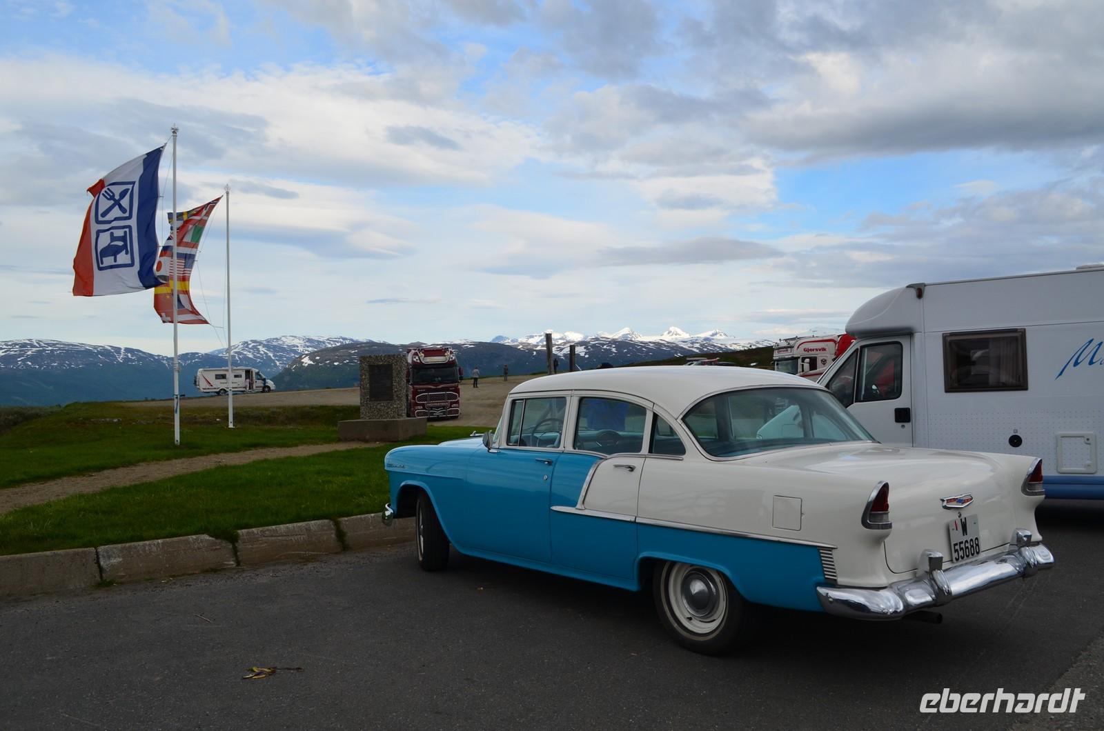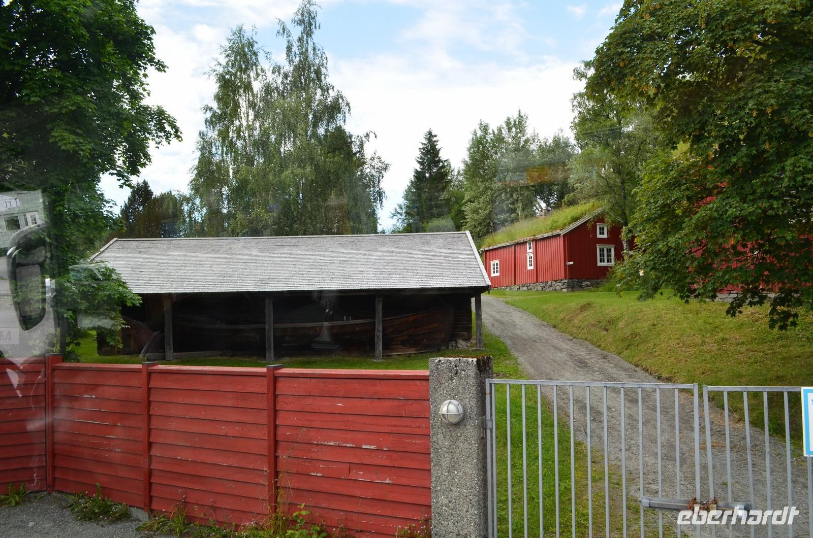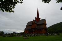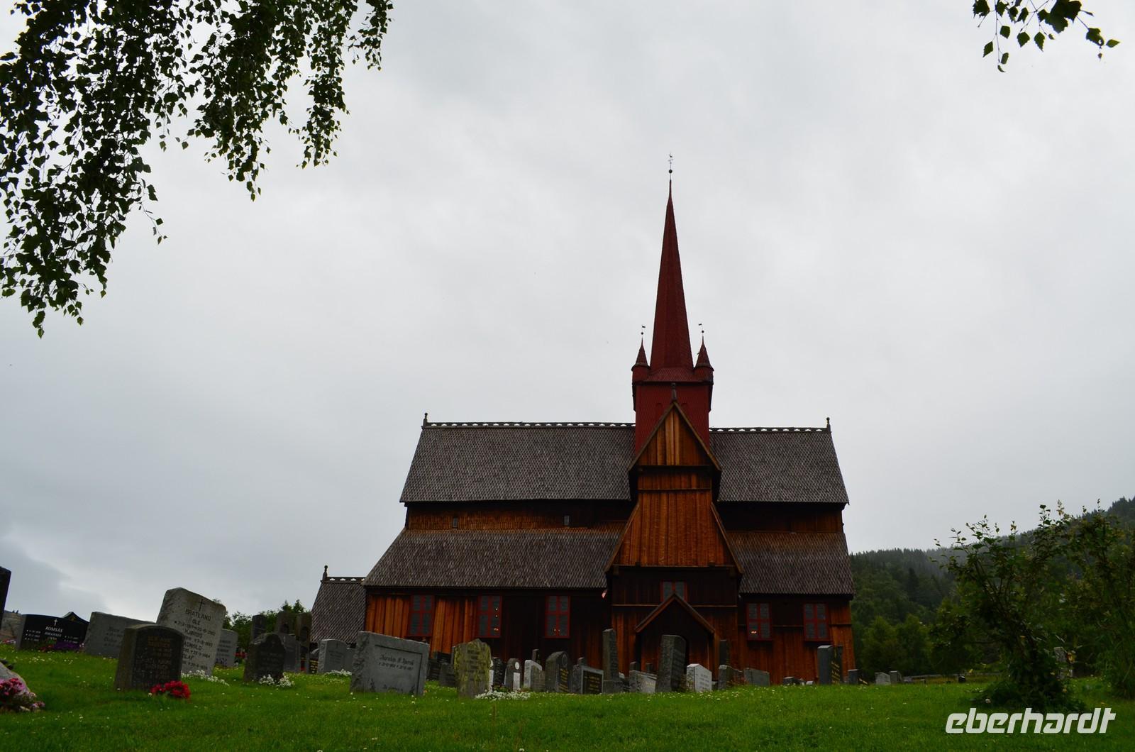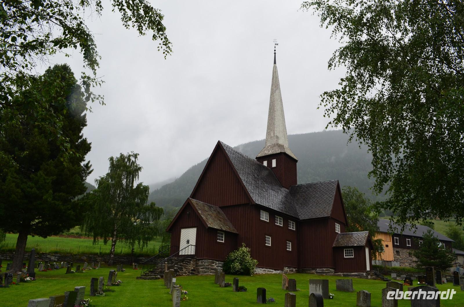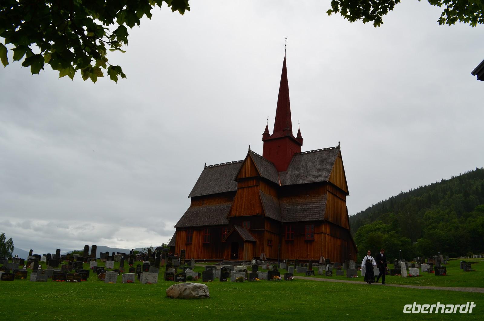 An der Stabkirche Ringebu halten wir zur Besichtigung, aber leider ist sie gerade wegen einer Hochzeit geschlossen. Dafür können wir Norwegerinnen und Norweger in ihrer Tracht fotografieren. Danach fahren wir zur ehemaligen Stabkirche Favang, die zu einer Kreuzkirche umgebaut wurde, aber leider ist auch sie verschlossen.