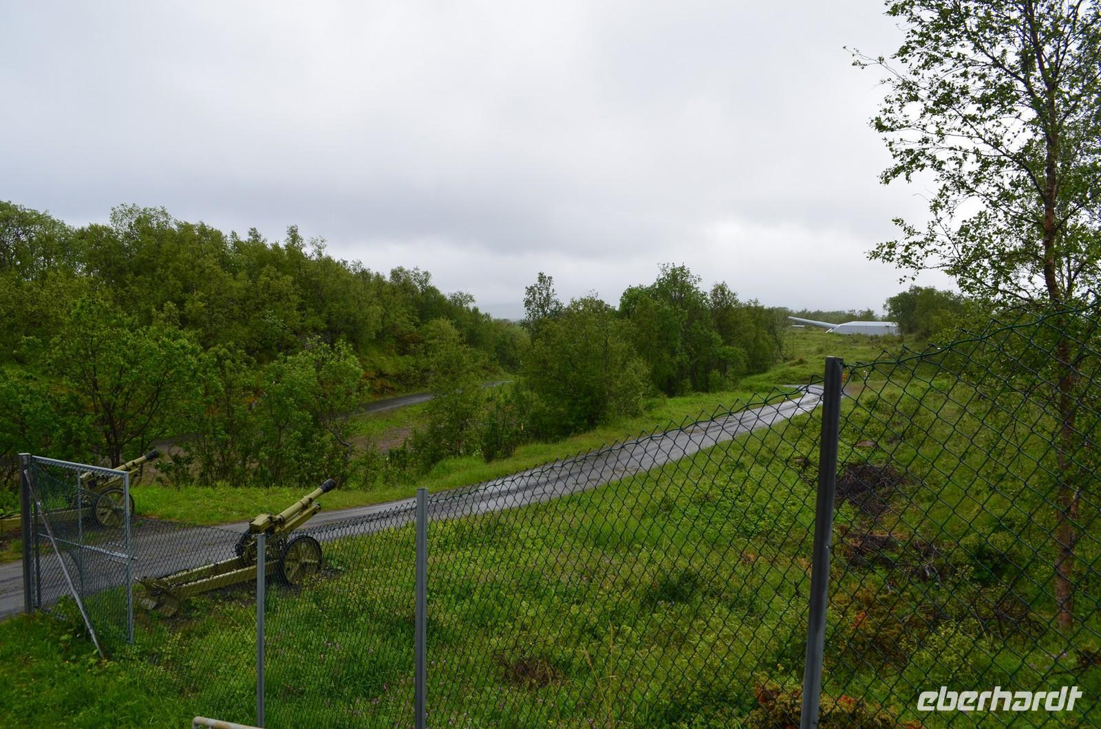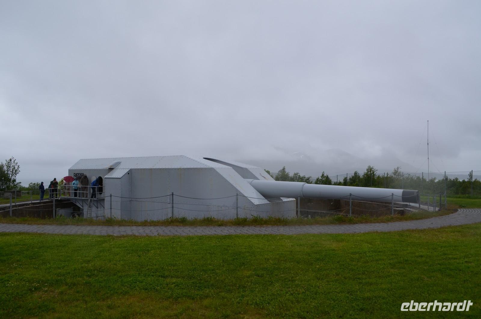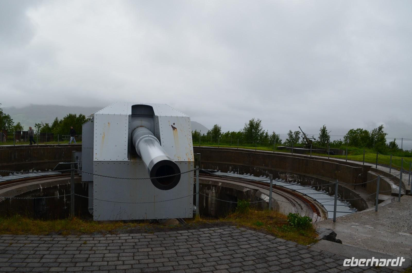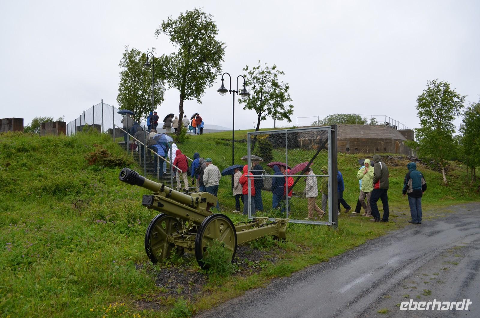Die Weiterfahrt führt uns bis zum Rasthof vor der Brücke am Beginn des Königs Olaf Weges in Steinsand. Von hier ab geht es auf die Inselwelt der Vesteralen, nach Harstad. Am Thon Hotel Harstad starten wir 17 Uhr zur Stadtrundfahrt als weiteres eberhardt-WOW. Mit der lustigen Stadtführerin Sigrid bestaunen wir die Sehenswürdigkeiten von Harstad, auch wenn es jetzt sehr regnerisch ist und die Sicht entsprechend schlecht. Die eingeschlossene Besichtigung und Führung durch die Adolfkanone ist trotzdem ein besonderes Erlebnis und hochinteressant.