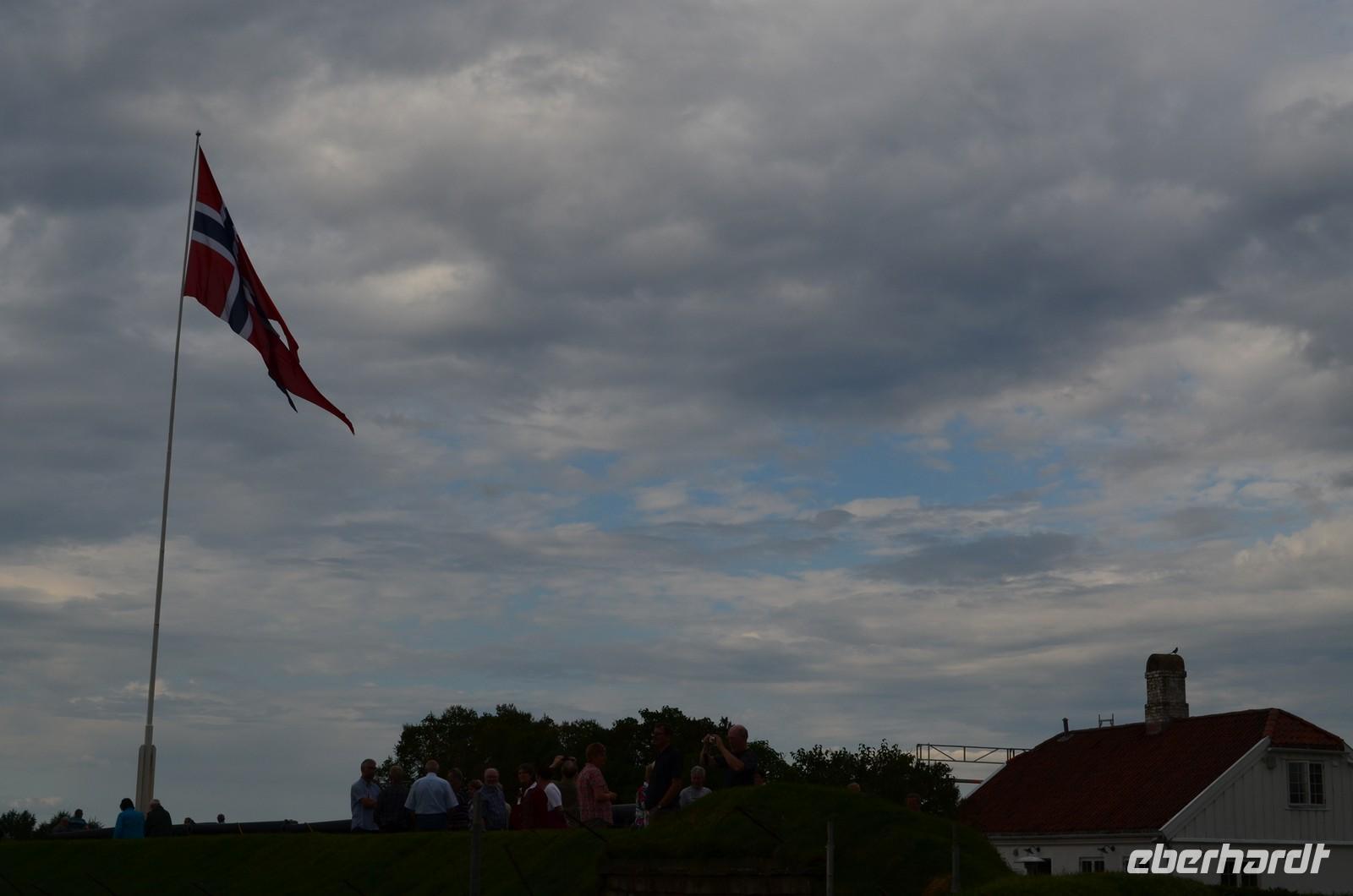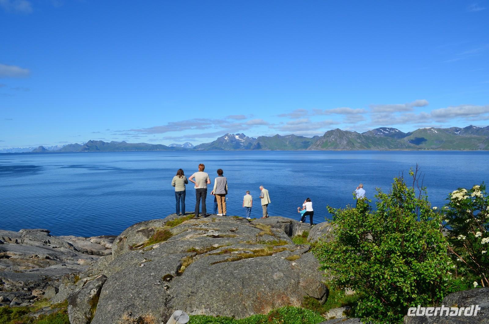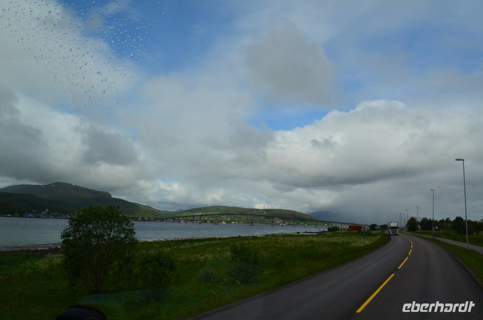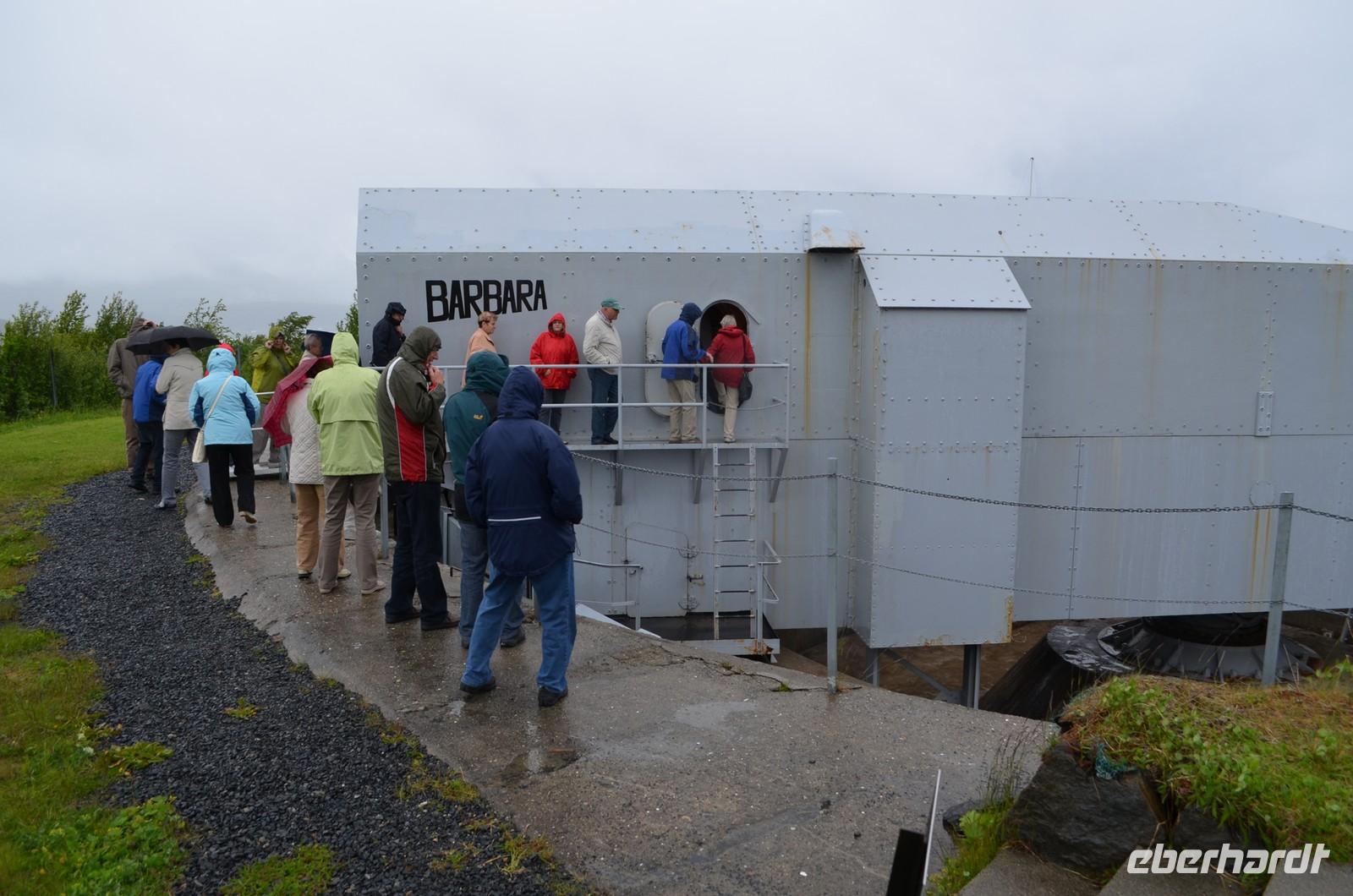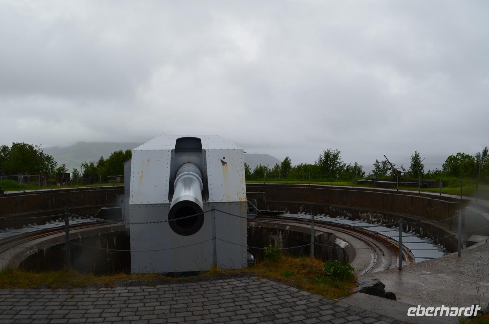 Die Weiterfahrt führt uns bis zum Rasthof vor der Brücke am Beginn des Königs Olaf Weges in Steinsand. Von hier ab geht es auf die Inselwelt der Vesteralen, nach Harstad. Am Thon Hotel Harstad starten wir 17 Uhr zur Stadtrundfahrt als weiteres eberhardt-WOW. Mit der lustigen Stadtführerin Sigrid bestaunen wir die Sehenswürdigkeiten von Harstad, auch wenn es jetzt sehr regnerisch ist und die Sicht entsprechend schlecht. Die eingeschlossene Besichtigung und Führung durch die Adolfkanone ist trotzdem ein besonderes Erlebnis und hochinteressant.
