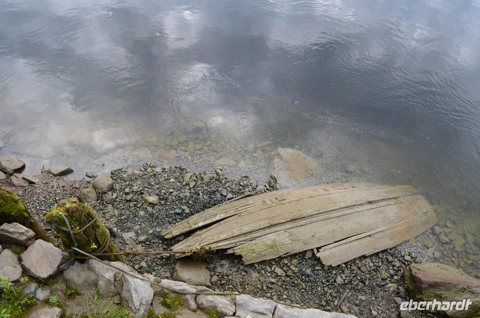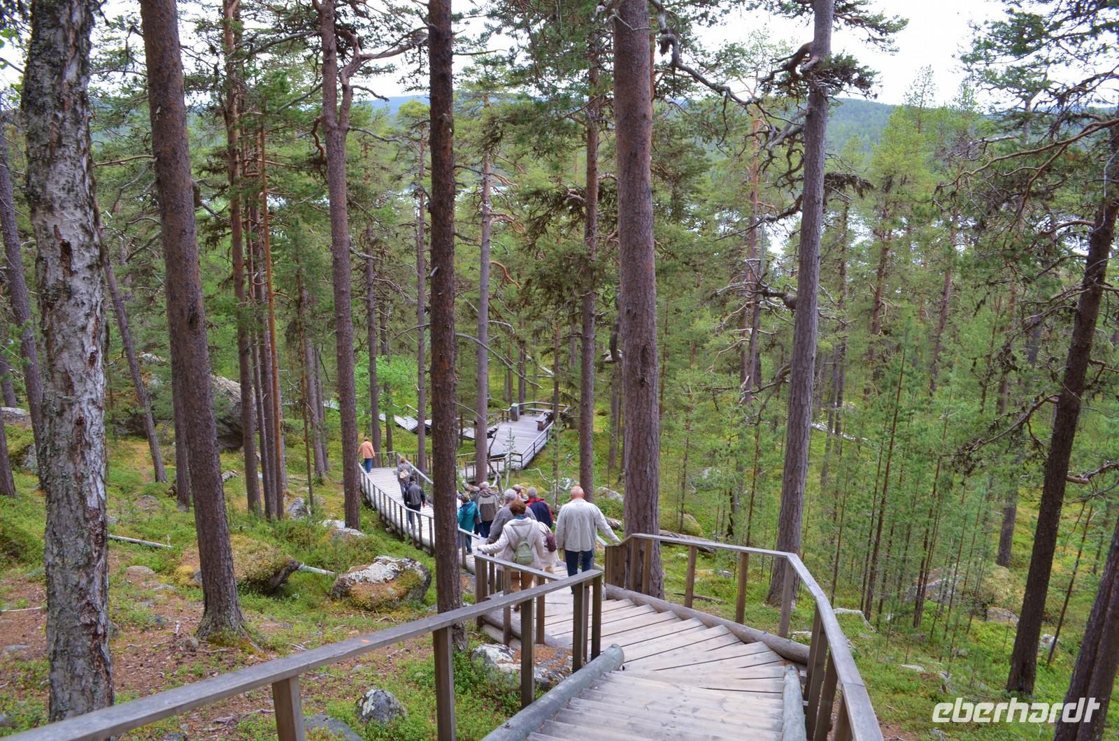 Am nächsten Morgen zur Abwechslung etwas Regen, wir fahren von den Bergen hinab Richtung Inari-See, machen in Sariselskö am Siula-Info- und Einkaufszentrum einen ersten Stopp, begegnen der Kultur der Sami und fahren danach weiter zur Bärenhöhle am Inari-See. Gemeinsam wandern wir den Aufstieg zur Höhle hinauf und weiter zum Aussichtspunkt.