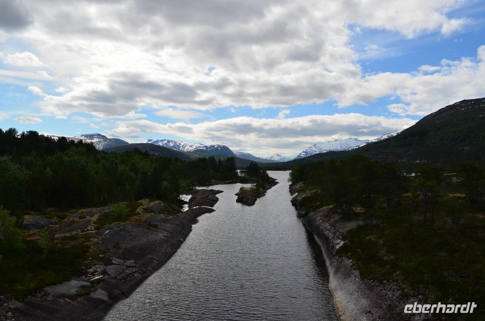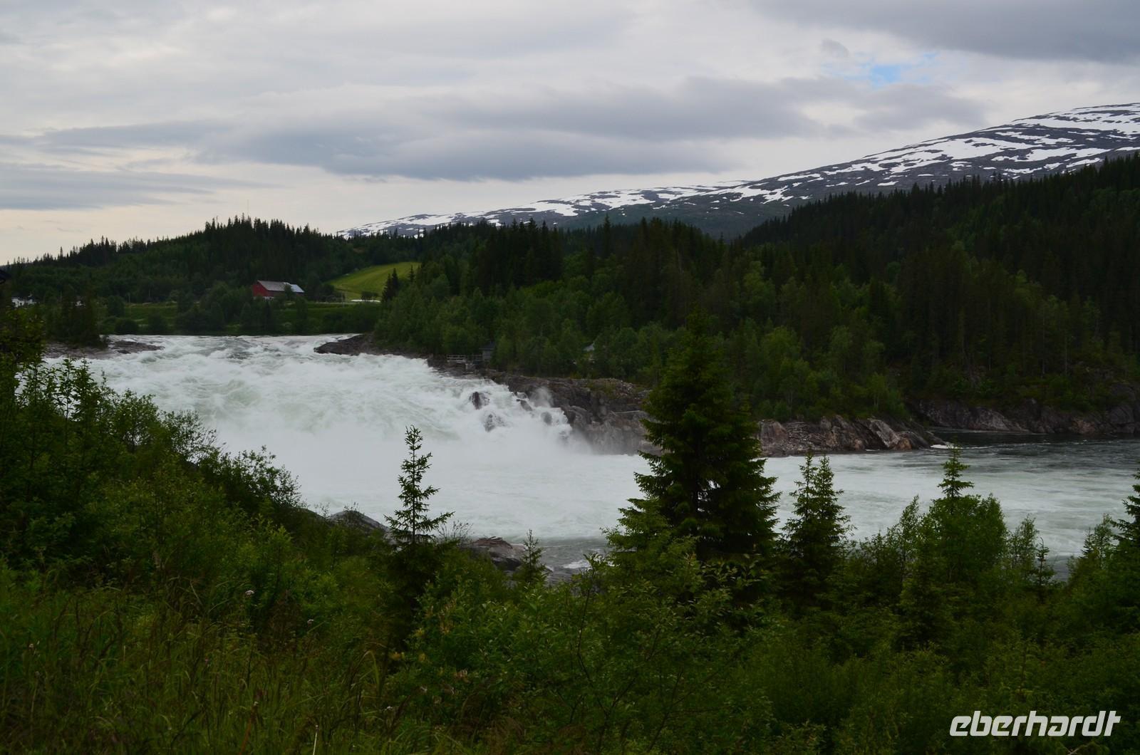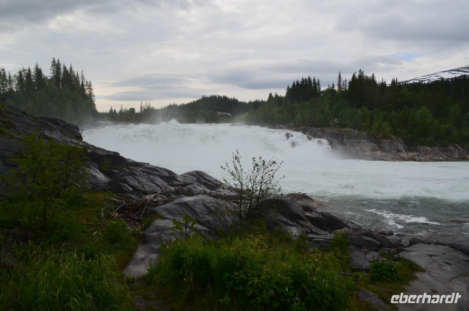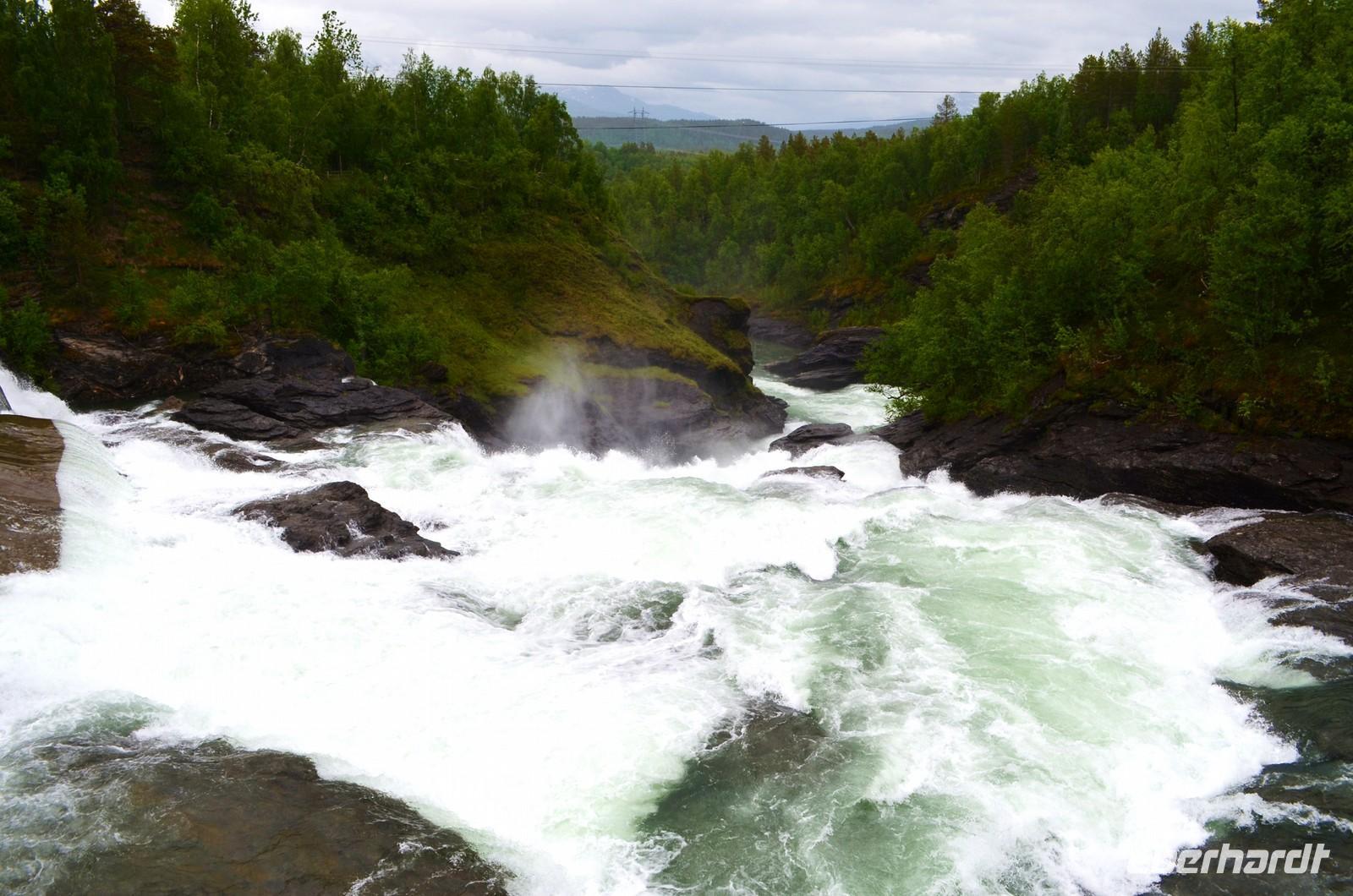 Von Mosjøen fahren wir vorbei am Laksfoss Wasserfall Richtung Trondheim.