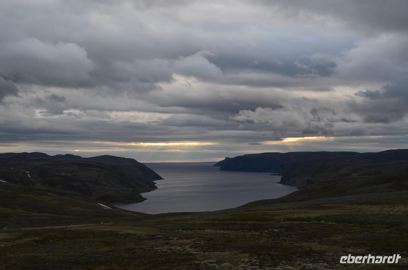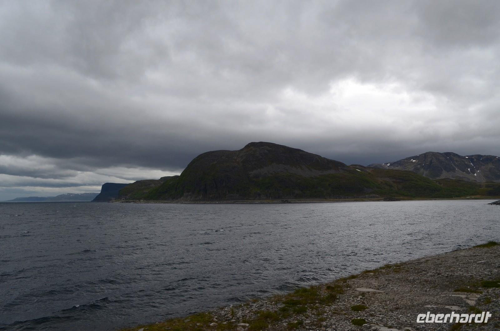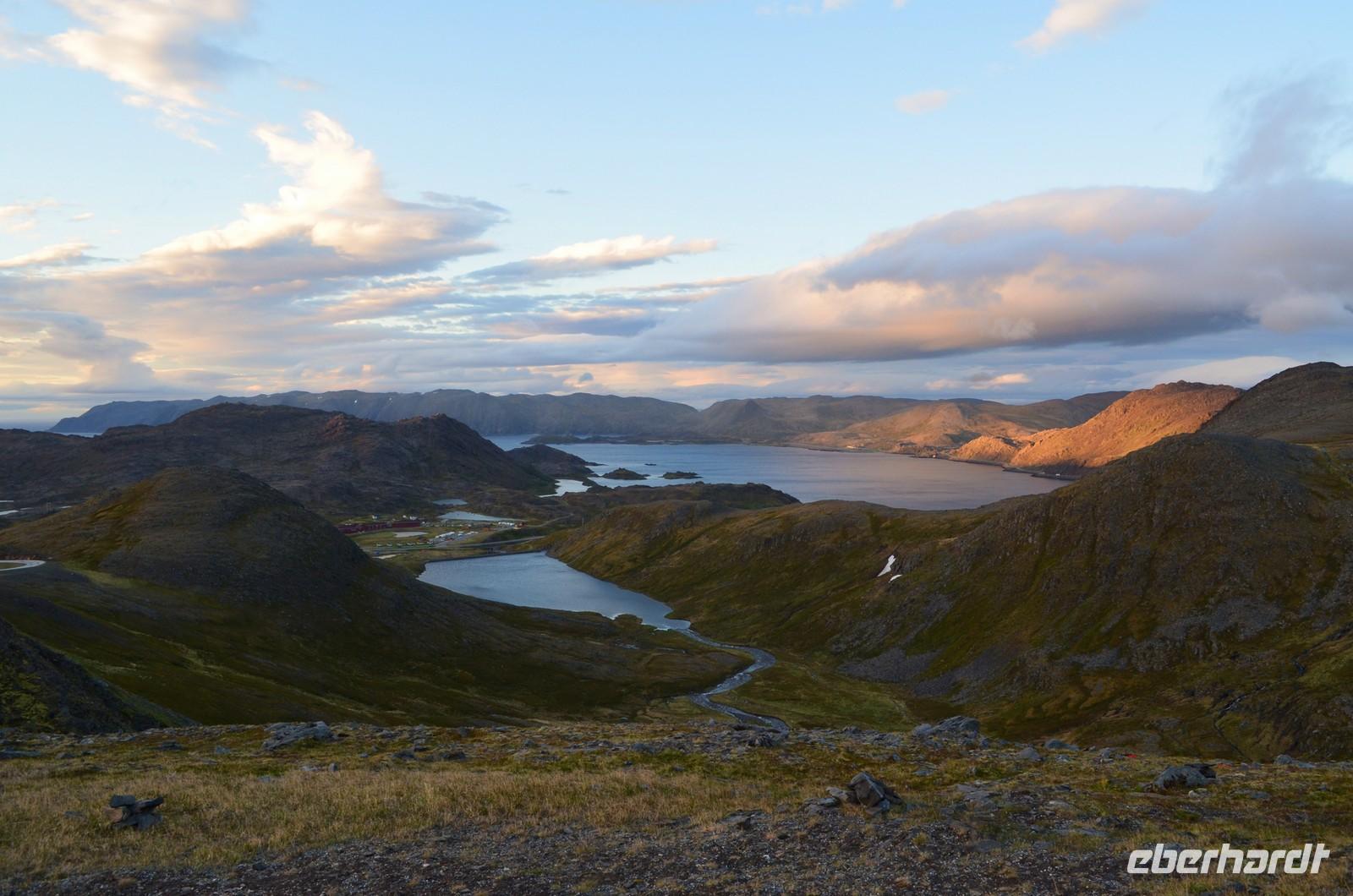 Von hier ab werden die Berge höher, sind noch verschneit und die Tundraflächen dazwischen erstrahlen in den Farben des Frühlings. In Lakselv treffen wir auf den rings von Bergen umgebenen Porsangerfjord. Die Sonne strahlt wieder.