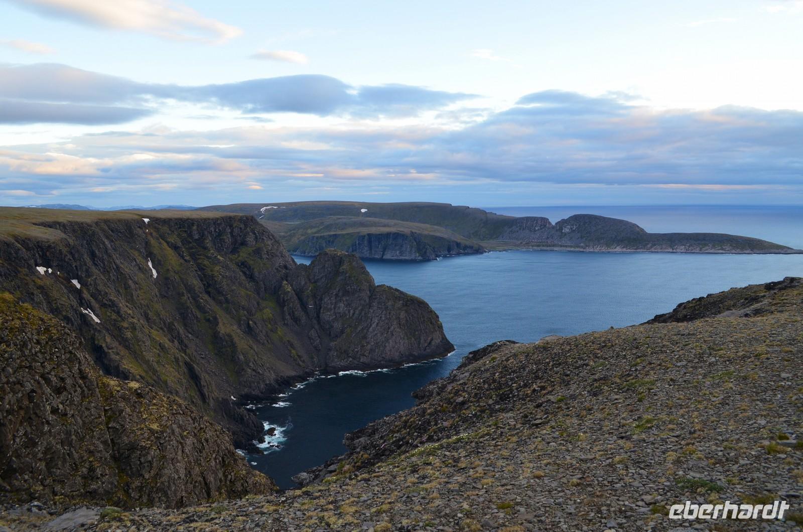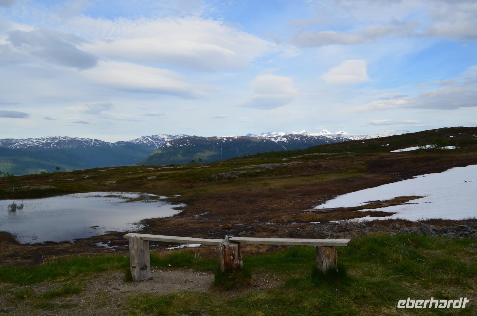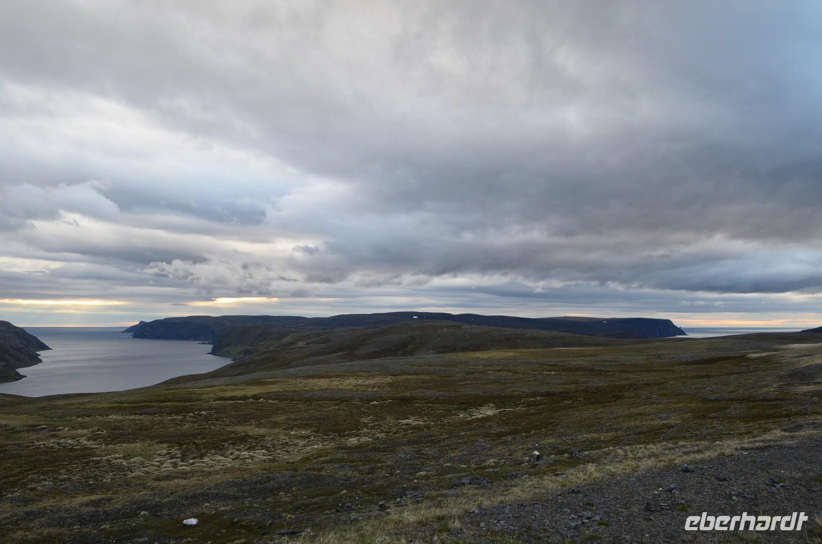 Von hier ab werden die Berge höher, sind noch verschneit und die Tundraflächen dazwischen erstrahlen in den Farben des Frühlings. In Lakselv treffen wir auf den rings von Bergen umgebenen Porsangerfjord. Die Sonne strahlt wieder.