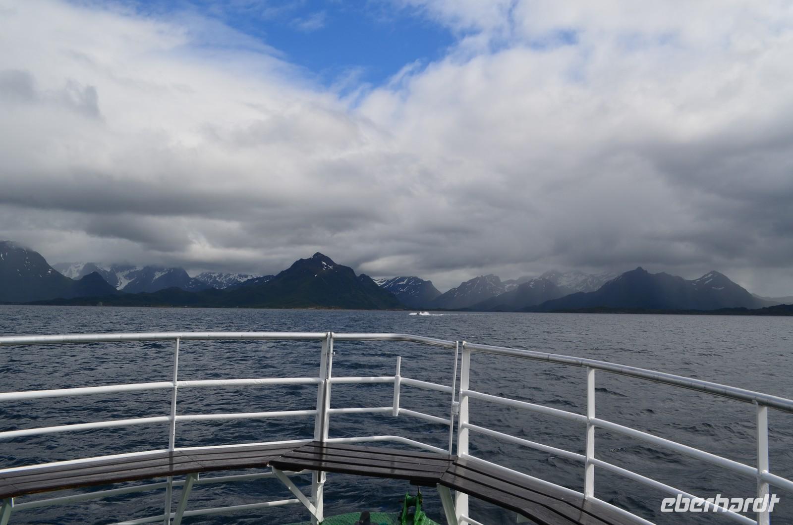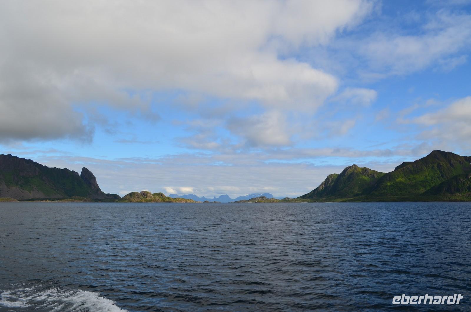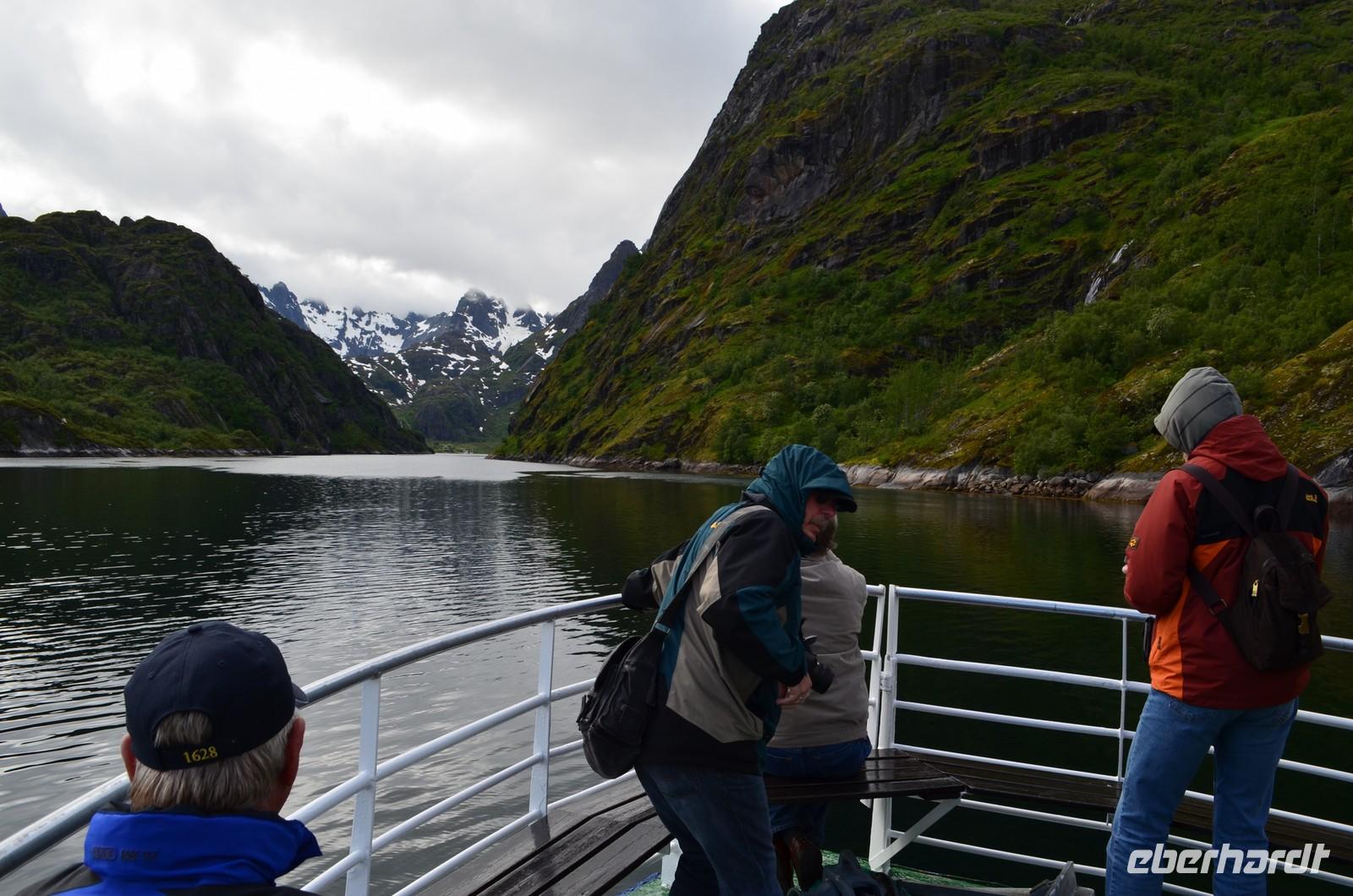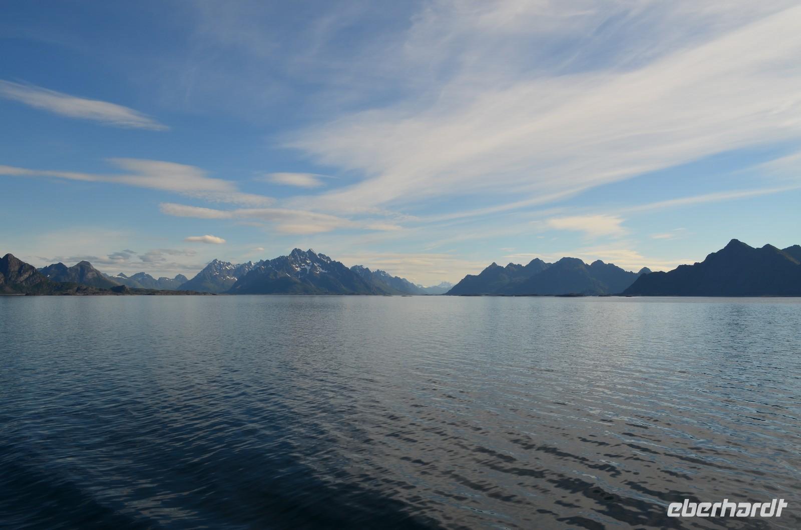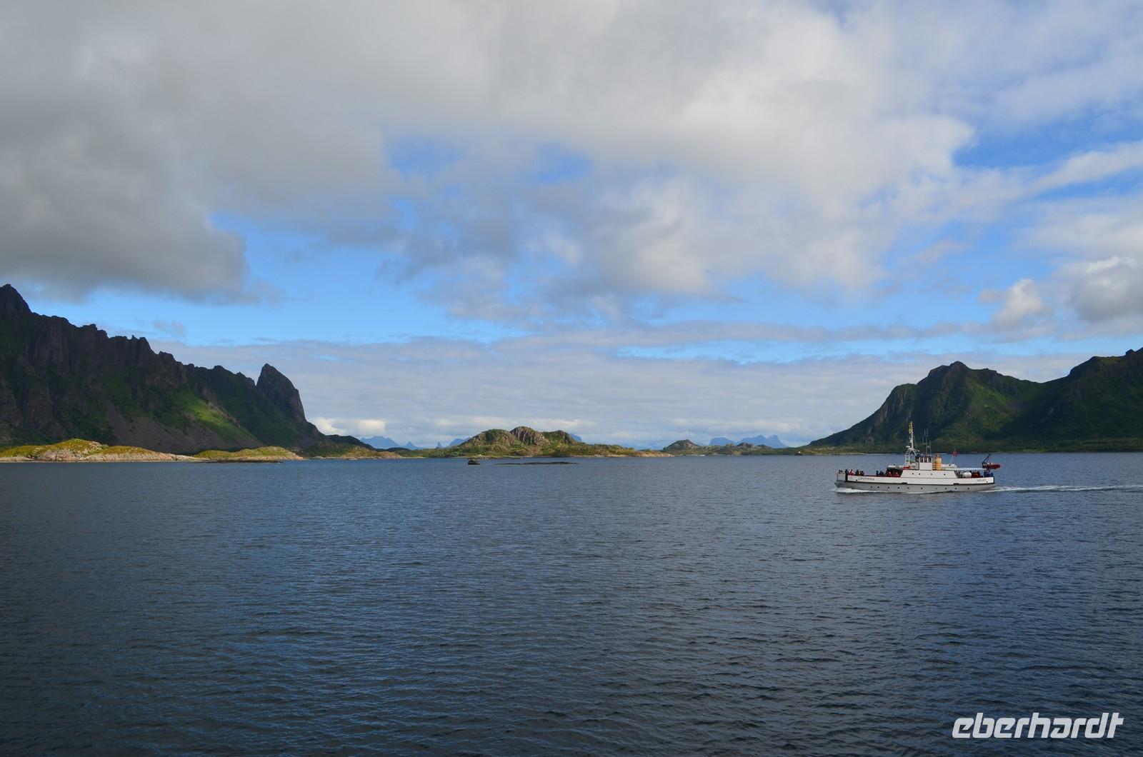 Danach treffen wir uns zum gemeinsamen Boarding unseres Charterschiffes. Das schöne Wetter hat uns wieder eingeholt und unser Kapitän legt ab zu einer tollen Panoramafahrt von den Vesteralen zu den Lofoten - durch den Raftsund, den Schwarzsund und den Trollfjord bis Svolvaer. Es gibt kostenfrei Tee und Kaffee an Bord und die herrlichen Aus- und Ansichten, das Spiel der Farben und des Lichtes sind phantastisch.