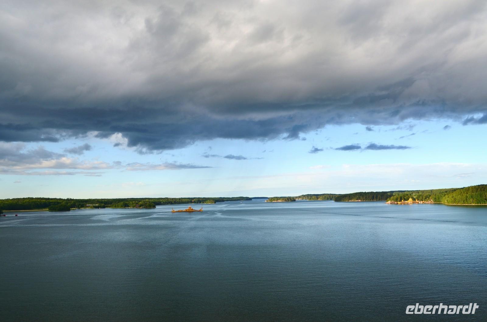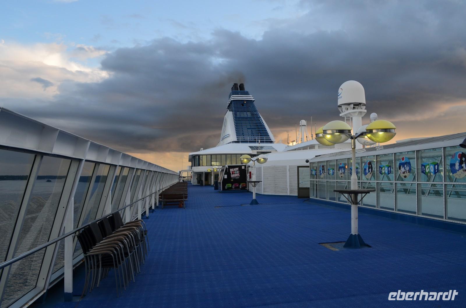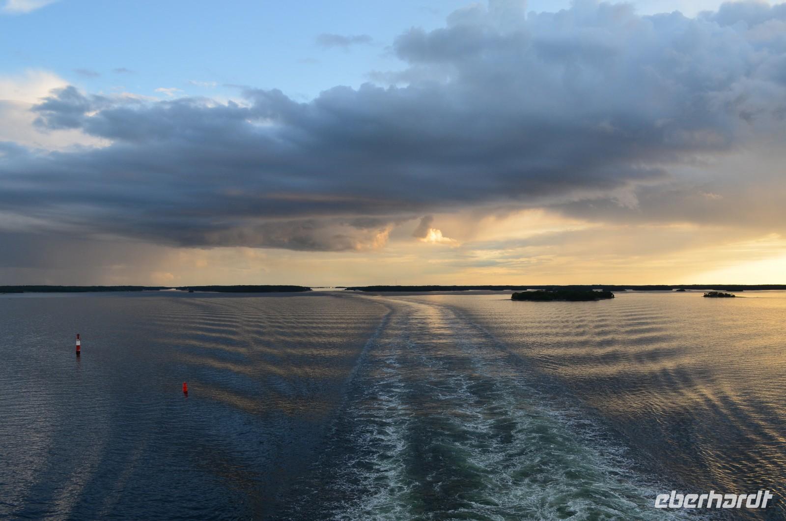 Ein neuer Tag, wir sind noch auf dem Botnischen Meerbusen. Die Sonne strahlt bei unserem ersten Spaziergang an Deck, während des Frühstücks an Bord und bei der Hafeneinfahrt in Helsinki.
