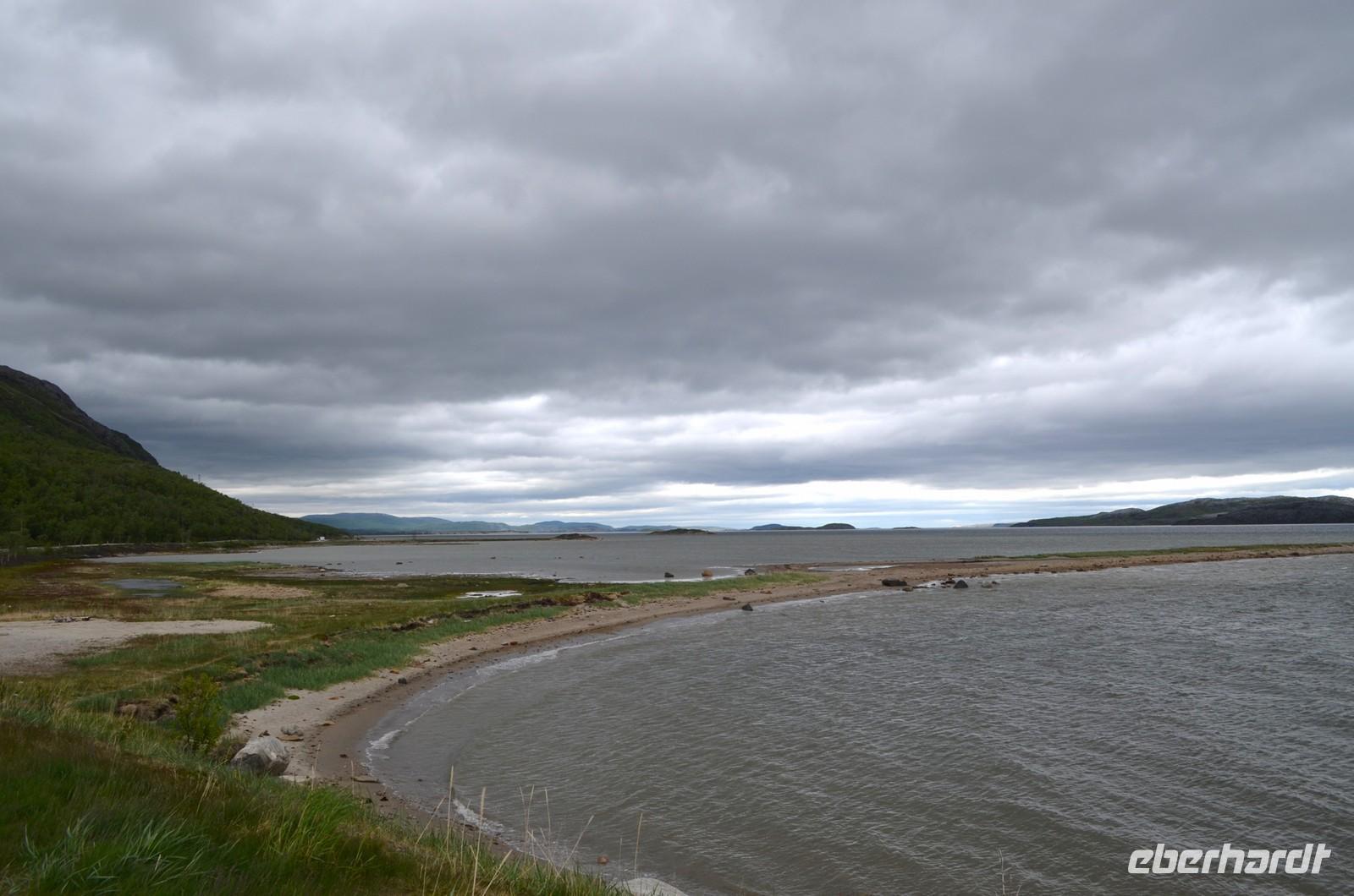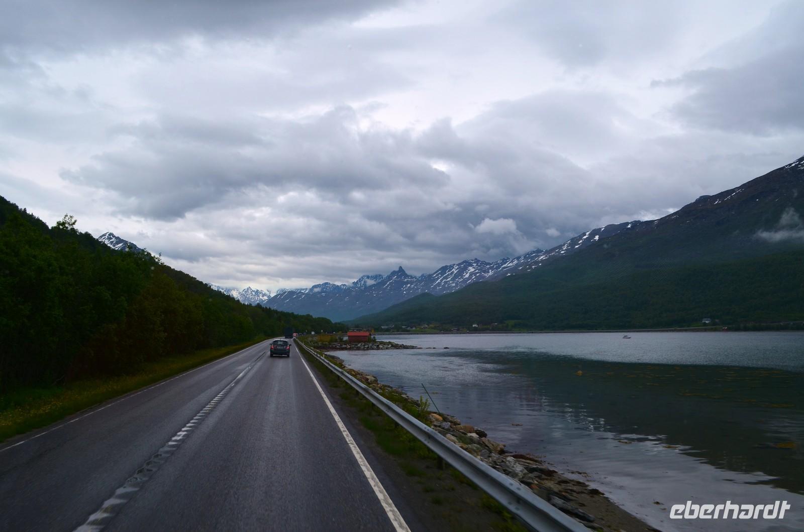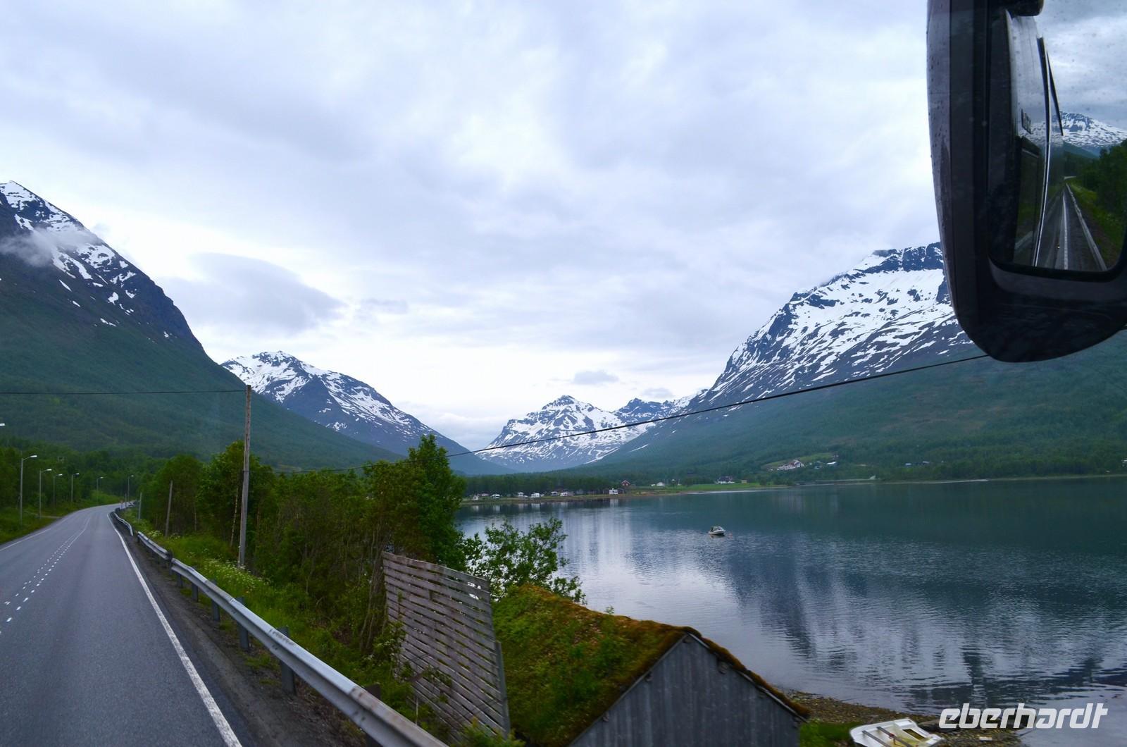 Von jetzt ab geht die Fahrt an seinen Ufern entlang, mit Fotostopp am Fischereibetrieb nach Olderfjord, wo wir Trockenfischgerüste im Foto festhalten.