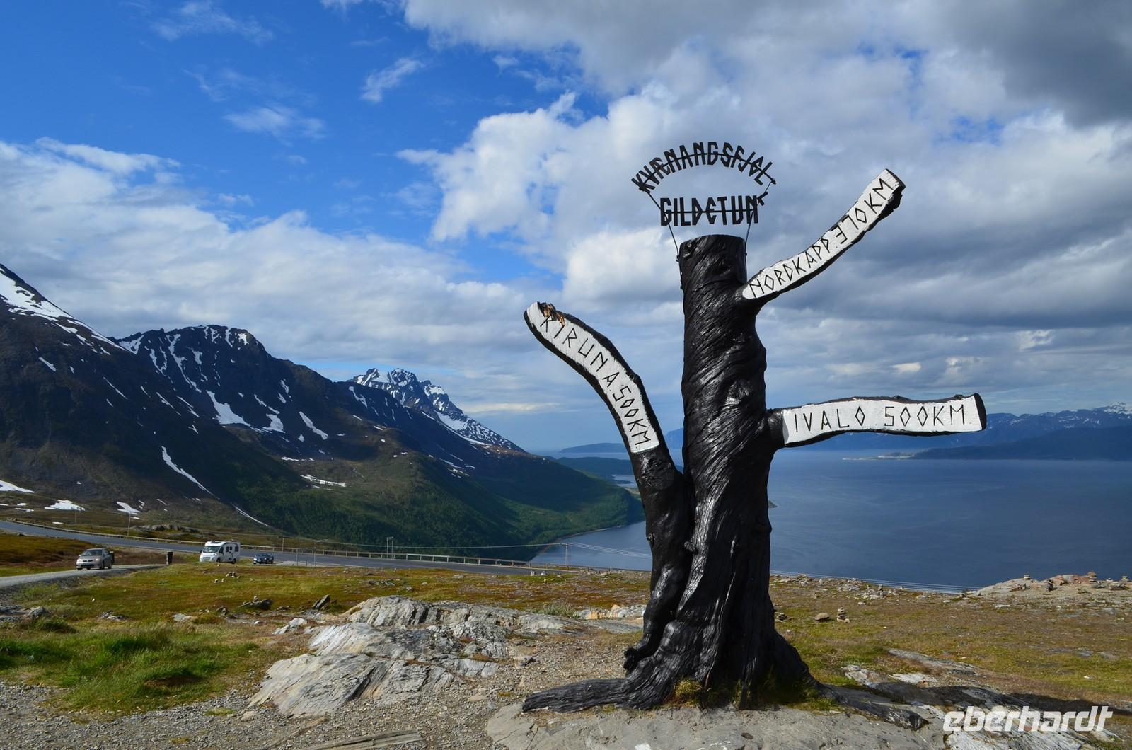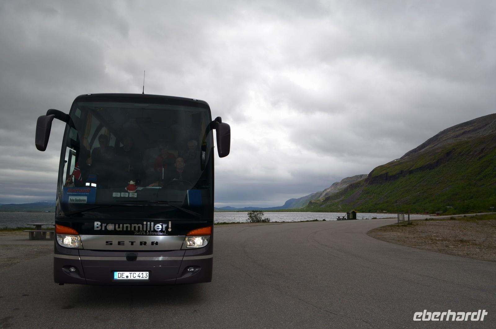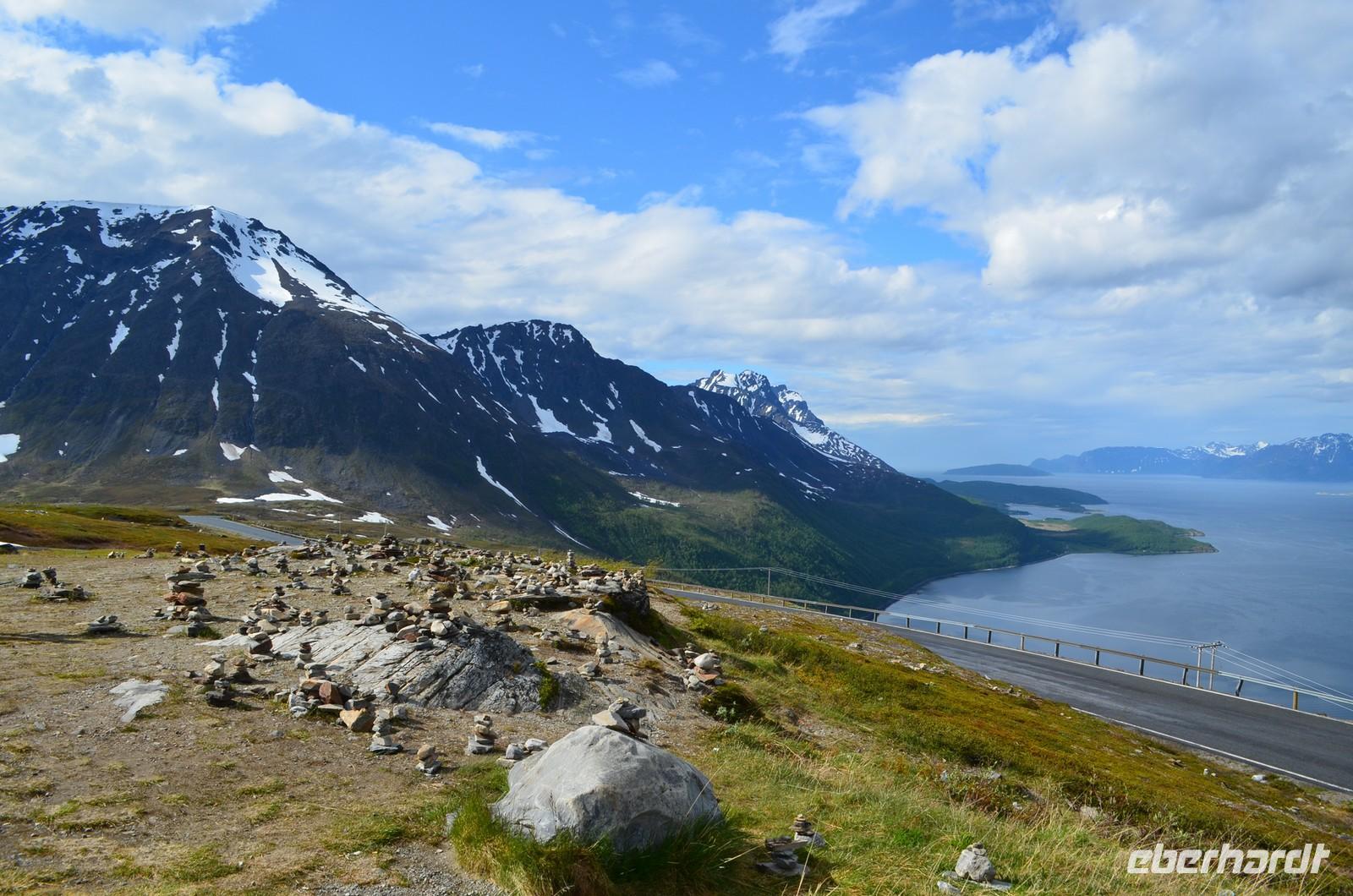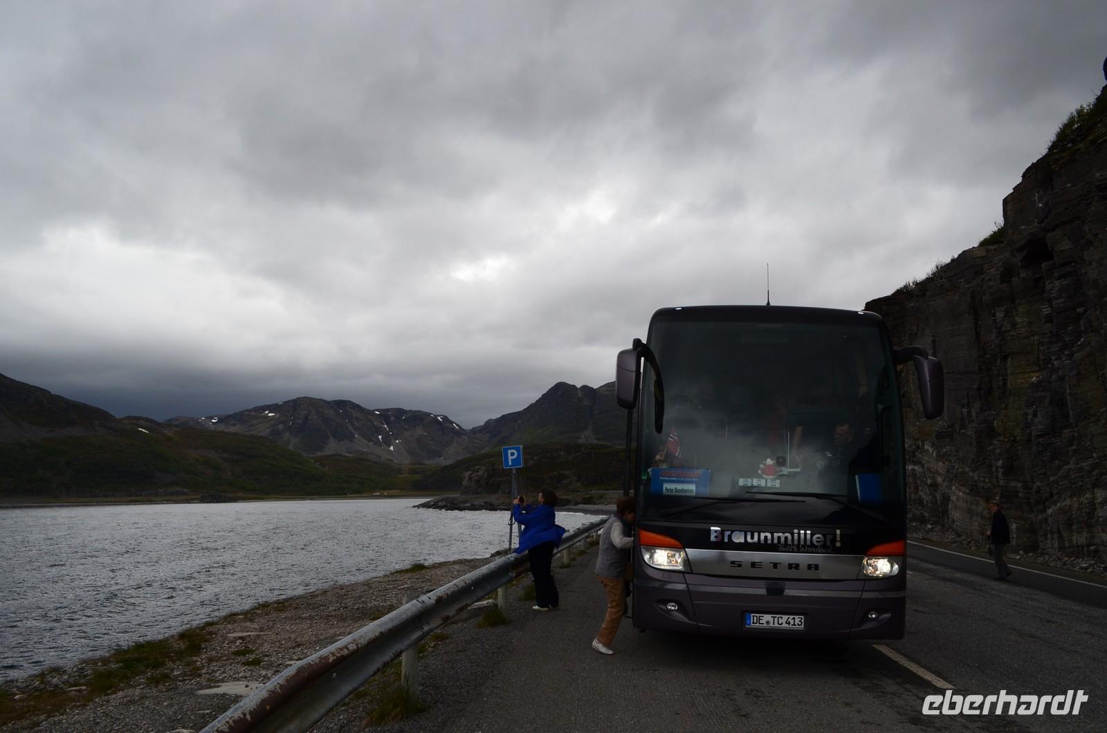 Am Museum in Alta gibt es Mittag, mit Blick über den Altafjord, und bei der nächsten Rast am Aussichtspunkt Sameleir stehen wir dann mit herrlicher Aussicht hoch über dem Kvaenangenfjord.