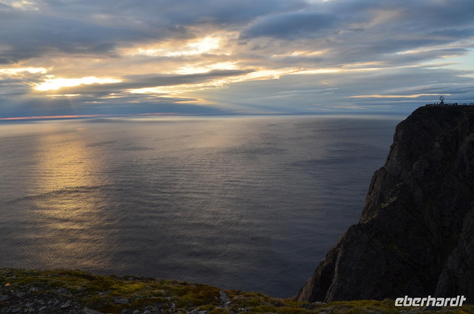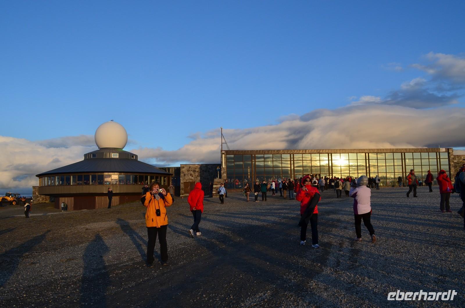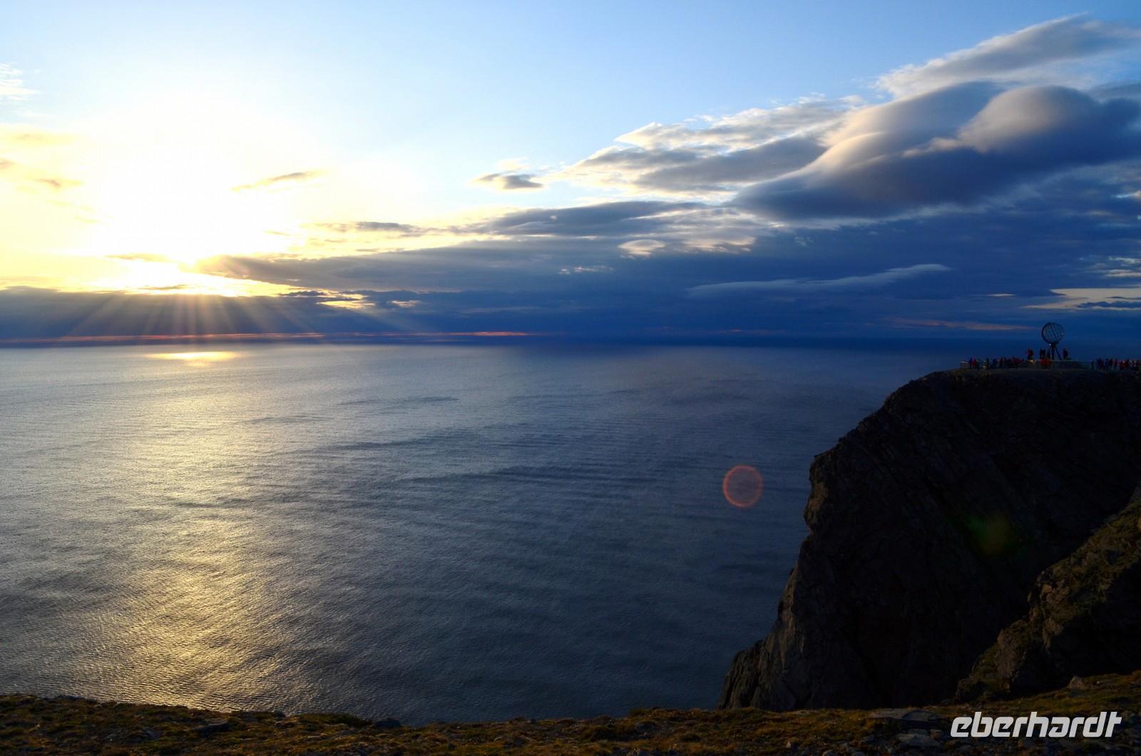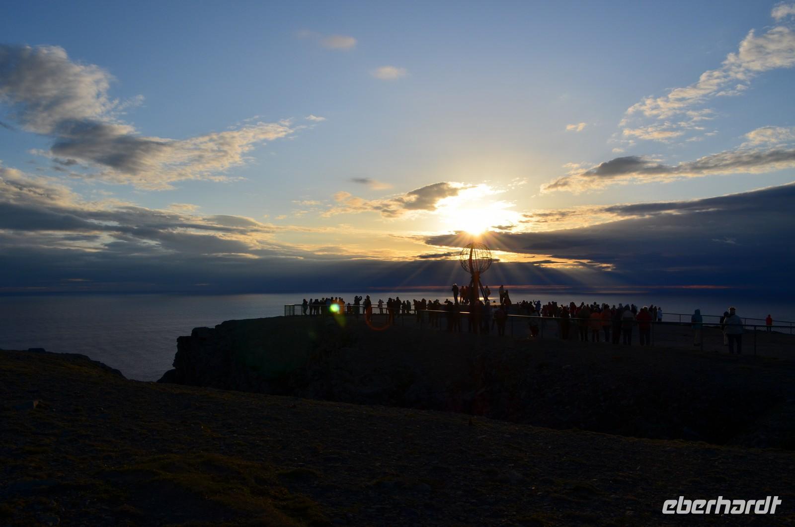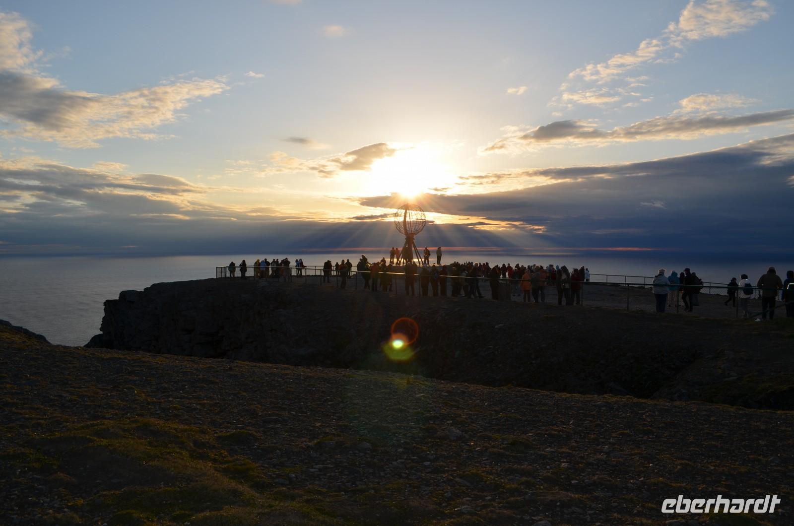 Am Rica-Nordkapp Hotel bei Honningsvag auf der Insel Mageroya ist es bei unserer Ankunft auch sonnig, aber sehr stürmisch. Nach dem Abendessen starten wir zur Fahrt auf das Nordkapp, mit Fotostopp unterwegs zum Nordkaphorn und Fjord. Am Nordkapp scheint die Mitternachtssonne! Da lohnt sich der Aufenthalt auf dem Felsen hoch über dem Nordmeer und wir zählen zu den 20 % Glücklichen, die das jedes Jahr erleben dürfen.