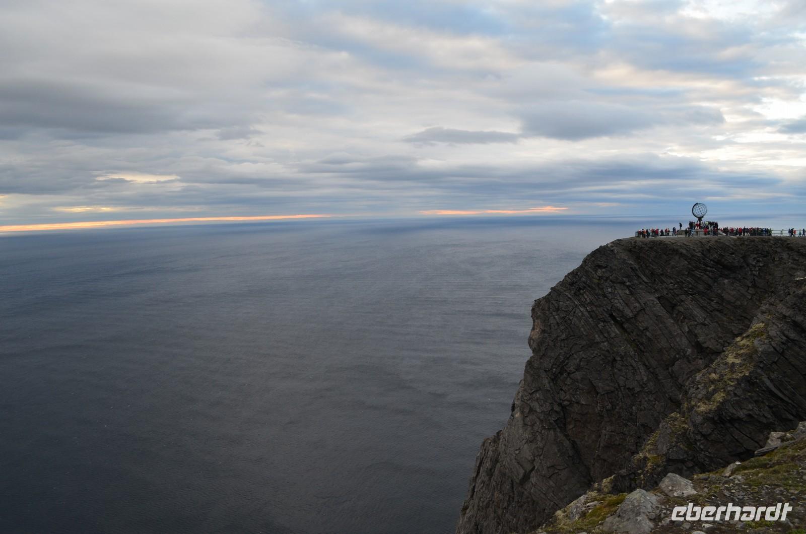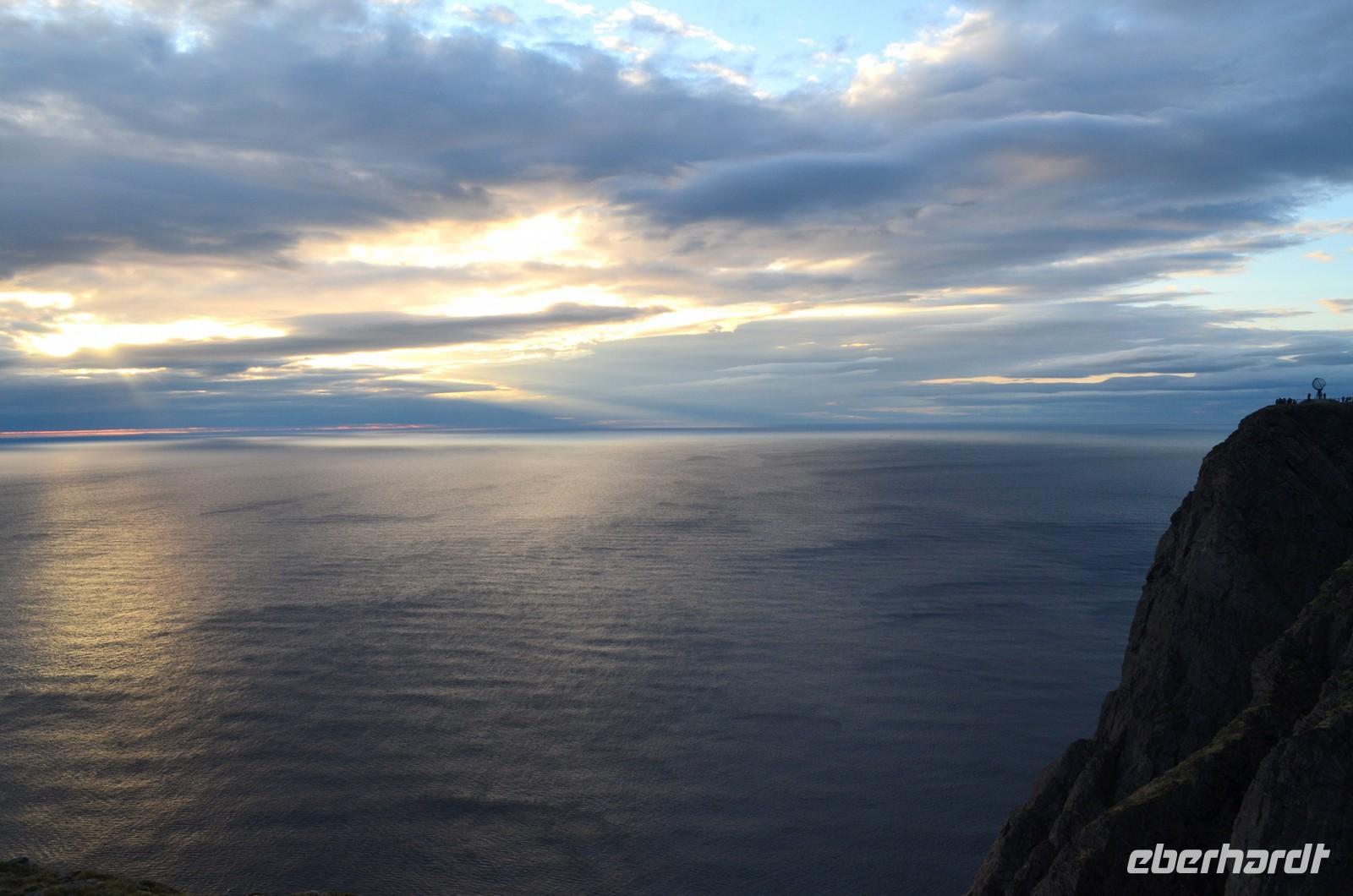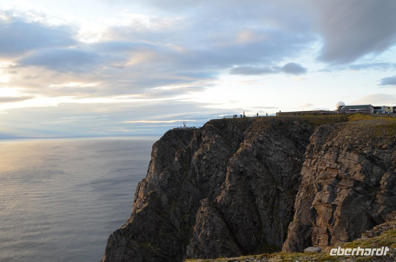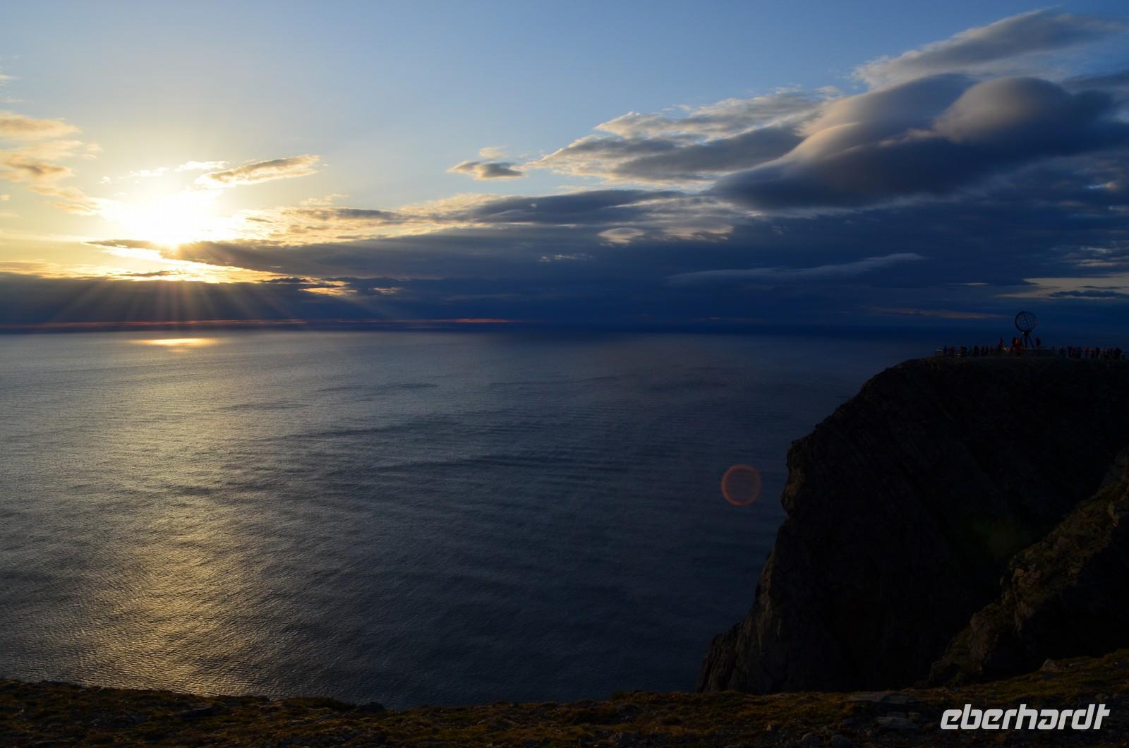 Am Rica-Nordkapp Hotel bei Honningsvag auf der Insel Mageroya ist es bei unserer Ankunft auch sonnig, aber sehr stürmisch. Nach dem Abendessen starten wir zur Fahrt auf das Nordkapp, mit Fotostopp unterwegs zum Nordkaphorn und Fjord. Am Nordkapp scheint die Mitternachtssonne! Da lohnt sich der Aufenthalt auf dem Felsen hoch über dem Nordmeer und wir zählen zu den 20 % Glücklichen, die das jedes Jahr erleben dürfen.