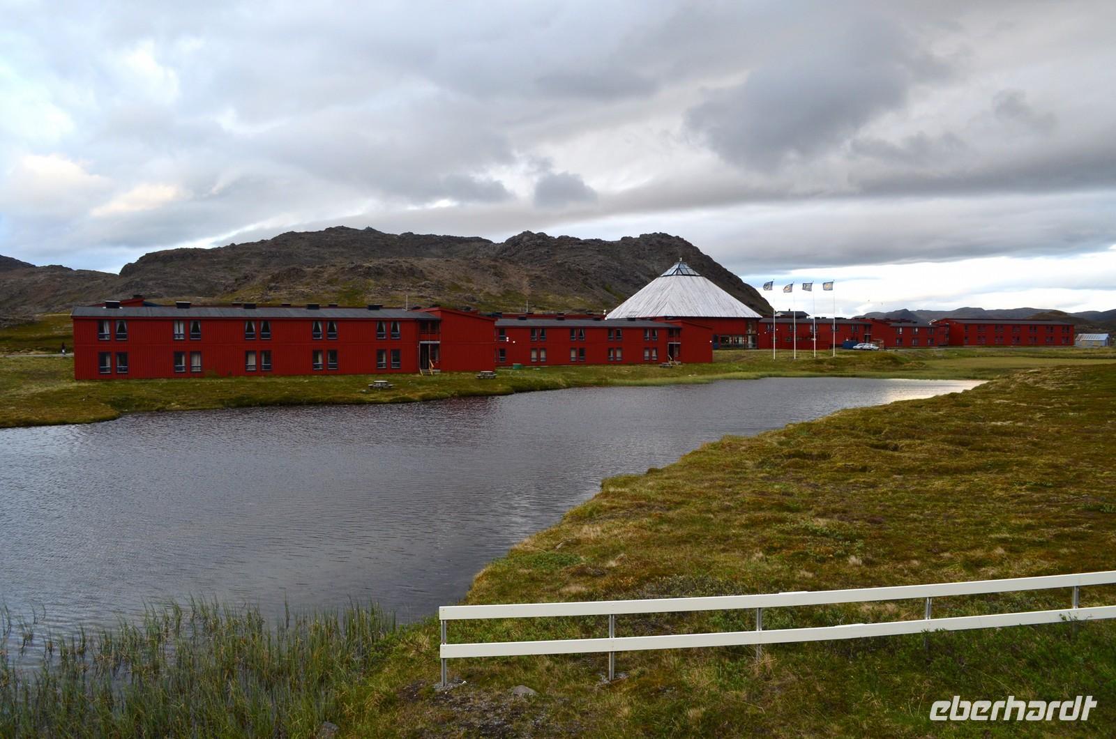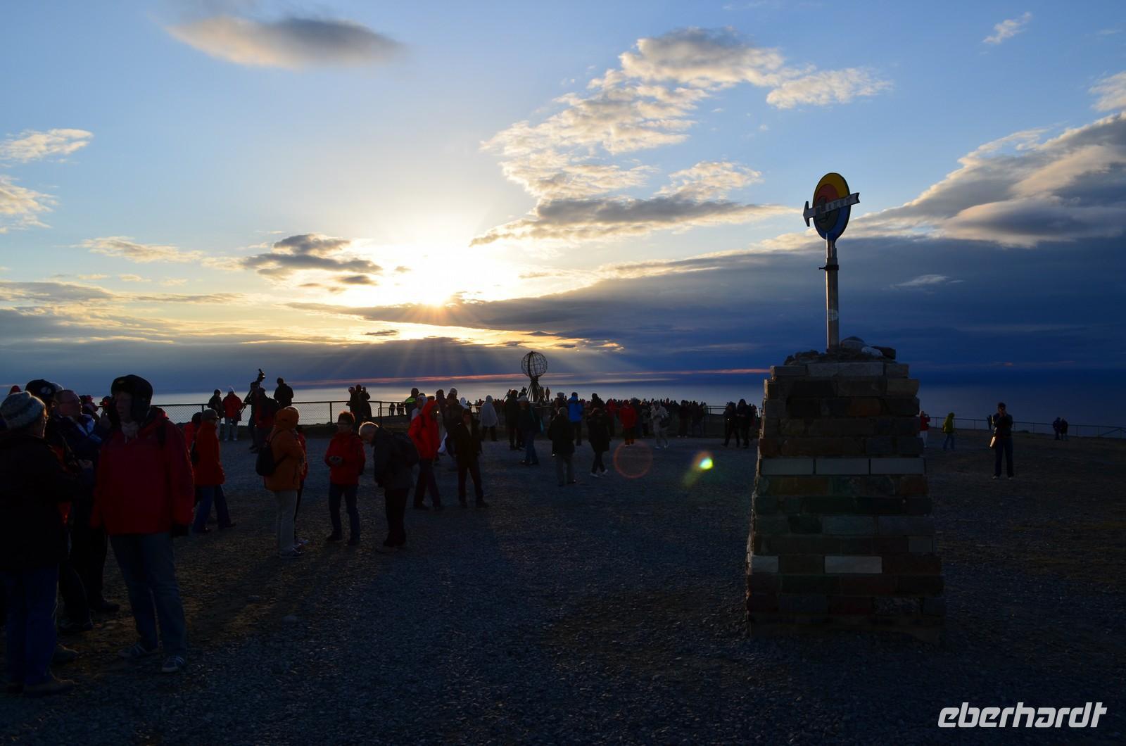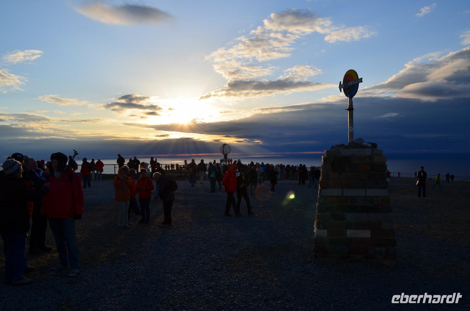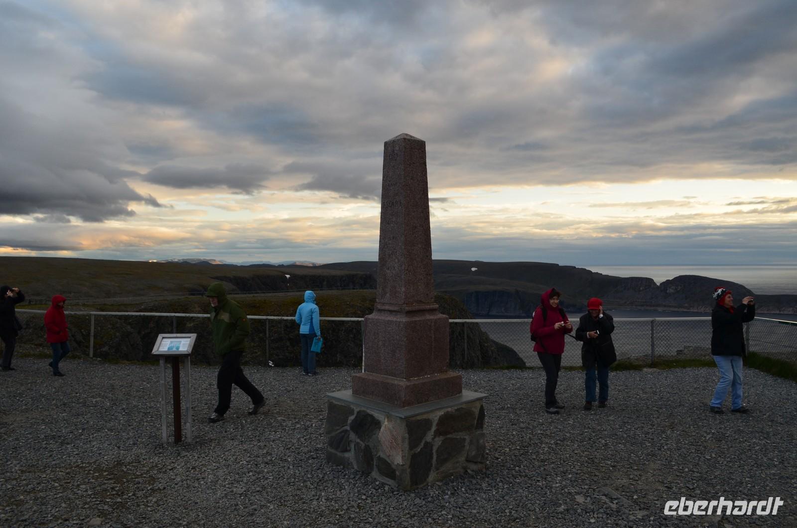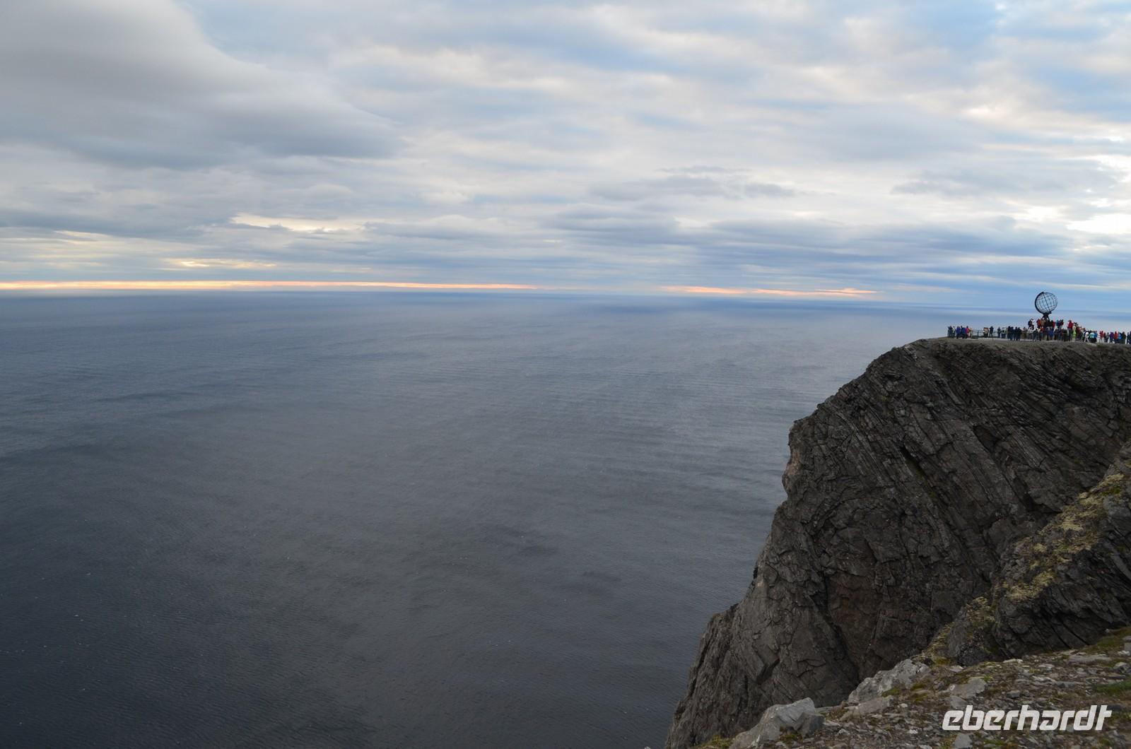 Am Rica-Nordkapp Hotel bei Honningsvag auf der Insel Mageroya ist es bei unserer Ankunft auch sonnig, aber sehr stürmisch. Nach dem Abendessen starten wir zur Fahrt auf das Nordkapp, mit Fotostopp unterwegs zum Nordkaphorn und Fjord. Am Nordkapp scheint die Mitternachtssonne! Da lohnt sich der Aufenthalt auf dem Felsen hoch über dem Nordmeer und wir zählen zu den 20 % Glücklichen, die das jedes Jahr erleben dürfen.