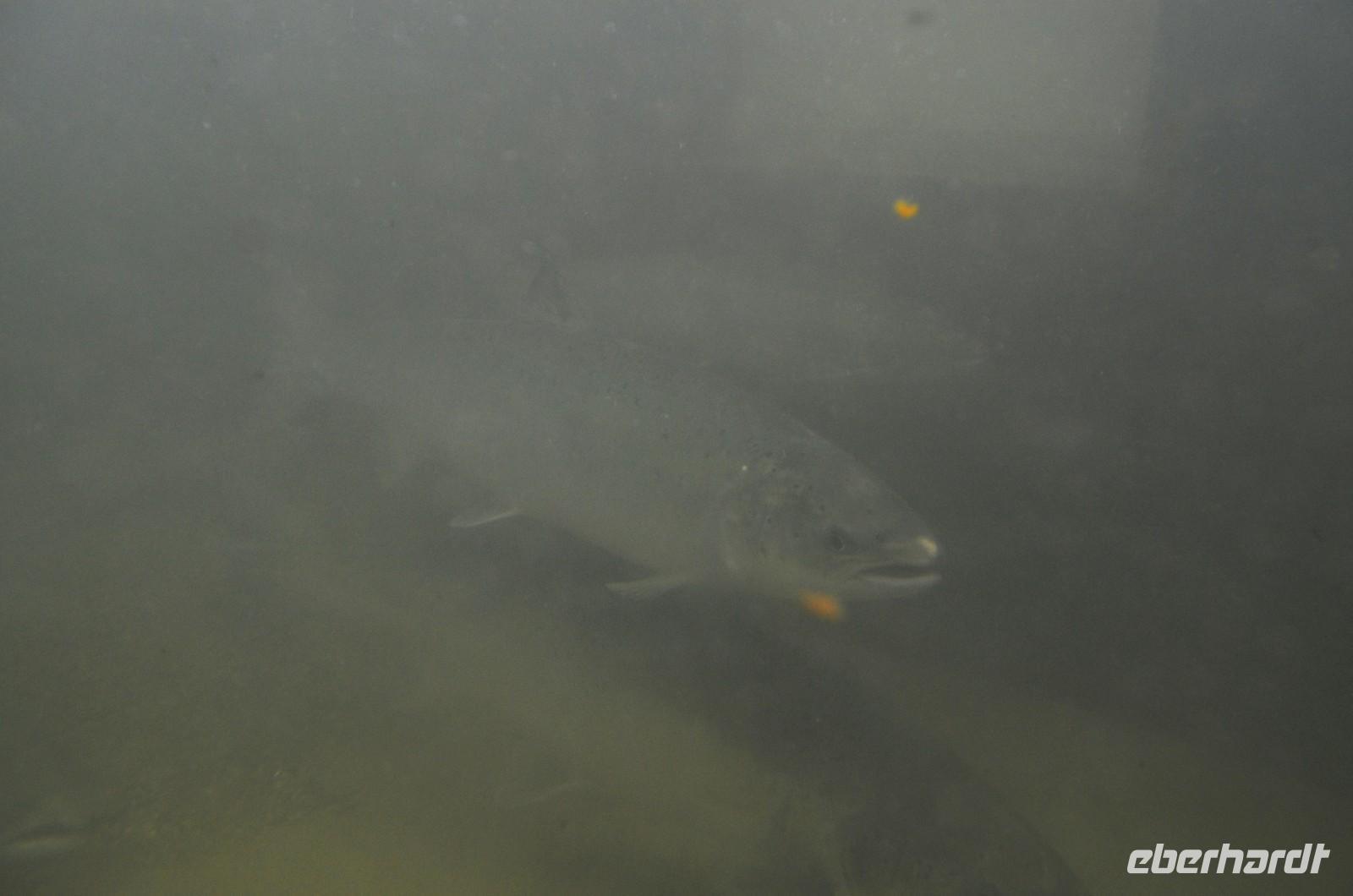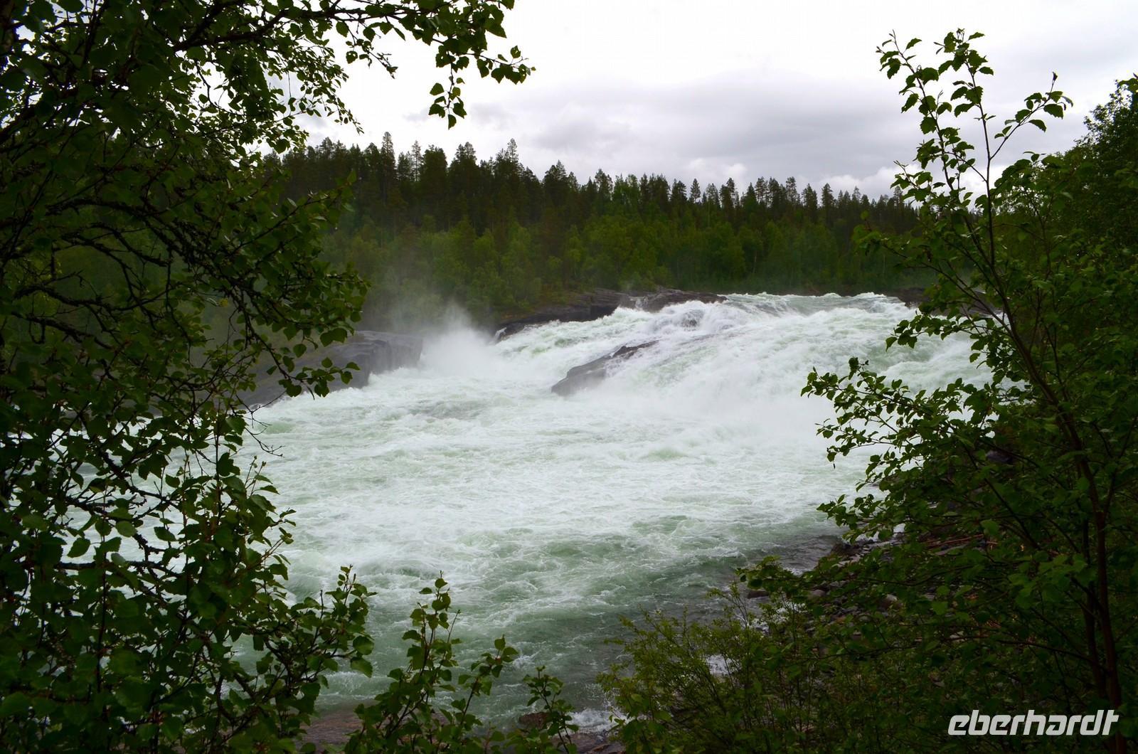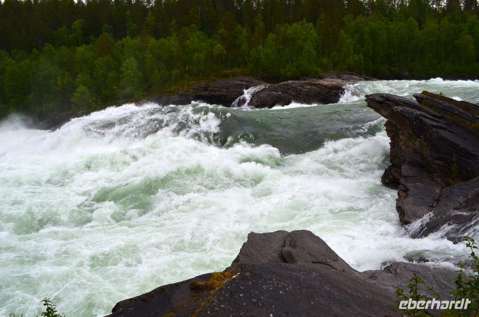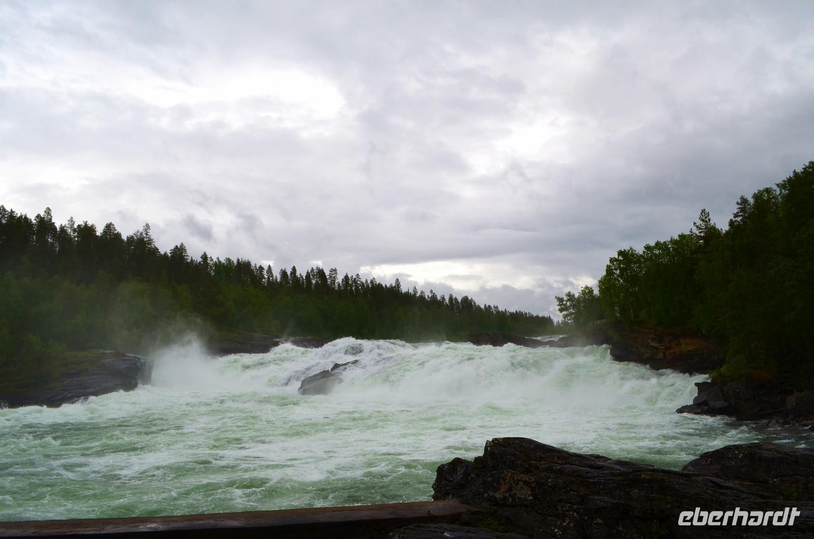 Danach dann die wunderschöne Fahrt entlang der Fjorde und durch die Berge Richtung Harstad. Natürlich unternehmen wir einen Abstecher zum Målselvfossen, dem Norwegischen Nationalwasserfall mit Lachstreppe und Aquarium - als eberhardt-WOW! Ein absolut lohnenswertes Erlebnis! Fünf Lachse stehen in einer Stufe der Lachstreppe.