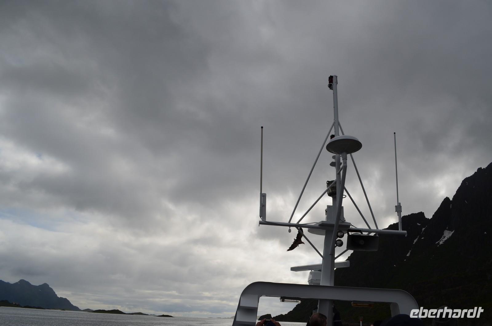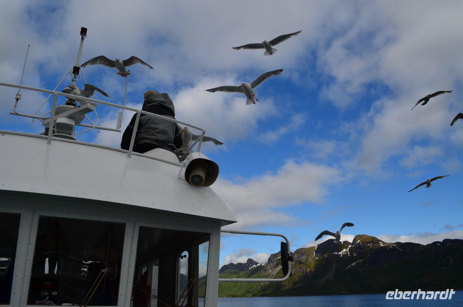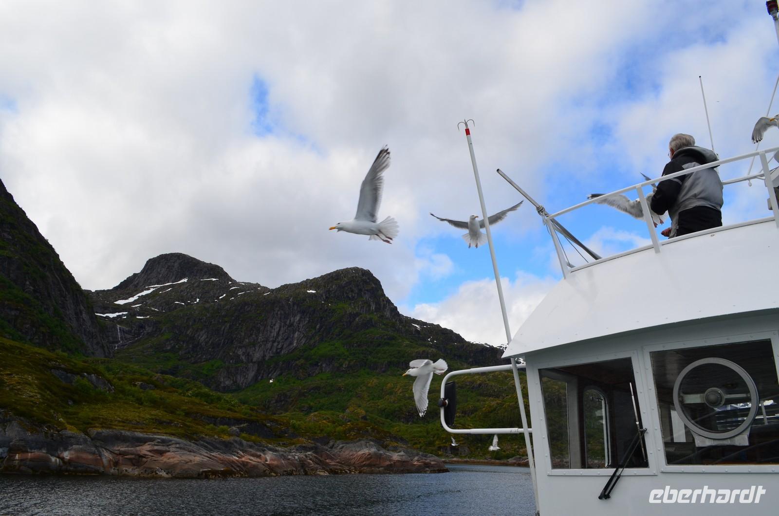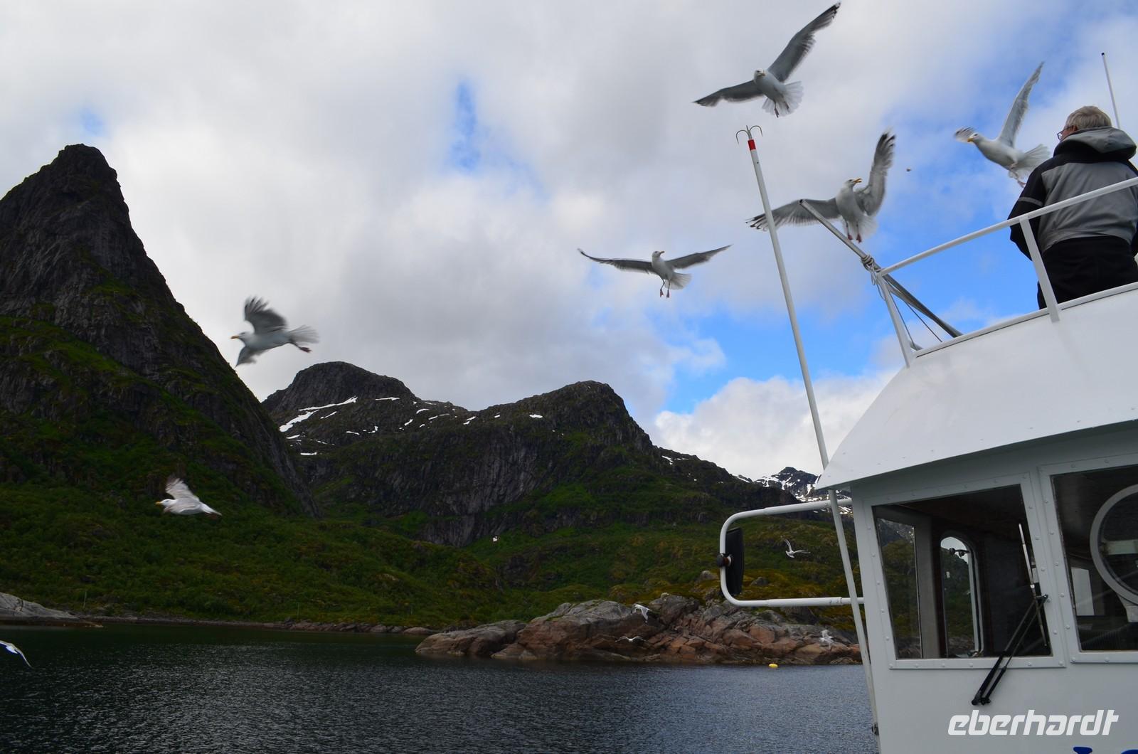 Nach dem Trollfjord werden die Möven gefüttert und so an verschiedenen Stellen im Raftsund die Seeadler angelockt, die dann mit Fischen gefüttert werden, einmal sind es 3 Stück und einmal 2 Stück, die um unser Boot kreisen - tolle Fotomotive.