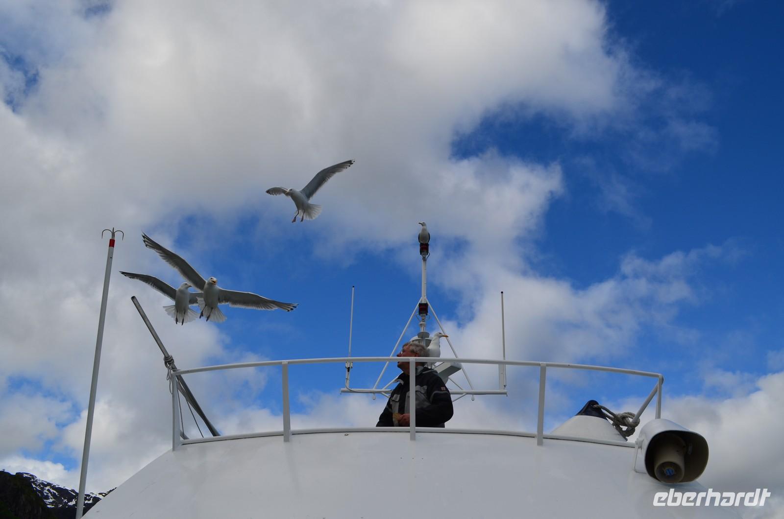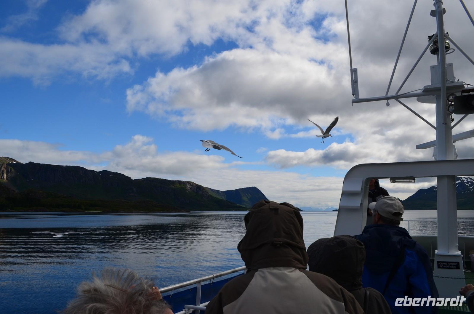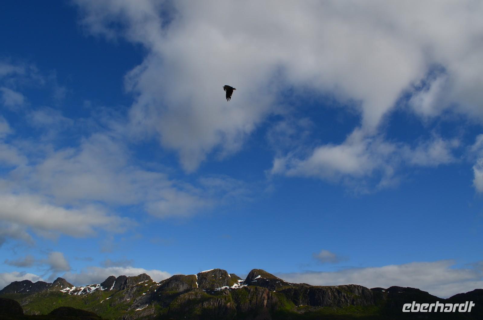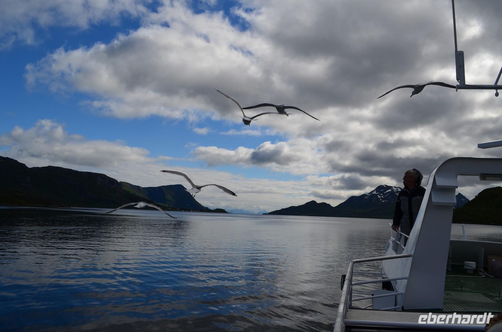 Nach dem Trollfjord werden die Möven gefüttert und so an verschiedenen Stellen im Raftsund die Seeadler angelockt, die dann mit Fischen gefüttert werden, einmal sind es 3 Stück und einmal 2 Stück, die um unser Boot kreisen - tolle Fotomotive.
