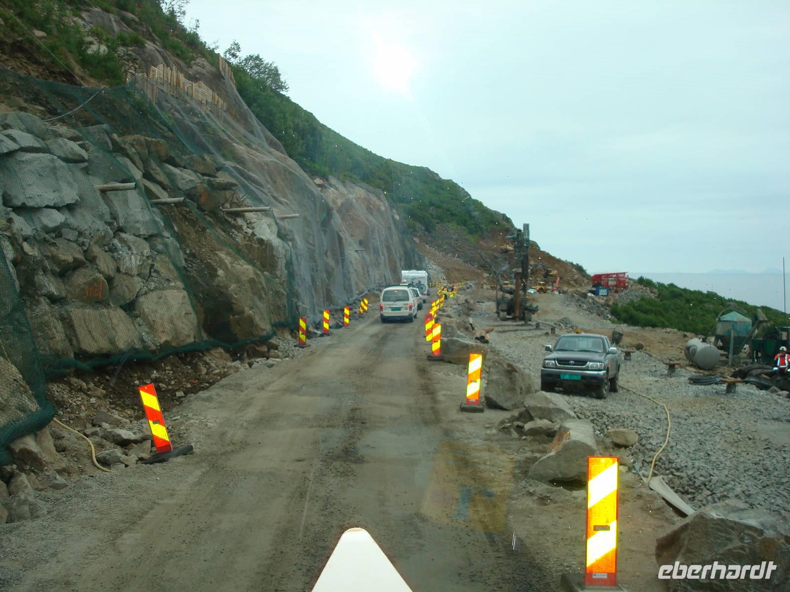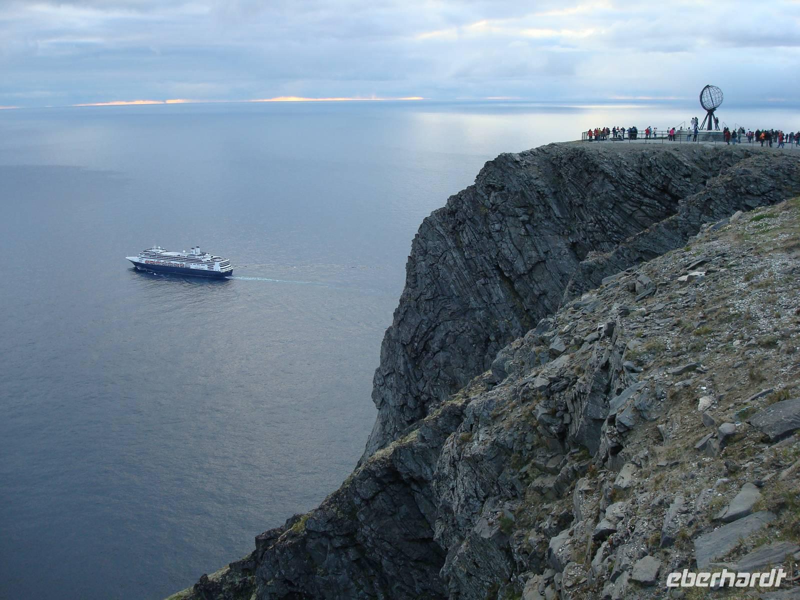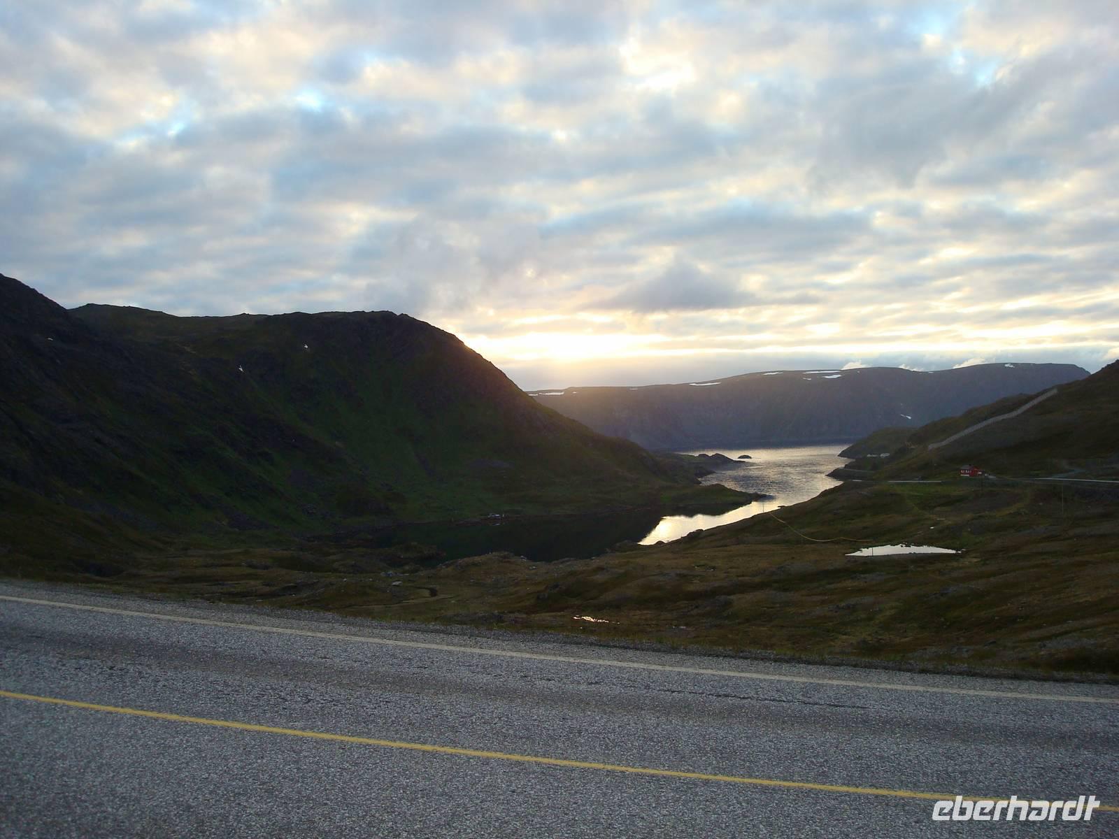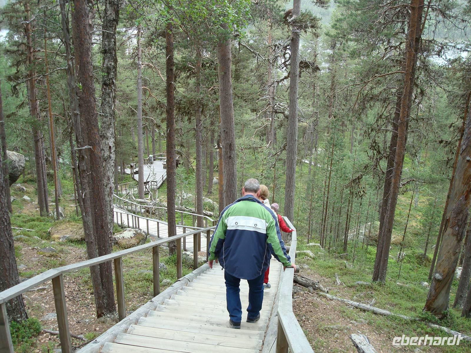 Von Luosto ging es in immer einsamere Gegenden Lapplands. Nur wenige Ortschaften säumten unseren Weg. In Saarisälkä entschlossen wir uns, kurzerhand auf den 438m hohen Kaunispää zu fahren. Wir standen da oberhalb der Baumgrenze und konnten die endlose Weite Finnlands sehen - sanfte Hügel, ausgedehnte Wälder bis hin zu den Hügeln oberhalb der Baumgrenze. An der Bärenhöhle nutzen wir die Zeit, die einzigartige Gletschermühle aufzusuchen und die Aussicht auf den Inarisee zu genießen. Außerdem kauften wir noch einmal Souvenirs von den Lappen. Die letzten Kilometer bis zur norwegischen Grenze fühlten wir uns ein klein wenig wie in einer Achterbahn. In der Ferne konnten wir hohe schneebedeckte Gipfel sehen. In Karasjok am Sapmi-Museum nutzten wir die Zeit, um Geld zu tauschen oder einen kurzen Blick in eine samische Behausung zu werfen. Wir durchquerten die ersten Kilometer Norwegens im Landesinneren - die Berge wurden nun höher, viele Seen lagen in den Tälern. In Lakselv kamen wir nun an den ersten Fjord, den Porsanger. Ihm folgten wir, stets mit Blick in Richtung Norden, denn irgendwo dort oben liegt ja unser heutiges großes Tagesziel - das Kap. Dem Wetter trauten wir nicht so richtig. So halfen wir unserem Glück nach und bauten Trolle in einer Bucht am Fjord. Ob dies nun wirklich Glück bringt? J Durch den Nordkaptunnel (6870 m lang und 212 m.u.n.) und den Honningsvagtunnel (4440m lang) erreichten wir die Insel Mageroy. Vor Honningsvag lag ein Kreuzfahrtschiff - „The World". Wie wir noch erfahren sollten, kam wohl einen Tag später die „Queen Mary 2" nach Honningsvag. Nach einem guten Abendbrot im Hotel ging es mit Albrecht, einem Spanier als Nordkapfahrer, ganz hinauf. Auf dem Nordkapfelsen war es ungewöhnlich windstill, zwar bewölkt, aber nicht neblig. Die Sonne versteckte sich hinter den Wolken, schimmerte aber manchmal etwas hindurch. Um 0.17Uhr, der Zeitpunkt an dem die Sonne den tiefsten Stand erreichte, fuhren wir zurück. Auf dem Weg nach Honningsvag passierte es dann... die Sonne blinzelte tatsächlich noch unter den Wolken hervor, ein traumhaftes Bild J. Sicherlich alle zufrieden verabschiedeten wir uns zu einer kurzen Nacht.
