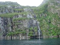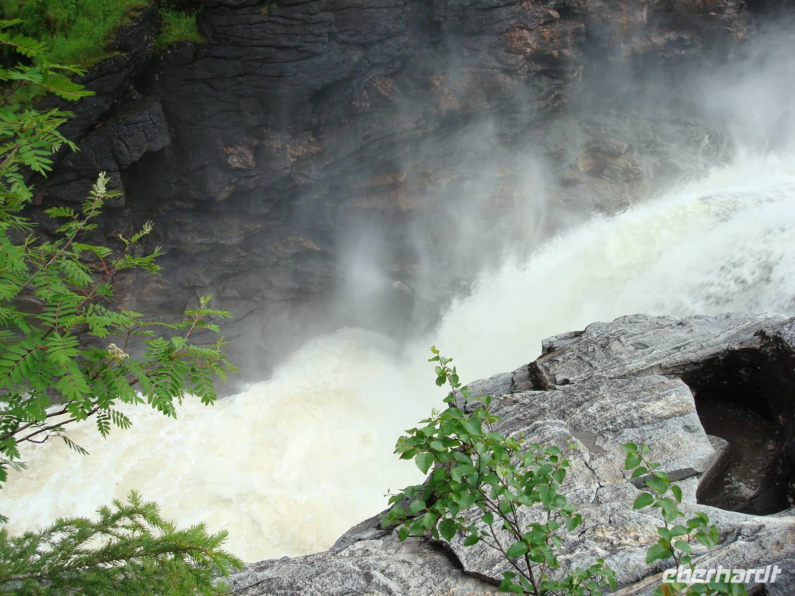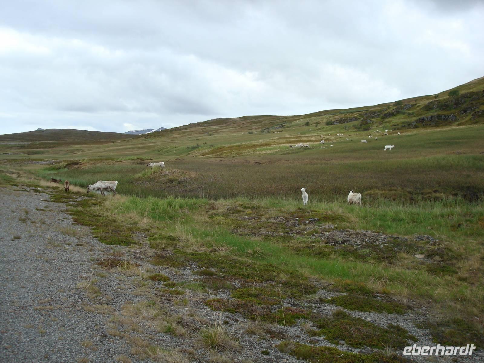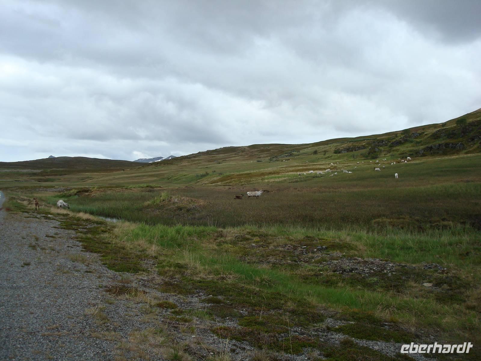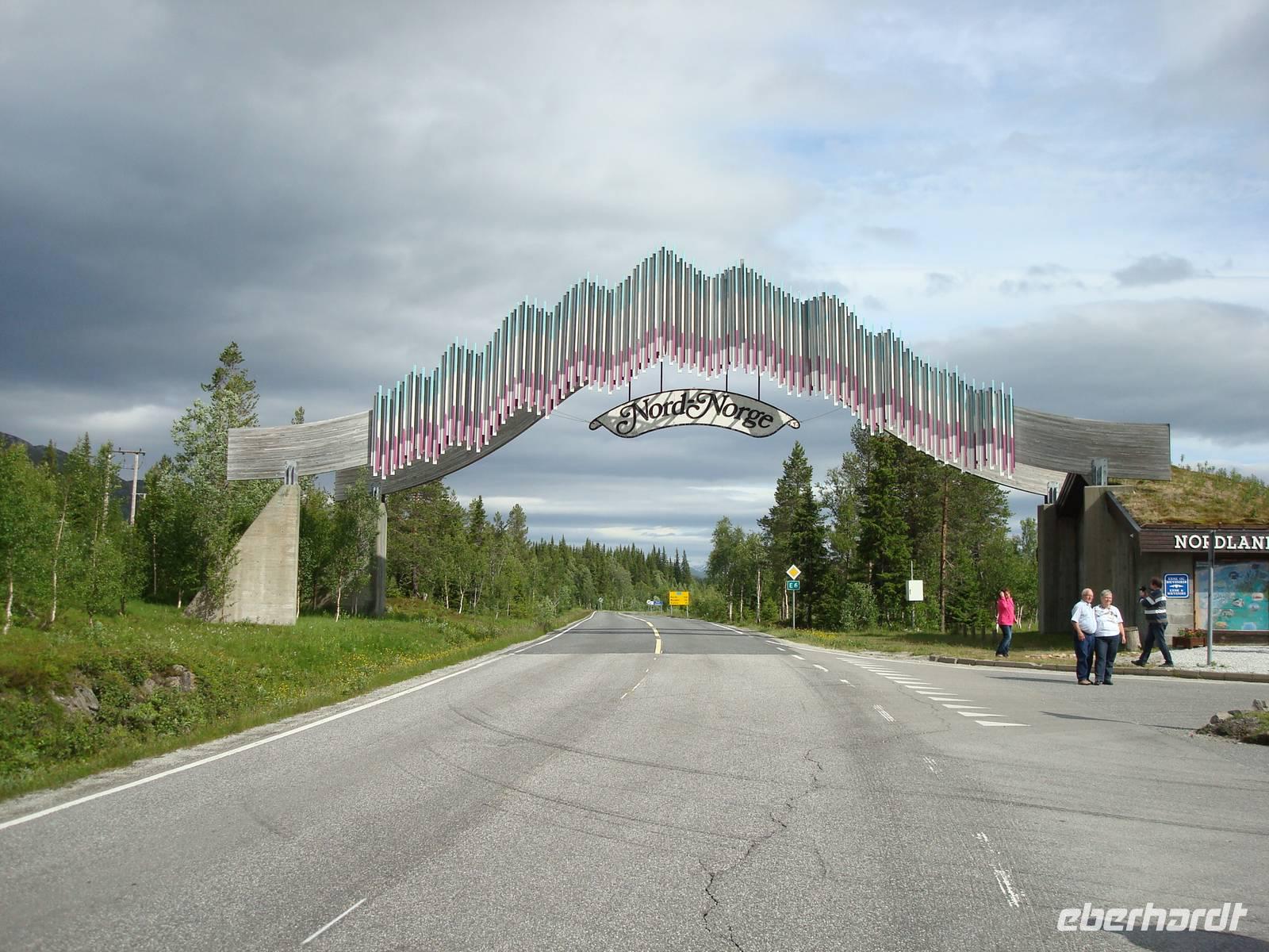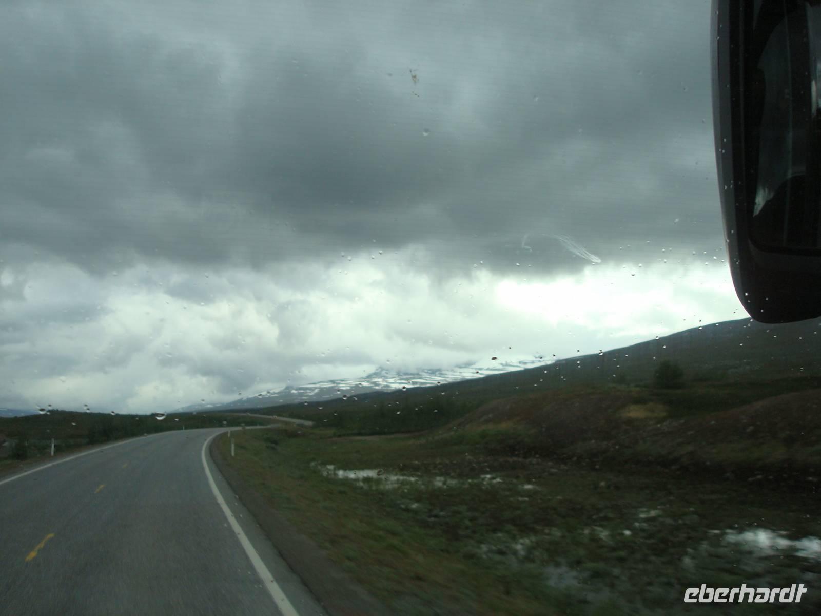 Bei Regen fuhren wir nach Lödingen zum Fähranleger. Wir setzten nach Bognes über und waren nun wieder auf der E6 in Richtung Trondheim unterwegs. Strömender Regen begleitete uns die ersten Stunden der Fahrt. Trotz allem konnten wir einen Eindruck von der gigantischen Landschaft erhaschen, wie z.B. das markante Massiv des Krakmo und auch die vielen Fjorde an denen wir entlangfuhren wie der Sagfjord, der Sörfjord (Sorfolda) und der Saltdalsfjord. Das Saltdal führte uns auf das Saltfjell. Bei mäßiger Bewölkung konnten wir die eindrucksvolle Bergwelt und die Einsamkeit und Rauheit des Fjells bewundern. Am Polarkreis überfuhren wir nun zum 2. Mal den Breitenkreis auf 66° 33' 44?.