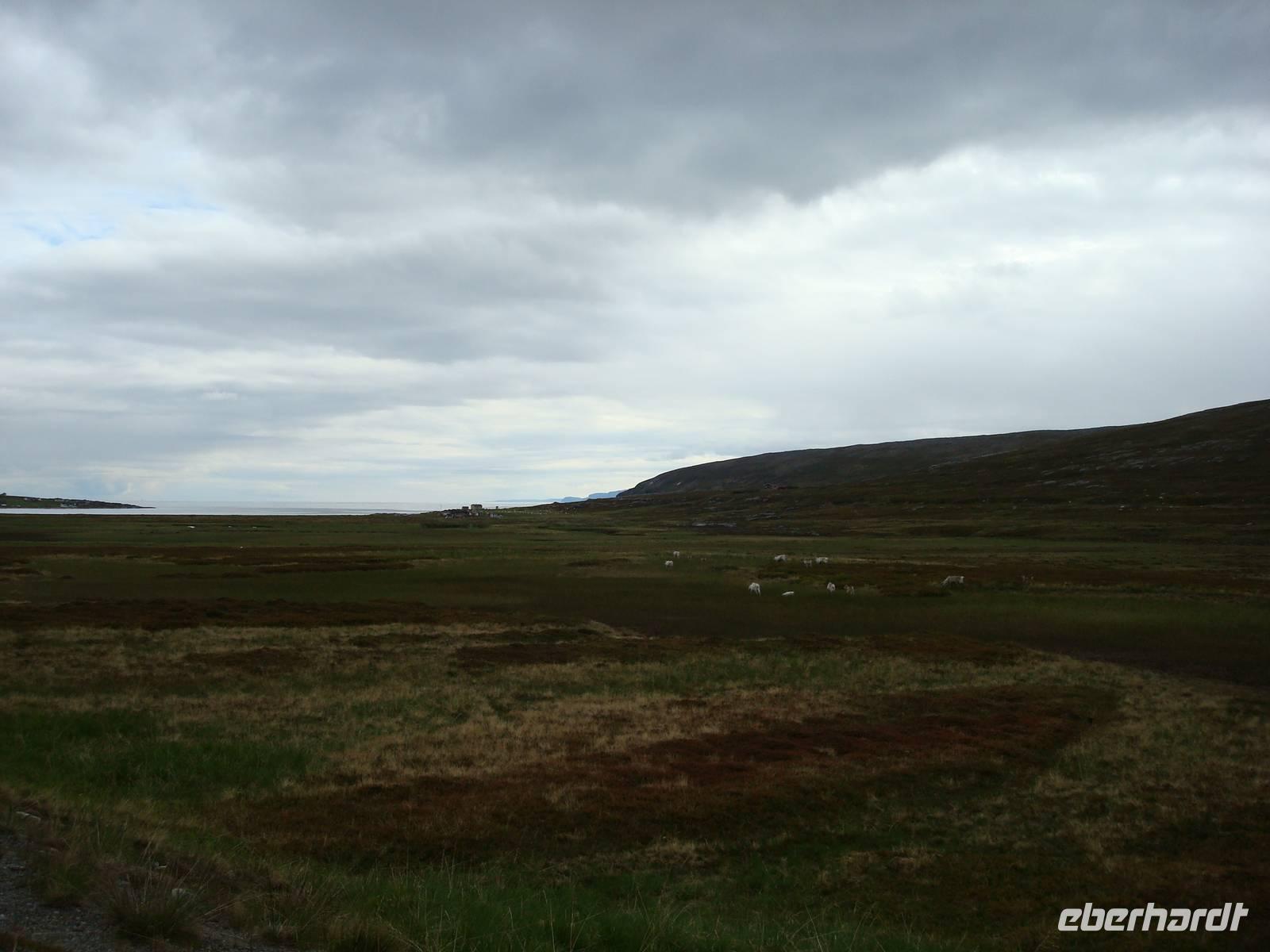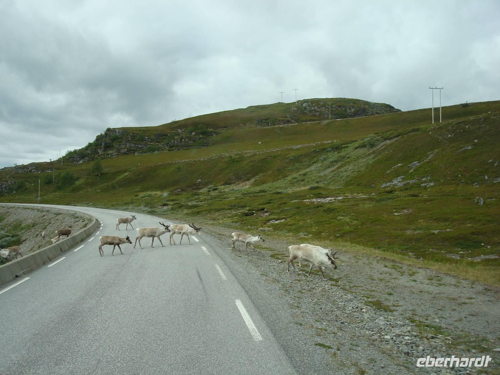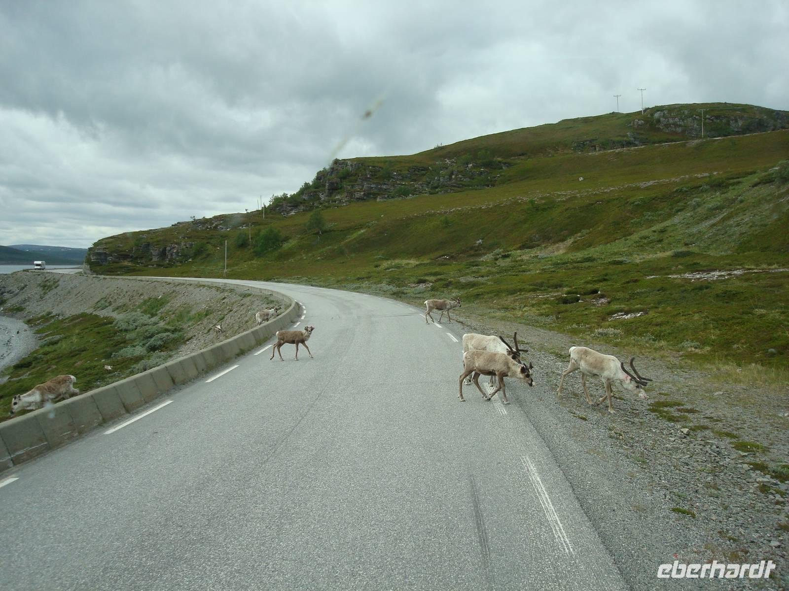 Ab heute ging es nun wieder südwärts. Wieder entlang dem Porsangerfjord sahen wir in der Ferne, wie ein kleineres Kreuzfahrtschiff in den Hafen von Honningsvag einfuhr. Wir erspähten riesige Herden Rentiere, unter ihnen sehr viele Jungtiere. In Olderfjord kamen wir wieder auf die E6 Richtung in Richtung Alta. Ab Skaidi fuhren wir entlang des Flusses Goahtemuorjohka auf das Sennalandet, wieder eine fast unberührte Hochfläche, Siedlungsgebiet der Samen. Alta ist bekannt für den Kampf der Samen gegen den Bau einer Staumauer an einem der lachsreichsten Flüsse, dem Altaelv. Über dieses Ereignis und den Kampf der Samen um eine gewisse Autonomie berichtet ein kleines Museum. Des Weiteren gehören zu diesem Museum Felsenzeichnungen, welche 2000 - 6000 Jahre alt sind und in der Liste des Unesco Weltkulturerbes stehen. Leider reichte unsere Zeit nur für einen kurzen Stopp. Vorbei am Kafjord, dem Liegeplatz der „Tirpitz" im 2.Weltkrieg, entlang des Kvaenangen und Lyngenfjord erreichten wir unsere erste Fähre in Olderdalen. Zweimal setzten wir über und konnten somit die Strecke nach Tromsö erheblich verkürzen. Im „Paris des Nordens" übernachteten wir unmittelbar im Zentrum, sodass viele den Abend für einen kleinen Spaziergang nutzten.