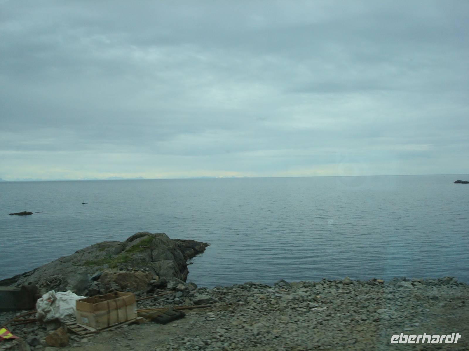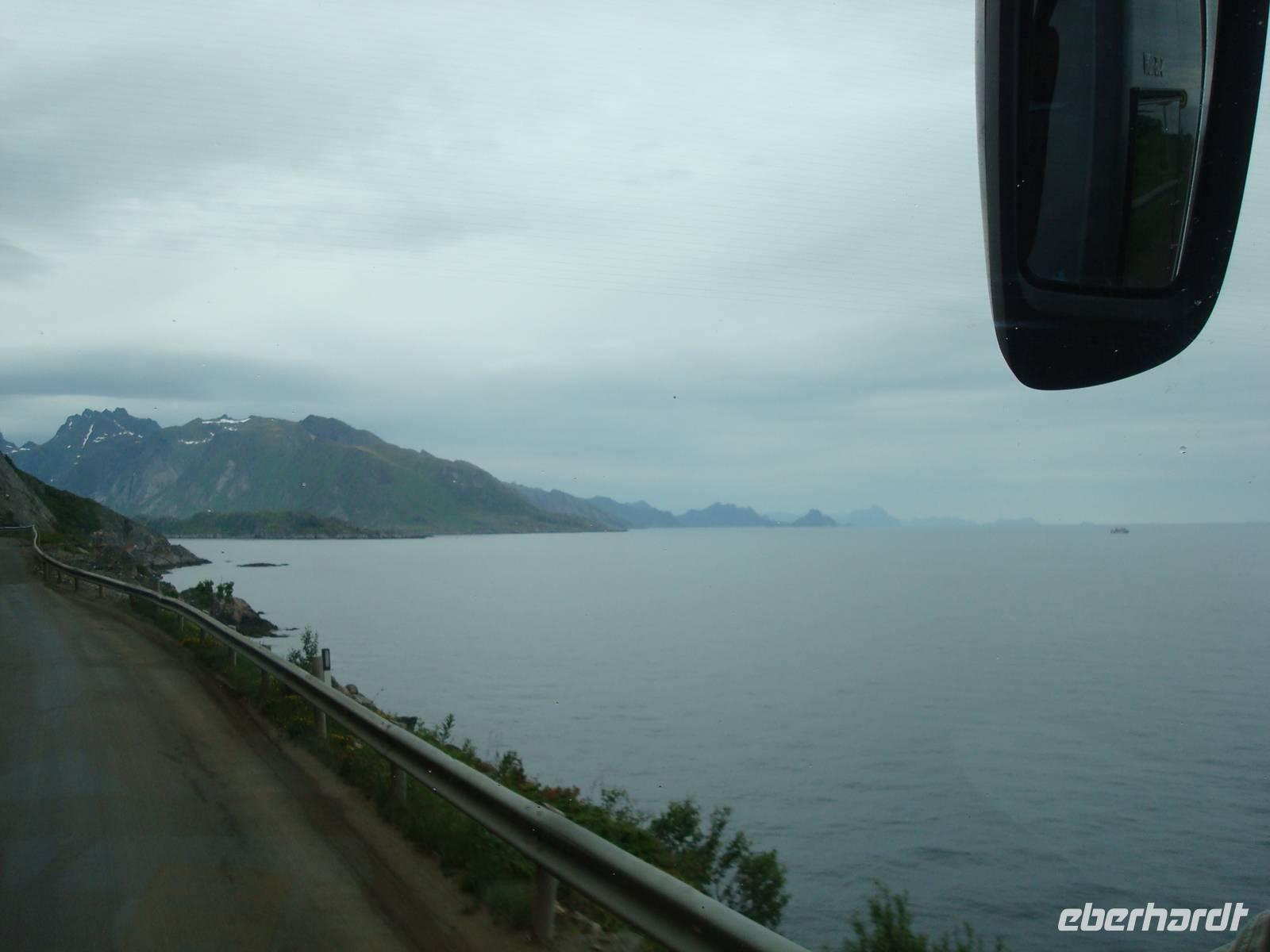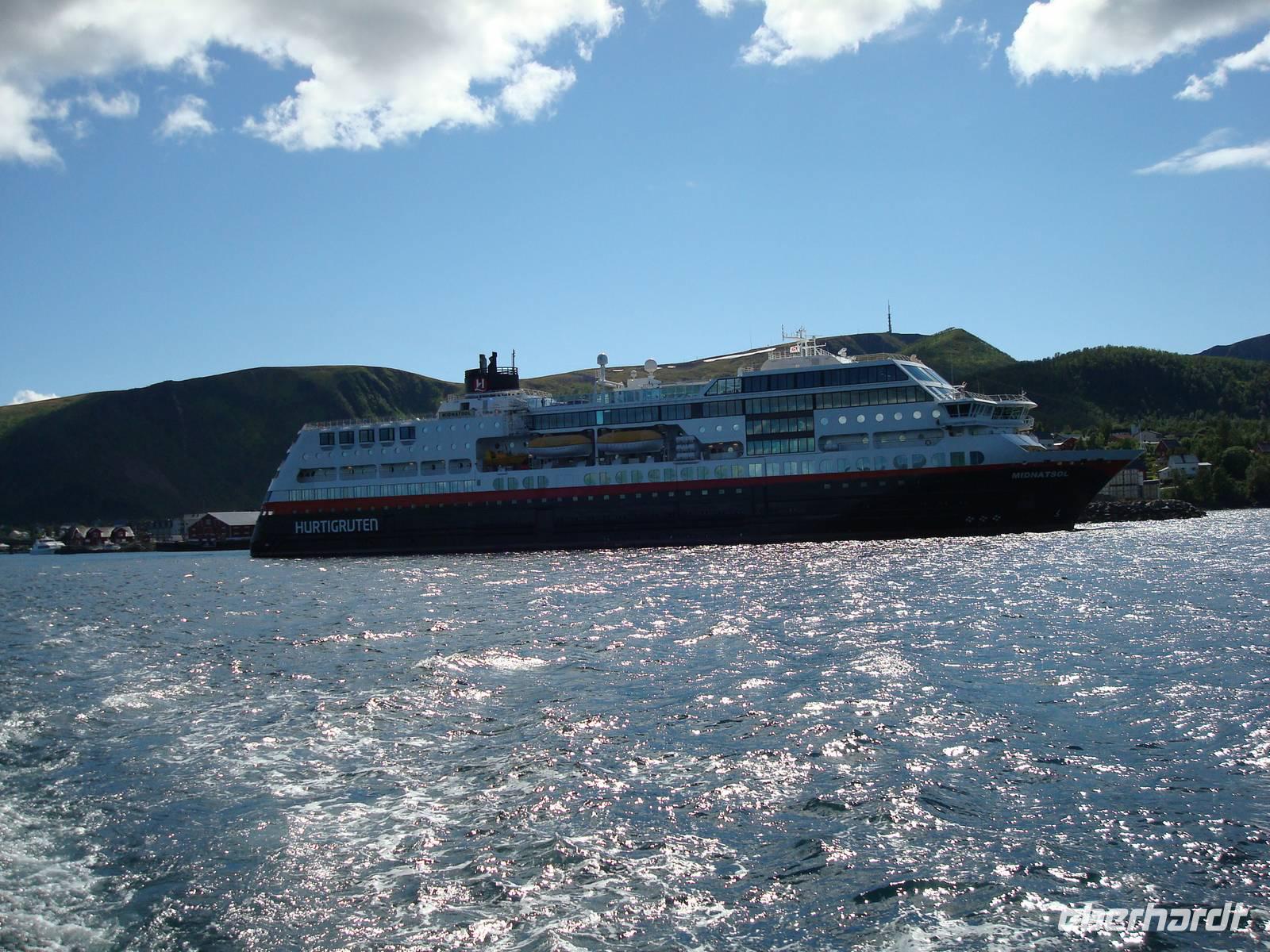 Mit der Fahrt über die Tromsöbru konnten wir die einzigartige Architektur der Kathedrale bestaunen - der richtige Blickwinkel und man sieht nur Glas und durch die Kirche hindurch. Von der Kirche aus wiederum hatten wir einen tollen Blick auf die Stadt. Eigentlich lohnenswert hier einen Tag länger zu bleiben J. Entlang des Balsfjord ging es an dessen Ende wieder ins Landesinnere. Wir konnten unsere Gäste an diesem Tag mit einem kleinen Mittag überraschen. Am Malselvfossen (ein kleiner Geheimtipp J ) war für uns eine Lachssuppe bestellt... mmmmmh, lecker. In der Lachstreppe waren leider keine Lachse zu sehen. Das Wasser war noch zu kalt. Dafür überwältigte uns der Anblick des tosenden Wasserfalls. Die Wegkirche von Bardu war leider geschlossen und Narvik am Ofotfjord war überhaupt nicht zu sehen, in Wolken und Nebel gehüllt. Dann auch noch eine Kontrolle durch den Zoll... alles gut J. Nun reichte es aber mit Pleiten, Pech und Pannen. Kaum über das Mikrofon angekündigt: „ das letzte Jahr haben wir auf dieser Strecke einen Elch gesehen" - stand er da... wie gemalt auf einem Feld und fraß J sehr schön, nur unmöglich ein Foto zu schießen. Noch ein Stopp an der Tjeldsundbrücke und das letzte Stück bis Harstad. Ganz schnelles Einchecken und sofort weiter mit Sigrid, einem Harstader Urgestein. Nach einer kleinen Stadtrundfahrt ging es in das militärische Sperrgebiet zur Adolfkanone, die größte Landkanone der Welt, ein Relikt aus dem 2.Weltkrieg. Wir erfuhren alles Wissenswerte über den Bau und die Funktionsweise und der Kanone. Es folgte noch ein Fotostopp an der Steinkirche von Trondenes. Dann ging es zurück ins Zentrum von Harstad.