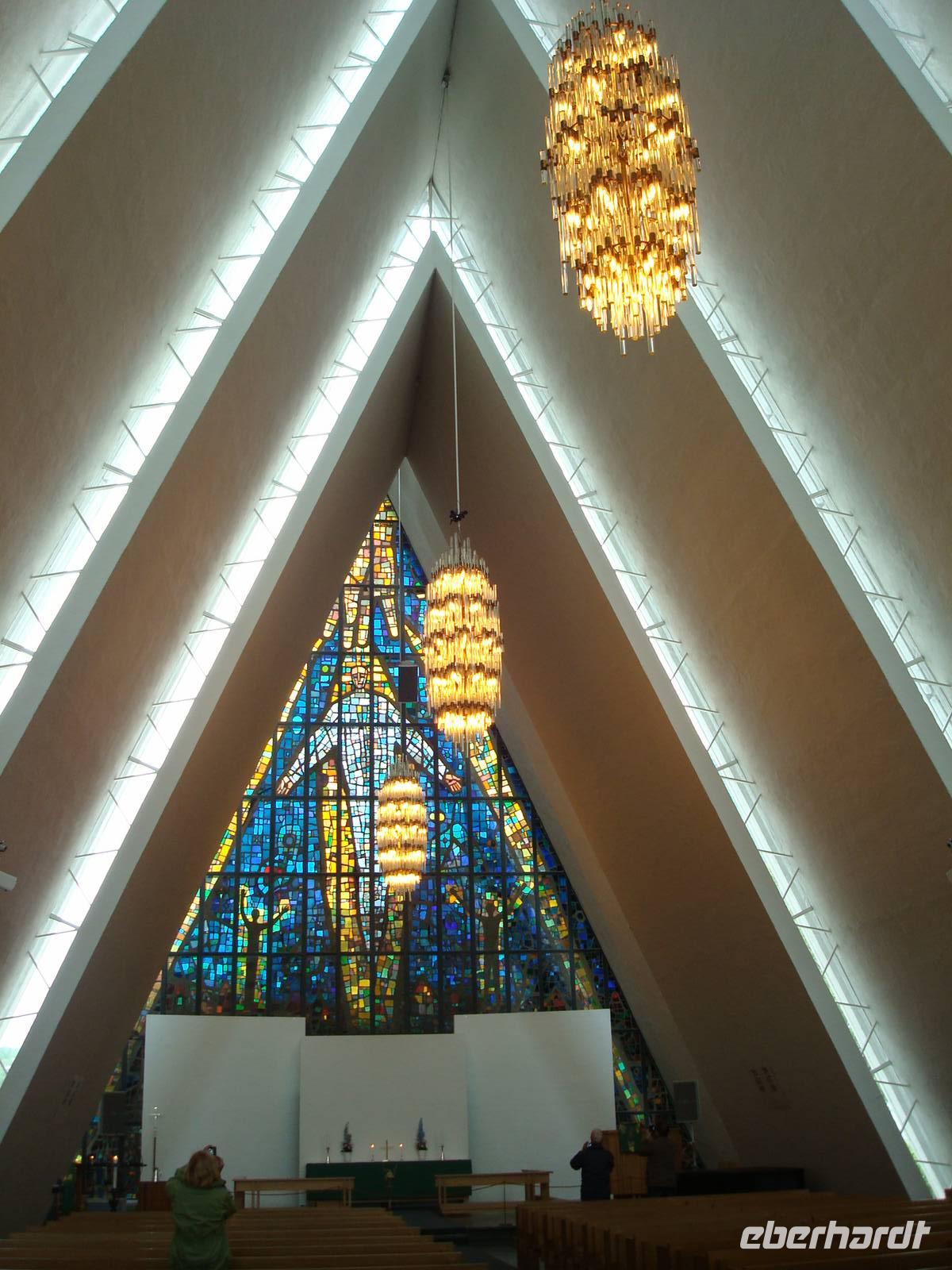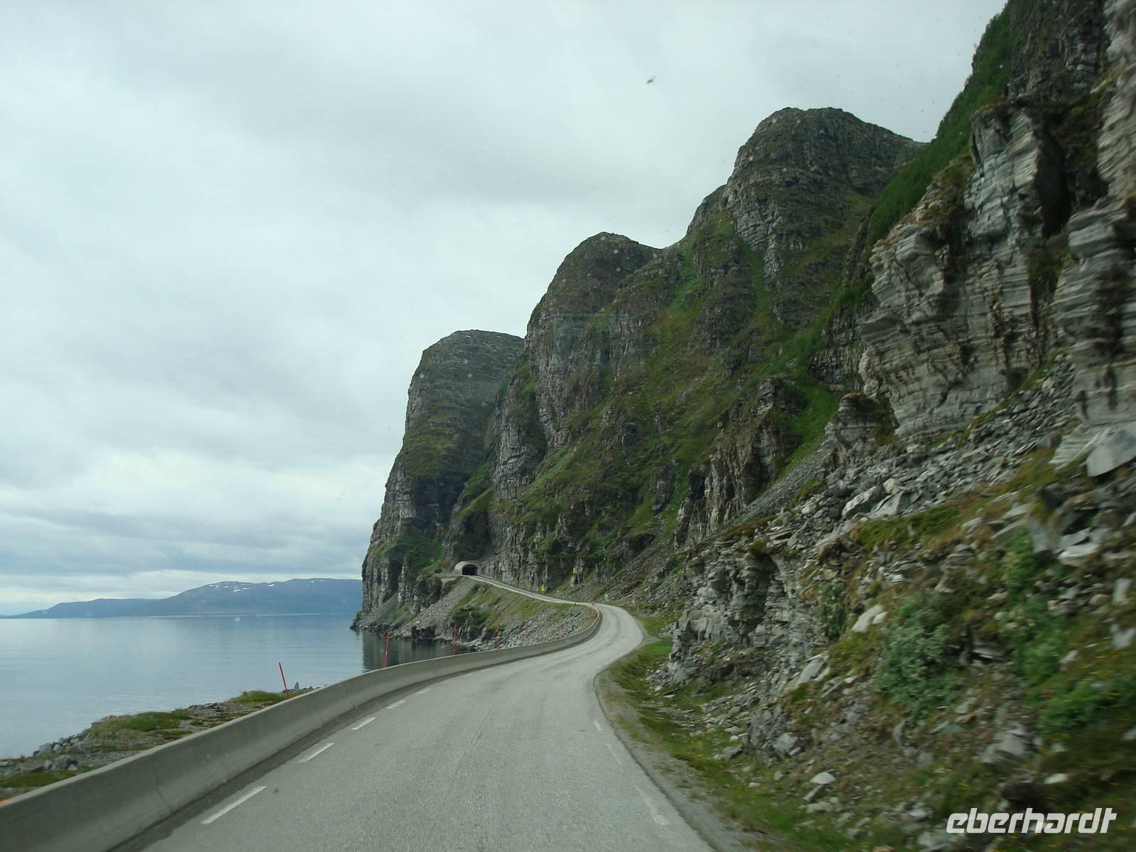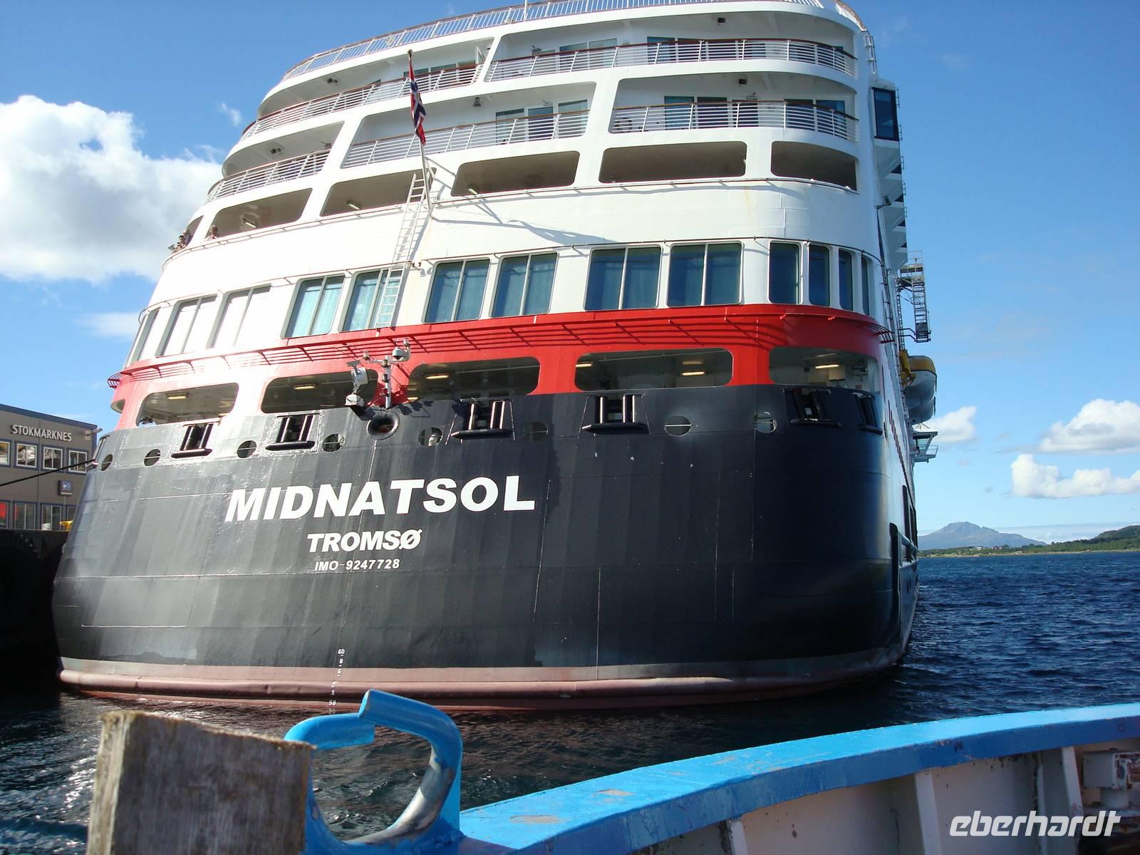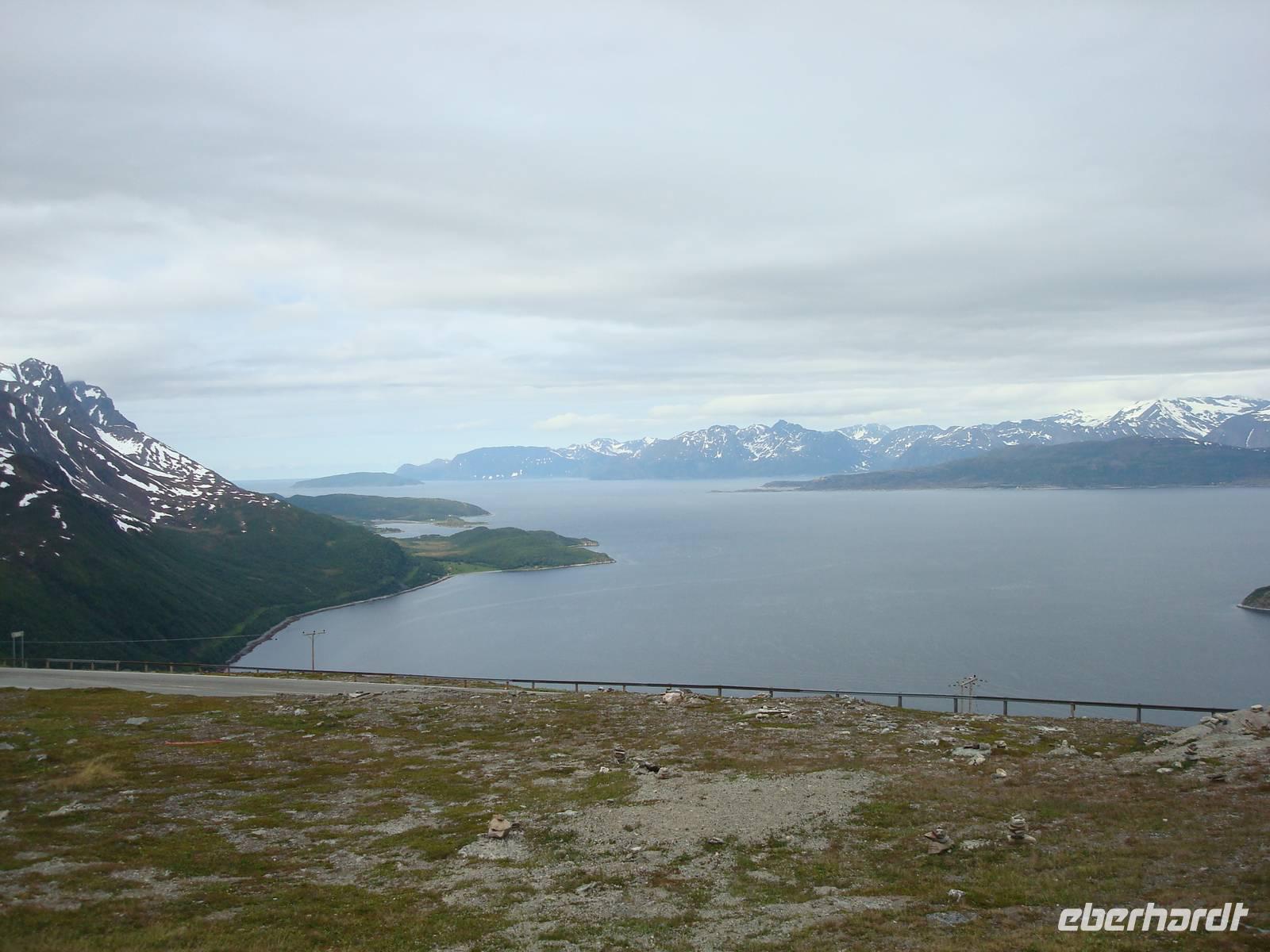 Mit der Fahrt über die Tromsöbru konnten wir die einzigartige Architektur der Kathedrale bestaunen - der richtige Blickwinkel und man sieht nur Glas und durch die Kirche hindurch. Von der Kirche aus wiederum hatten wir einen tollen Blick auf die Stadt. Eigentlich lohnenswert hier einen Tag länger zu bleiben J. Entlang des Balsfjord ging es an dessen Ende wieder ins Landesinnere. Wir konnten unsere Gäste an diesem Tag mit einem kleinen Mittag überraschen. Am Malselvfossen (ein kleiner Geheimtipp J ) war für uns eine Lachssuppe bestellt... mmmmmh, lecker. In der Lachstreppe waren leider keine Lachse zu sehen. Das Wasser war noch zu kalt. Dafür überwältigte uns der Anblick des tosenden Wasserfalls. Die Wegkirche von Bardu war leider geschlossen und Narvik am Ofotfjord war überhaupt nicht zu sehen, in Wolken und Nebel gehüllt. Dann auch noch eine Kontrolle durch den Zoll... alles gut J. Nun reichte es aber mit Pleiten, Pech und Pannen. Kaum über das Mikrofon angekündigt: „ das letzte Jahr haben wir auf dieser Strecke einen Elch gesehen" - stand er da... wie gemalt auf einem Feld und fraß J sehr schön, nur unmöglich ein Foto zu schießen. Noch ein Stopp an der Tjeldsundbrücke und das letzte Stück bis Harstad. Ganz schnelles Einchecken und sofort weiter mit Sigrid, einem Harstader Urgestein. Nach einer kleinen Stadtrundfahrt ging es in das militärische Sperrgebiet zur Adolfkanone, die größte Landkanone der Welt, ein Relikt aus dem 2.Weltkrieg. Wir erfuhren alles Wissenswerte über den Bau und die Funktionsweise und der Kanone. Es folgte noch ein Fotostopp an der Steinkirche von Trondenes. Dann ging es zurück ins Zentrum von Harstad.