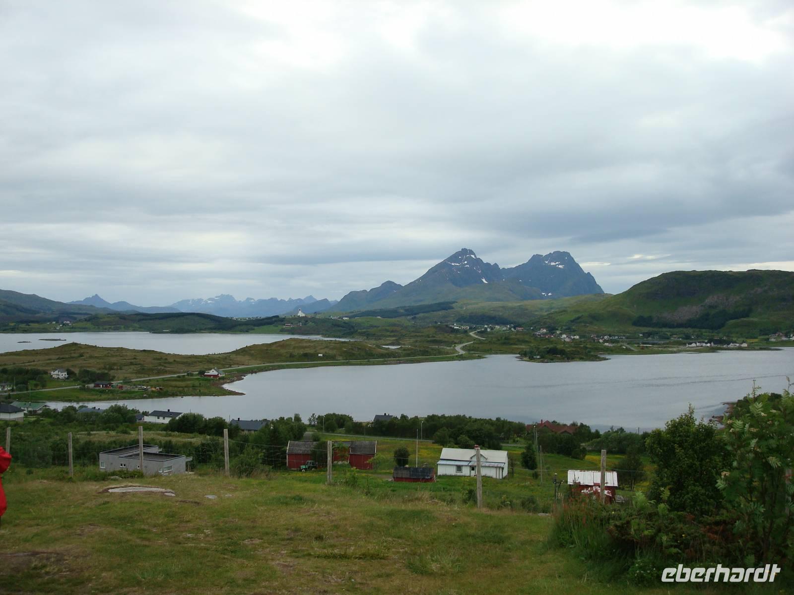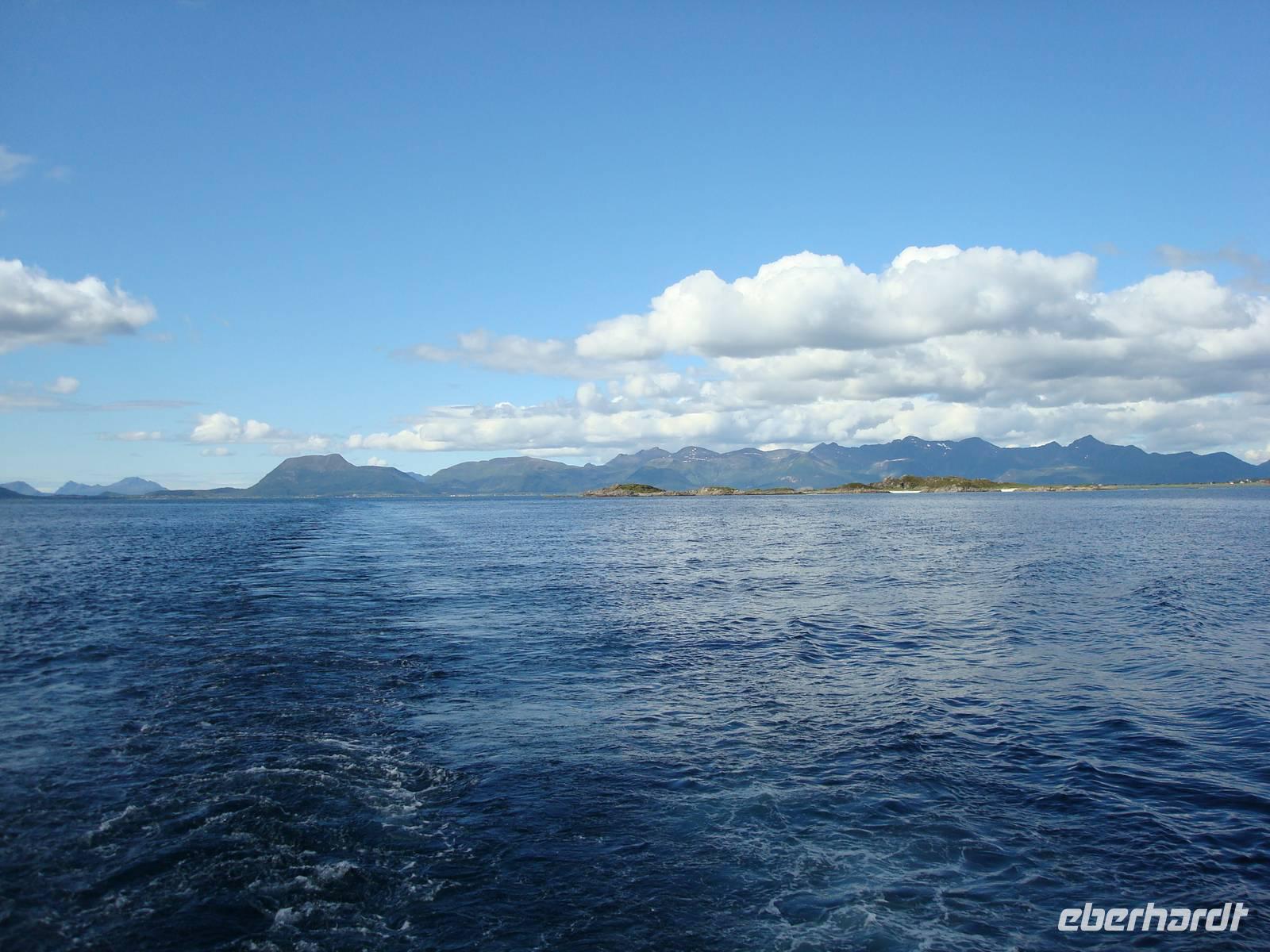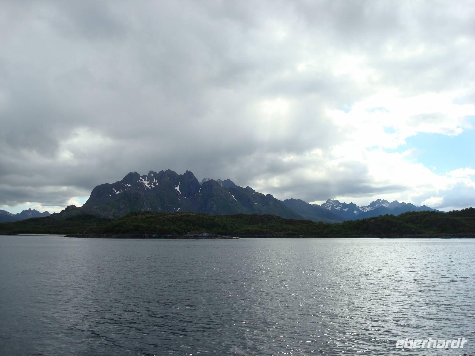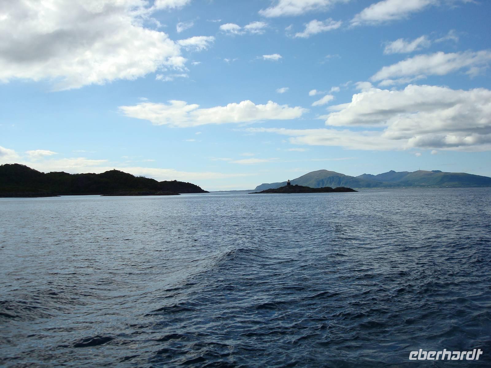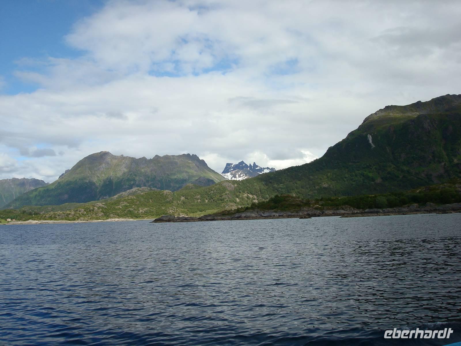 Während der Rückfahrt hatten wir extrem weite Sicht. Es schien sogar, als erblickten wir in der Ferne den Svartisengletscher - ganz klar und deutlich sahen wir auf dem Festland eine riesige Eisfläche. Wir genossen die Fahrt über diese grandiose Inselkette und schossen noch das eine oder andere Foto. Nach einem kurzen Stopp an der größten Holzkirche Nordnorwegens in Kabelvag, gelangten wir zurück nach Svolvaer.