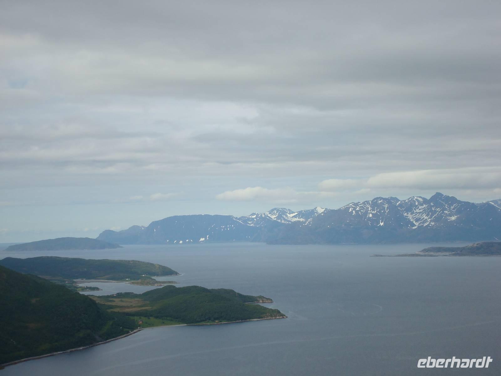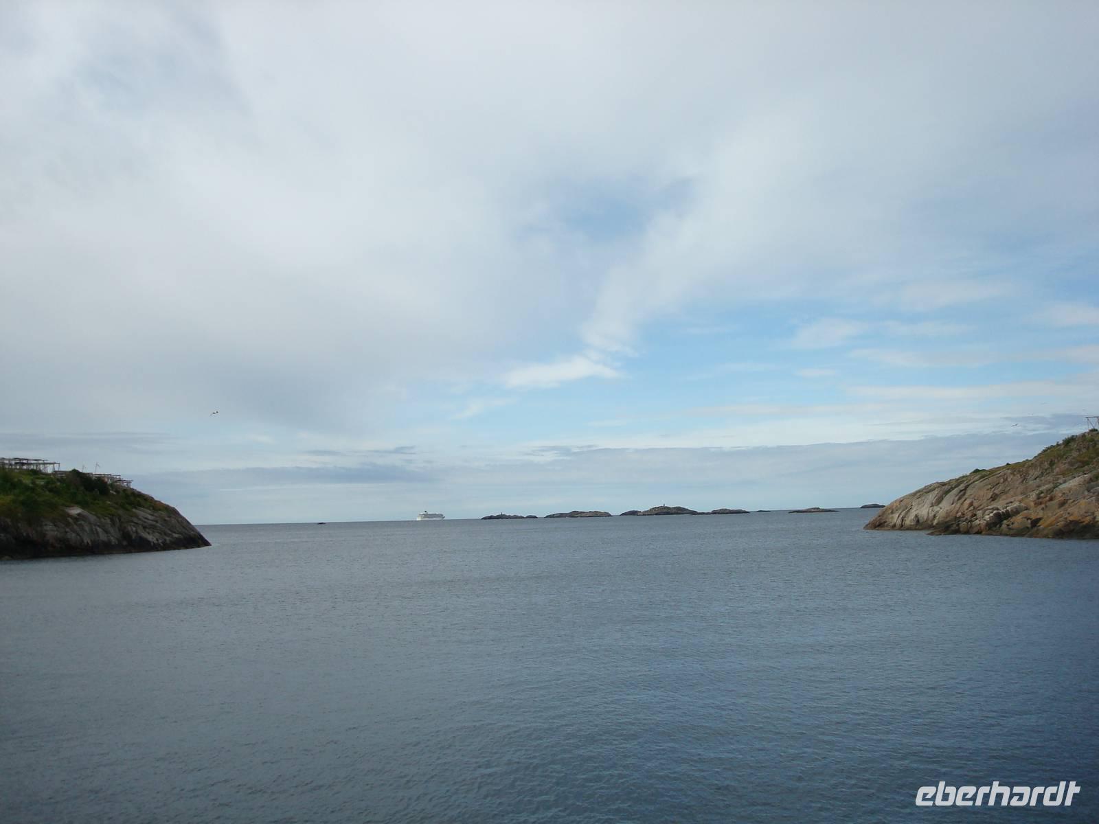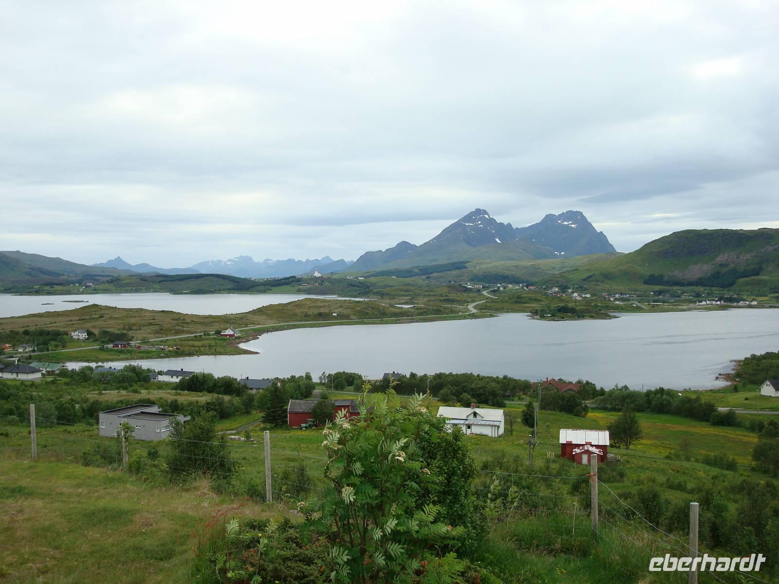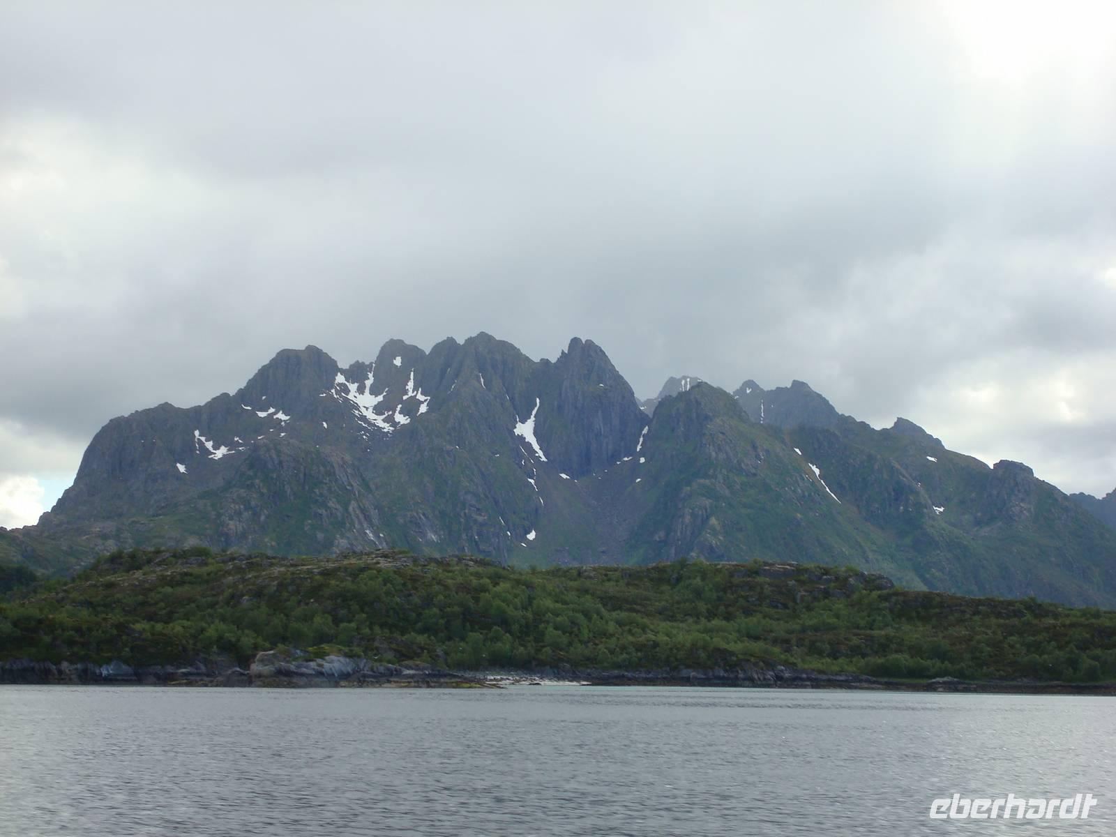 Während der Rückfahrt hatten wir extrem weite Sicht. Es schien sogar, als erblickten wir in der Ferne den Svartisengletscher - ganz klar und deutlich sahen wir auf dem Festland eine riesige Eisfläche. Wir genossen die Fahrt über diese grandiose Inselkette und schossen noch das eine oder andere Foto. Nach einem kurzen Stopp an der größten Holzkirche Nordnorwegens in Kabelvag, gelangten wir zurück nach Svolvaer.