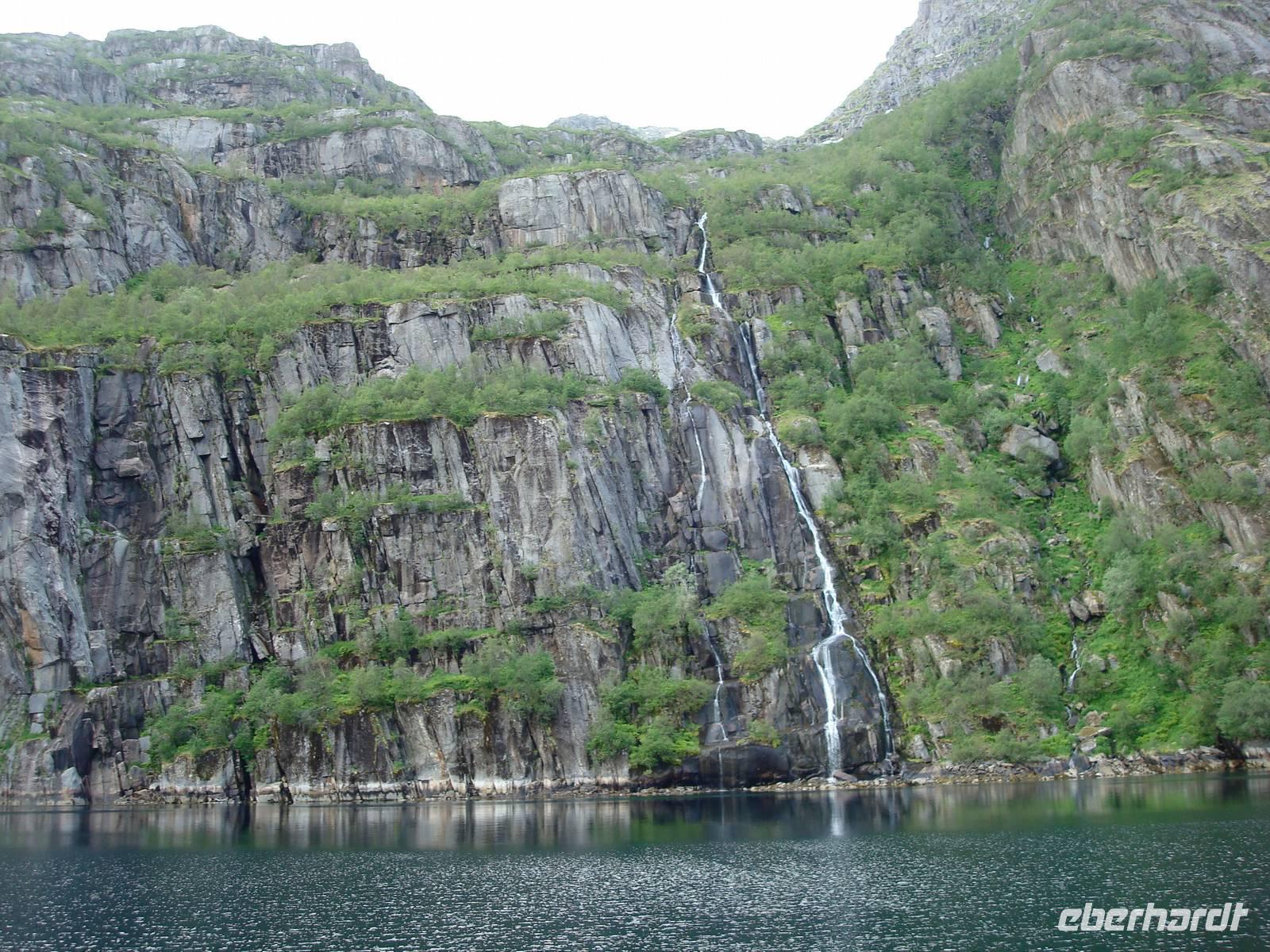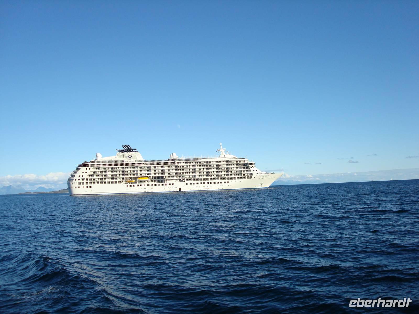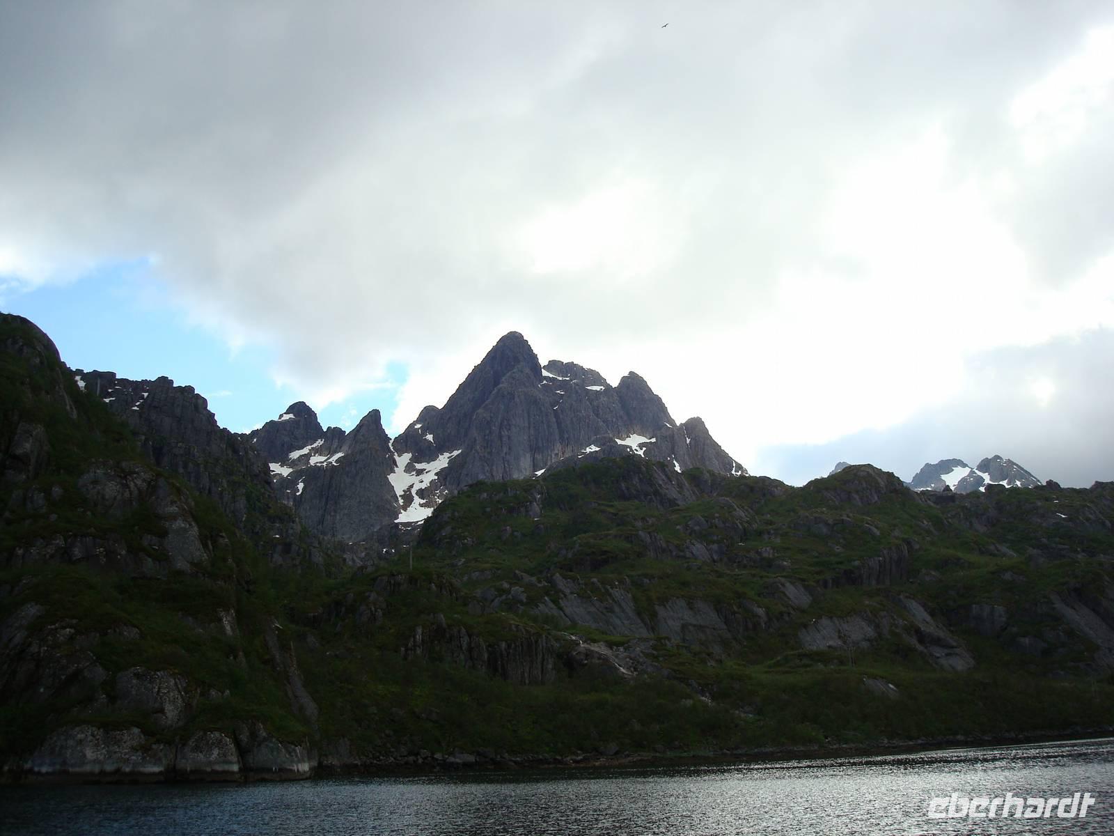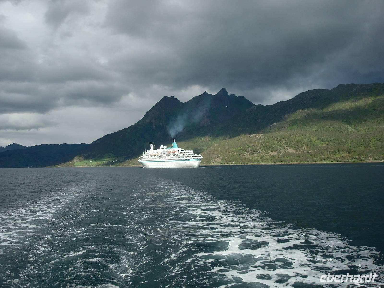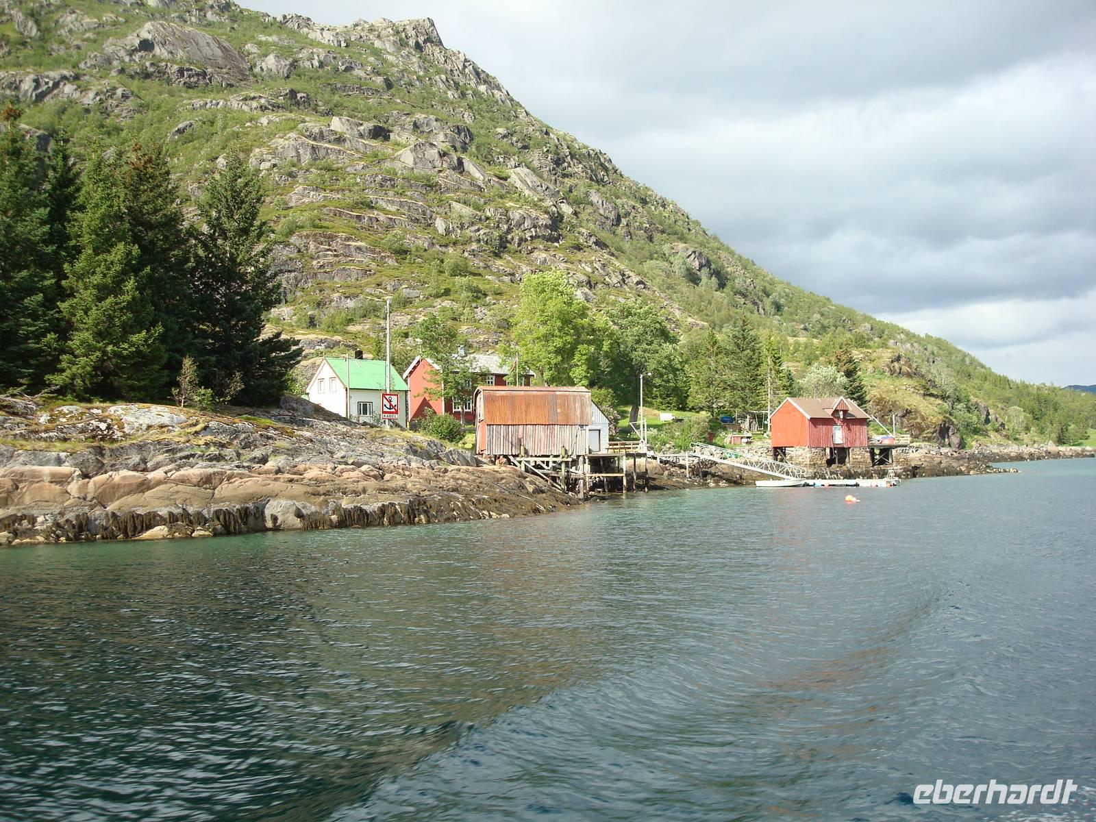 Während der Rückfahrt hatten wir extrem weite Sicht. Es schien sogar, als erblickten wir in der Ferne den Svartisengletscher - ganz klar und deutlich sahen wir auf dem Festland eine riesige Eisfläche. Wir genossen die Fahrt über diese grandiose Inselkette und schossen noch das eine oder andere Foto. Nach einem kurzen Stopp an der größten Holzkirche Nordnorwegens in Kabelvag, gelangten wir zurück nach Svolvaer.