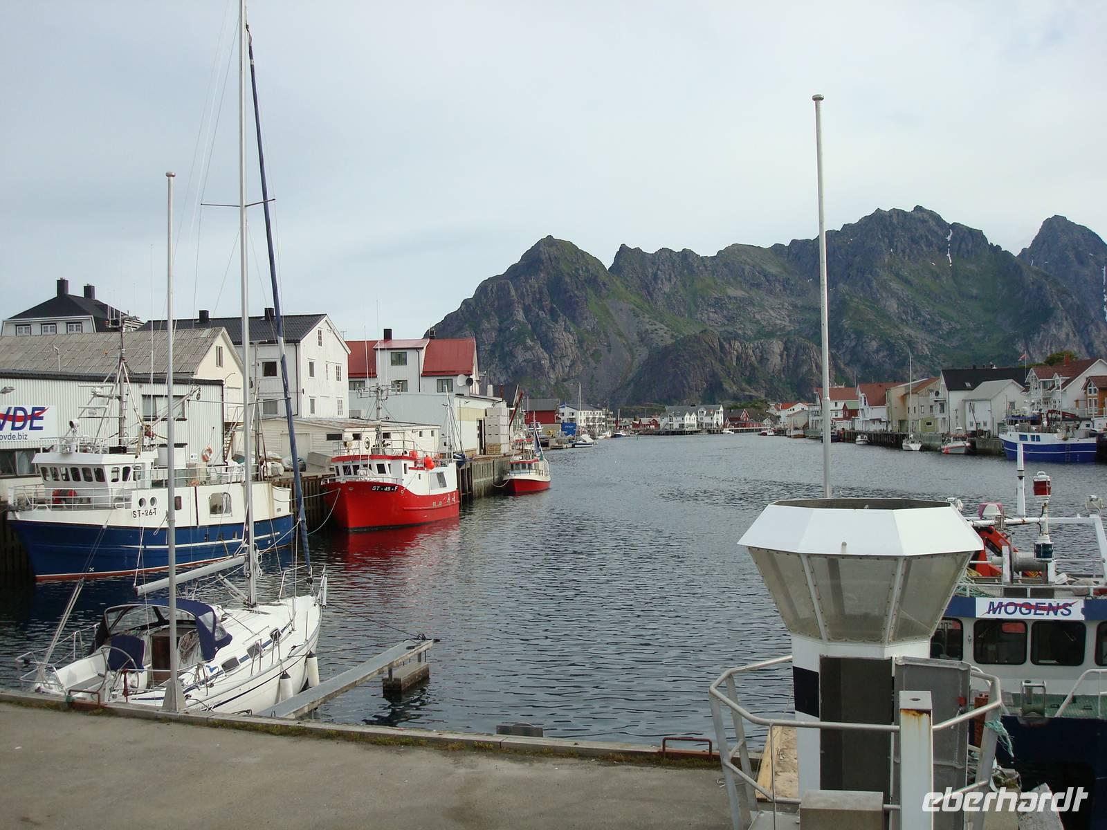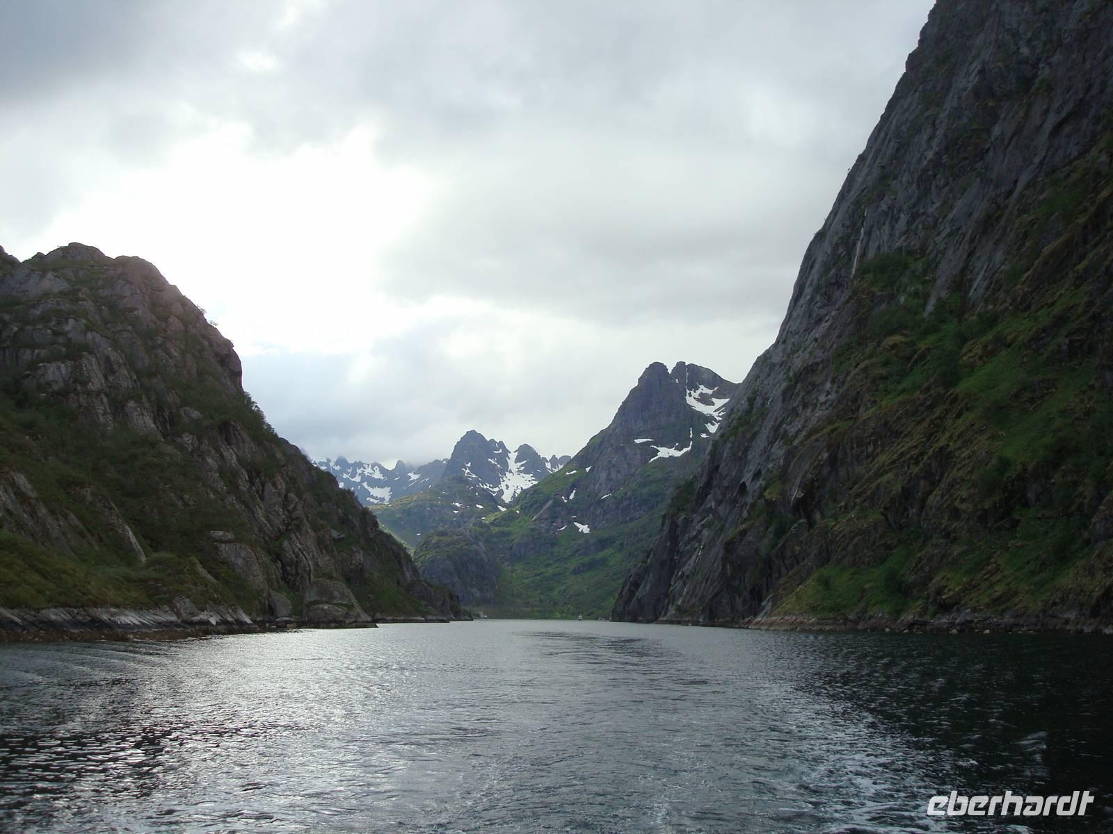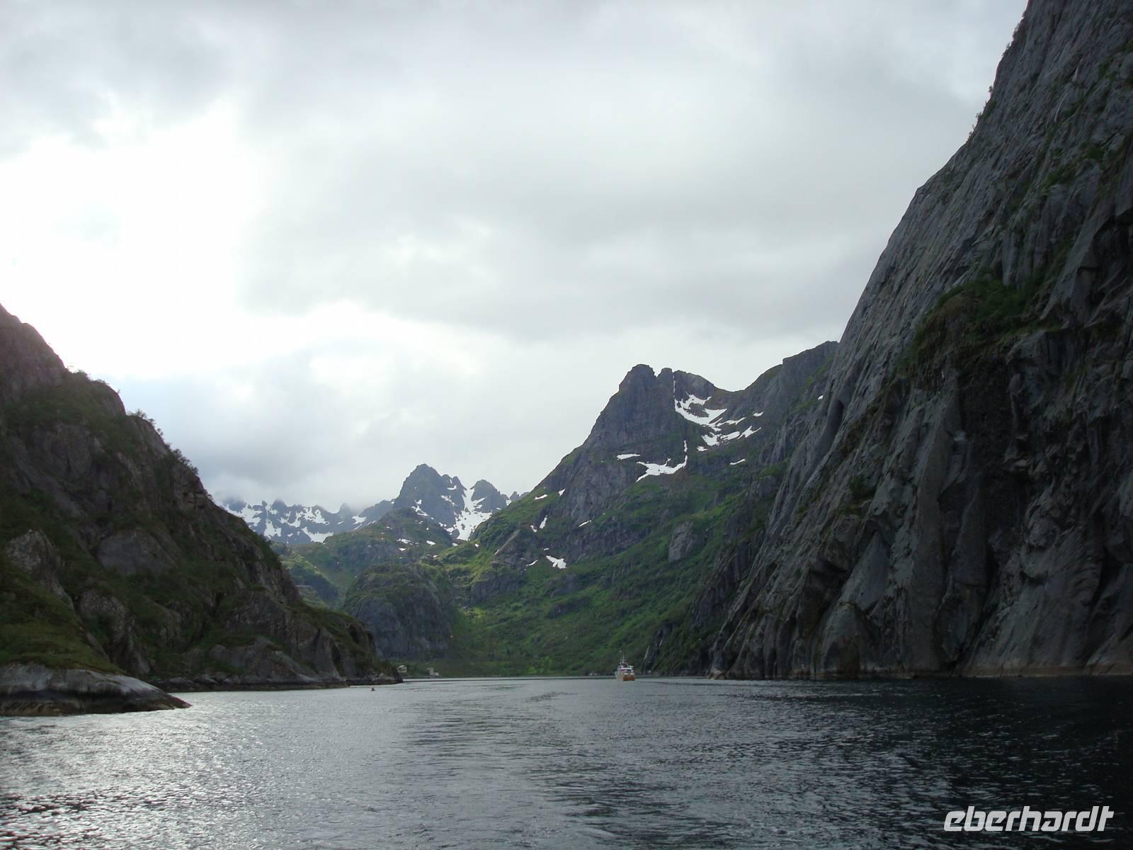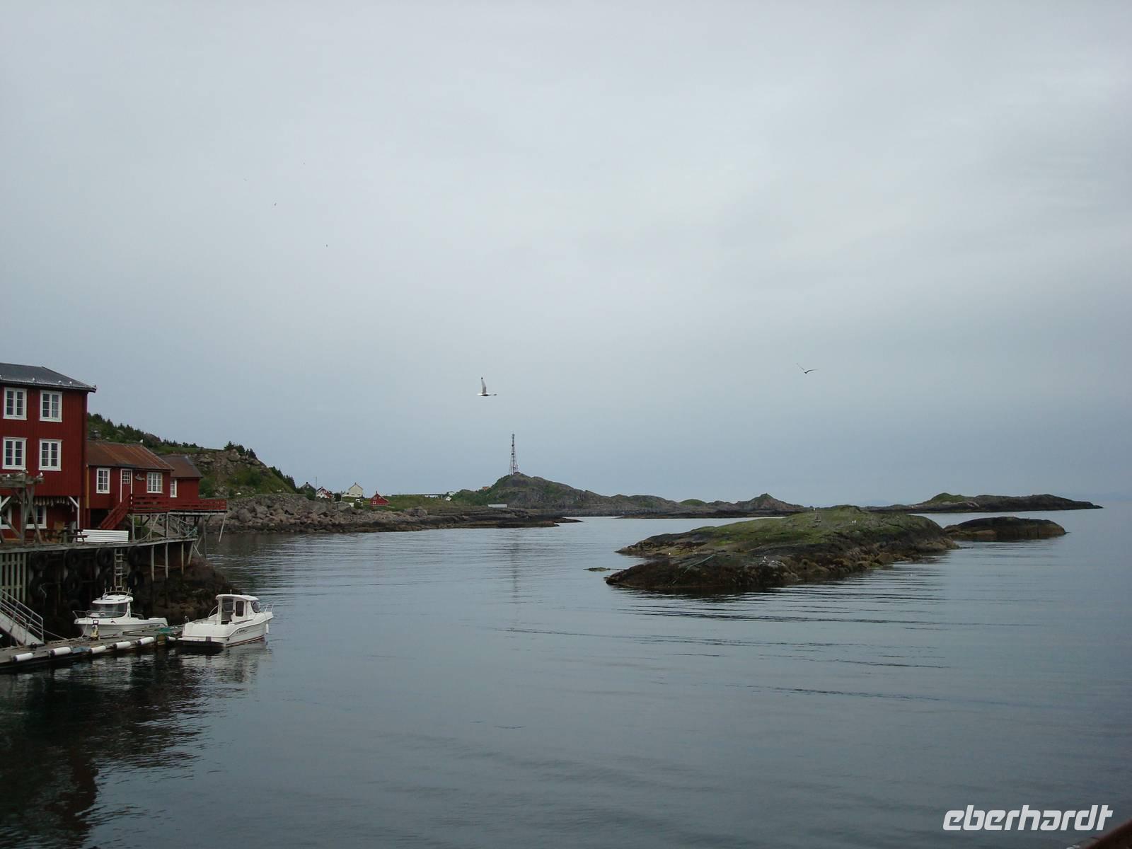 Über die Vesteralen führte uns heute unser Weg: von Harstad über Sortland nach Stokmarknes. Teilweise tauchten in der Ferne schon die Lofoten auf und wir sahen jetzt schon, dass die Berge gigantischer, höher, spitzer und schroffer waren als die der Vesteralen. In Stokmarknes, der Heimat der Hurtigrute, hatten wir genügend Zeit u.a. für einen Besuch des Hurtigrutenmuseums. Die „MS Nordkapp" legte an und wir mit einem kleinen ehemaligen Fischerboot ab (Nostalgie pur - ein Salon aus den 1960er Jahren). Zwischen Vesteralen und Lofoten fuhren wir durch einen ganz engen Sund, den Raftsund. In der Ferne sahen wir die Hurtigrute, welche uns folgte. Oben über den Felsen der hohen Berge kreisten Seeadler. Es ging hinein in den Trollfjord. Gigantisch. Und die Hurtigrute bog tatsächlich auch in diesen Fjord hinein. Da kommt sie doch nie wieder heraus - oh doch J Durch die zerklüftete Landschaft mit vielen Inselchen und Buchten steuerten wir Svolvaer an. Kurz vor dem Hafen fuhr tatsächlich die Hurtigrute an uns vorbei, eben die „Schnelle Rute" J Die Fischerfrau grüßte bei der Einfahrt in den Hafen. Von der Anlegestelle waren es nur wenige Schritte bis zum Hotel. Wir freuten uns auf eine warme Dusche und ein leckeres Abendbrot. Unmittelbar im Zentrum Svolvaers konnten bei einem Spaziergang so manche besonderen Entdeckungen gemacht werden, wie Stockfischgerüste, Rorbuer, Geschäfte ....