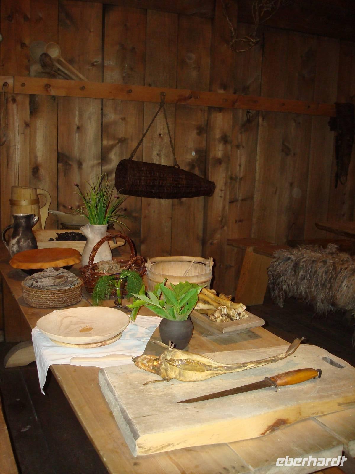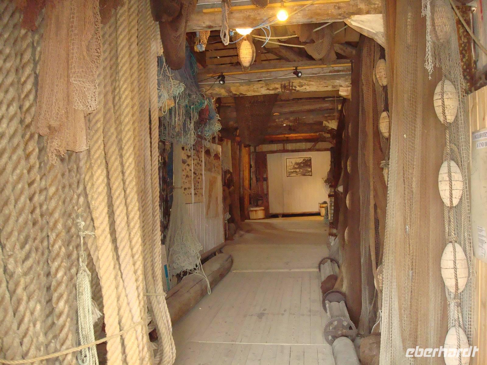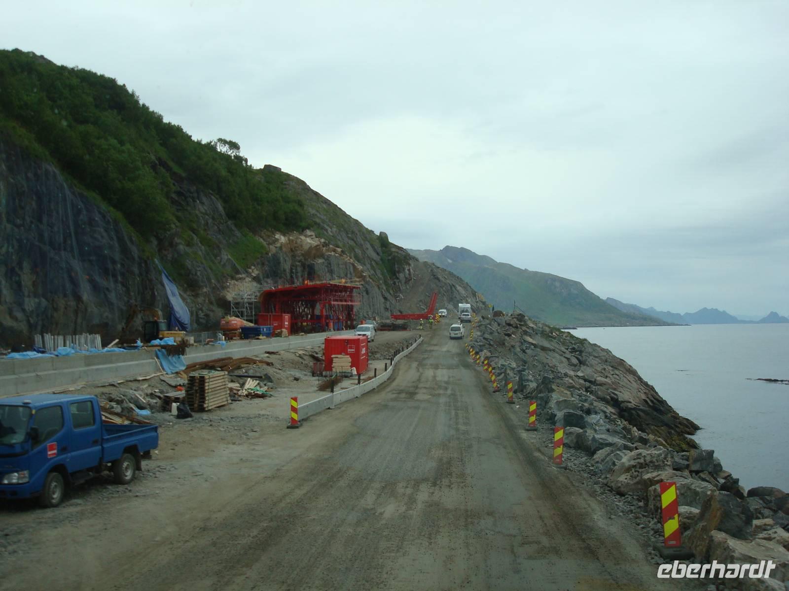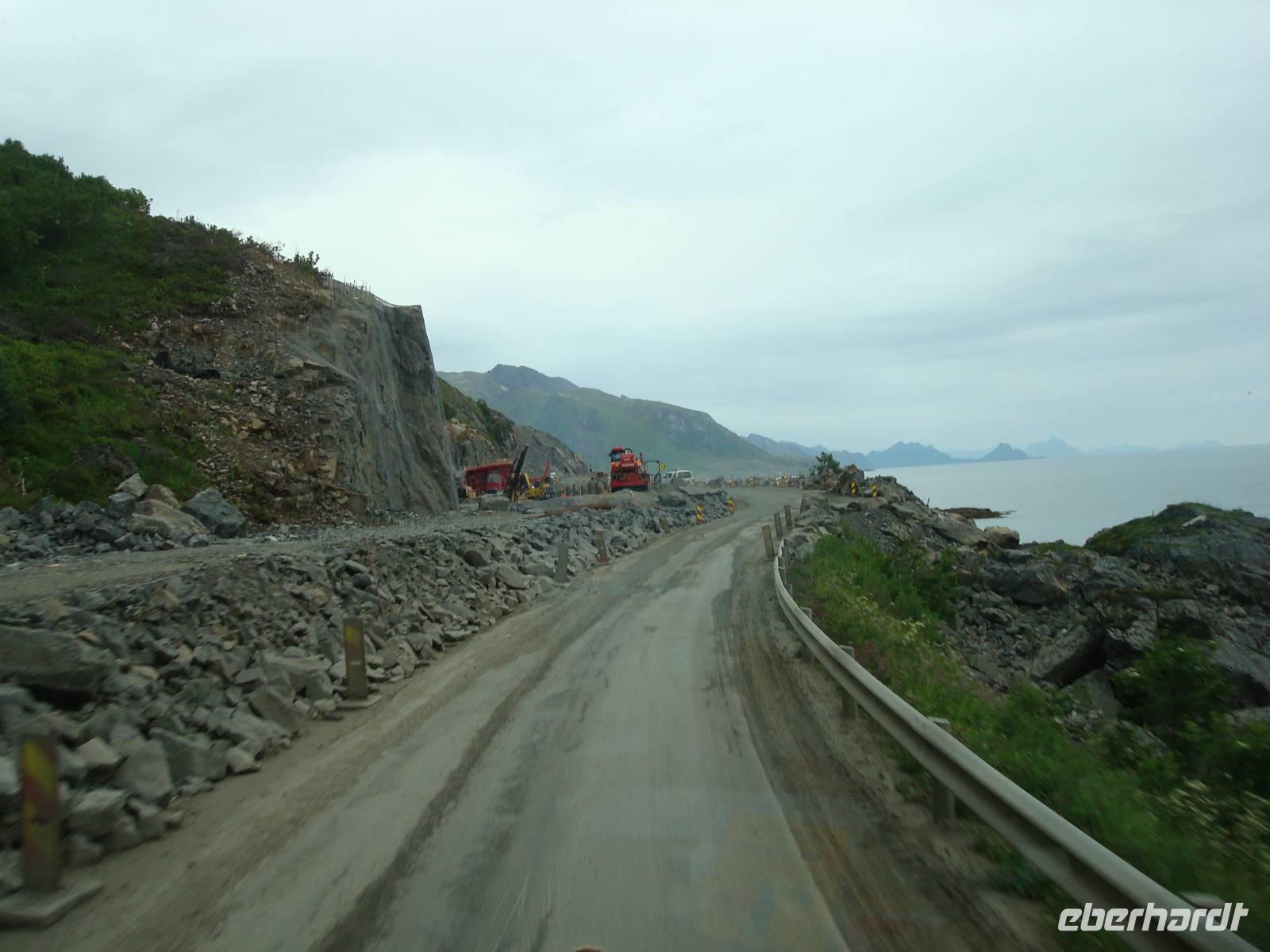 Über die Mythologie, die Lebensweise der Wikinger und die Geschichte des Hofes, erfuhren wir in einem Film. Mit modernen Audioguides ausgerüstet, konnten alle selbst für sich interessante Gegenstände und Hintergründe erkunden. Im lebendigen Museum - einen originalgetreuen Nachbaus des Hofes lernten wir das Leben auf dem Hof mit allen Handwerken der damaligen Zeit kennen. Die Herrin des Hofes stellte sich vor. Mit ihrem Trinkspruch beschwor sie die Götter und „skolte" uns zu. Zum Schluss spielte sie noch ein Lied auf einem eigentümlichen Instrument. War das ein Birkenzweig? Mit einer deftigen Lammsuppe mit Brot und Sauerrahm endete die Führung und jeder hatte noch etwas Zeit für eigene Entdeckungen. Gestärkt fuhren wir weiter. Unser heutiges Ziel sollte A i Lofoten sein, am südlichsten Zipfel der Inselkette, dort wo die E10 endet, jede Straße endet. Unterwegs passierten wir riesige Baustellen für einen neuen Straßenverlauf der E10. Neue Tunnel entstehen und riesige Felsen werden weggesprengt. In A angekommen freuten wir uns auf die Zimtkringel aus der historischen Bäckerei. Nur leider ... die waren alle. Deshalb hier das historische Rezept für genügend Zimtkringel J