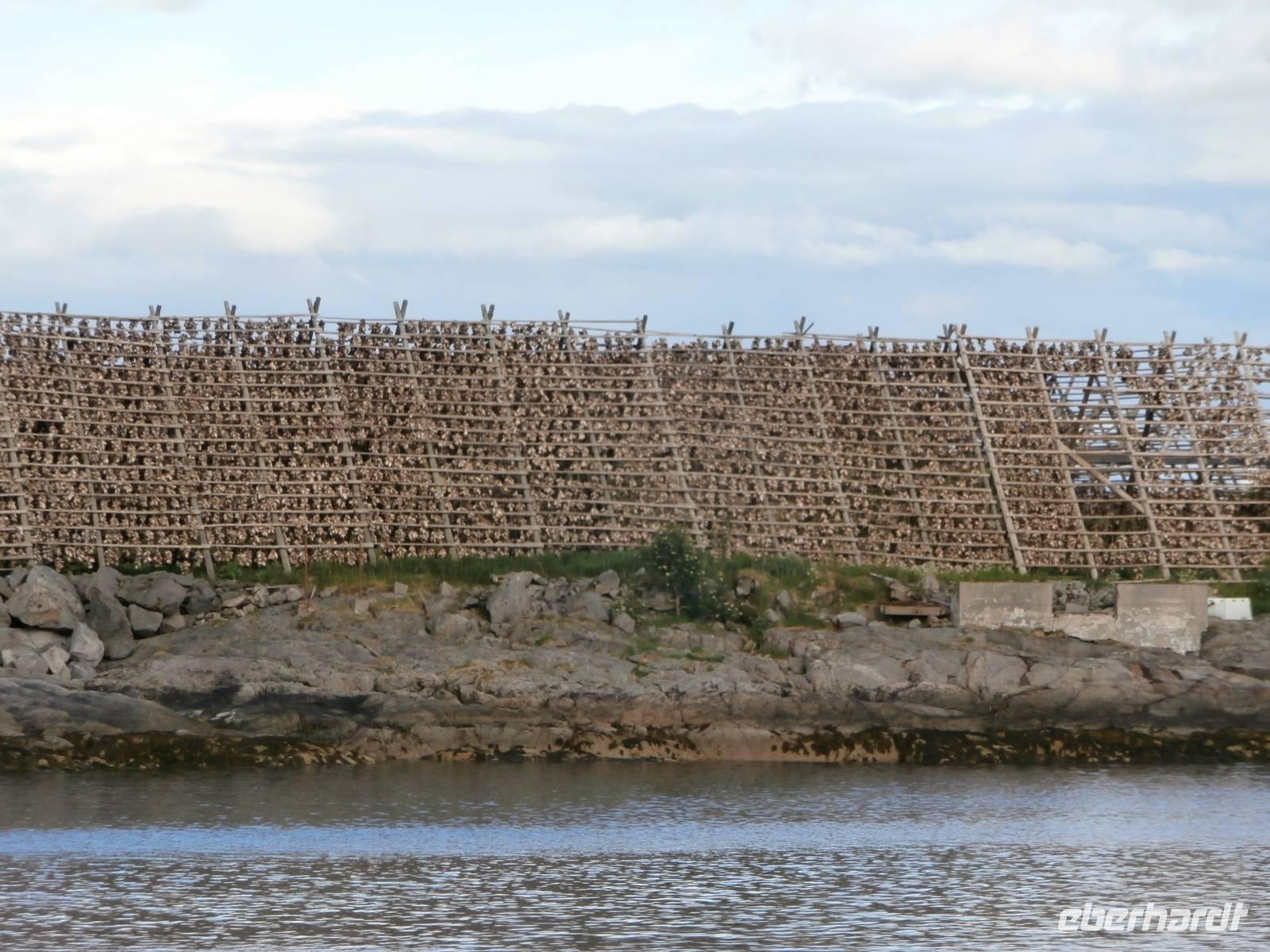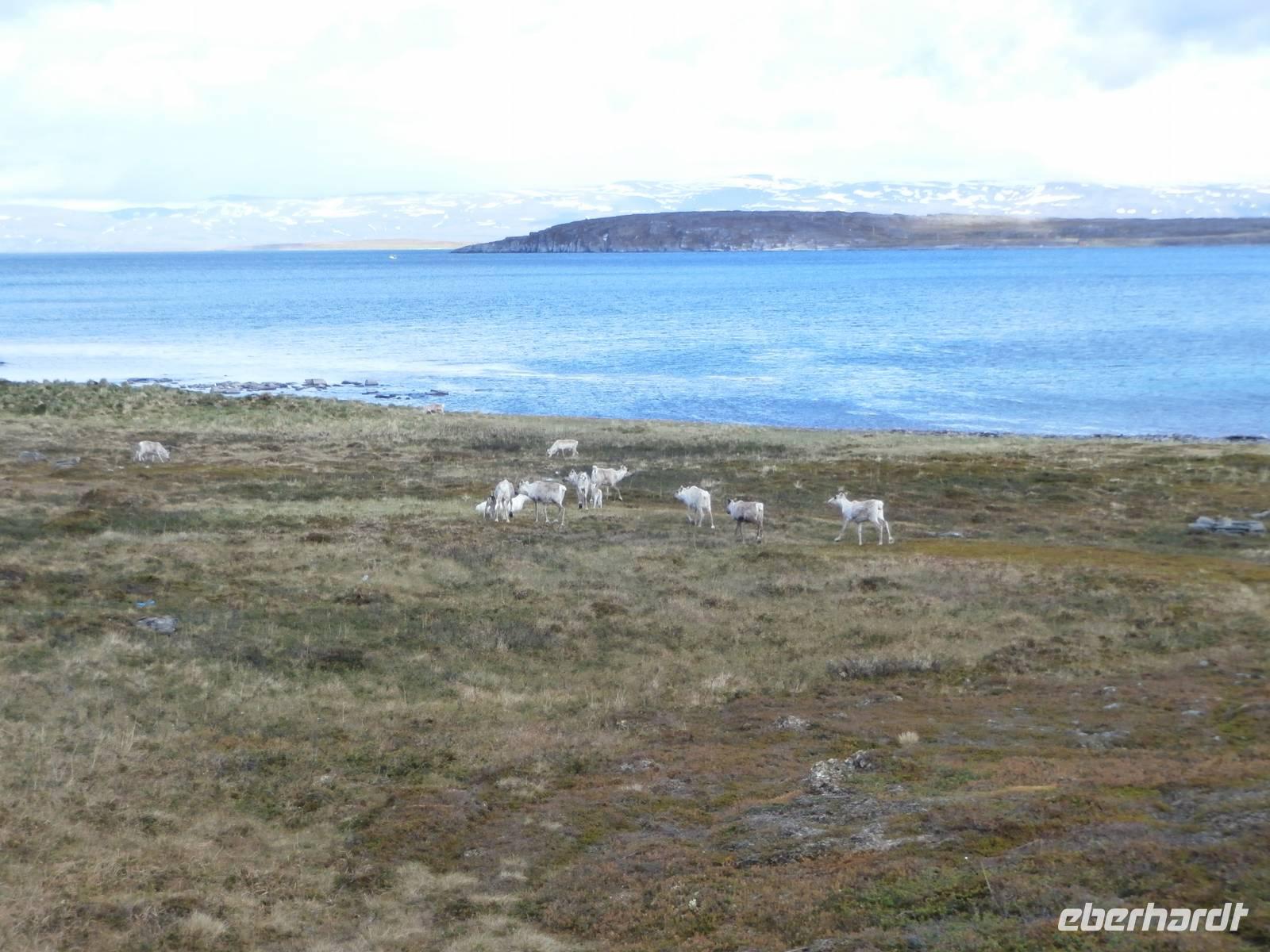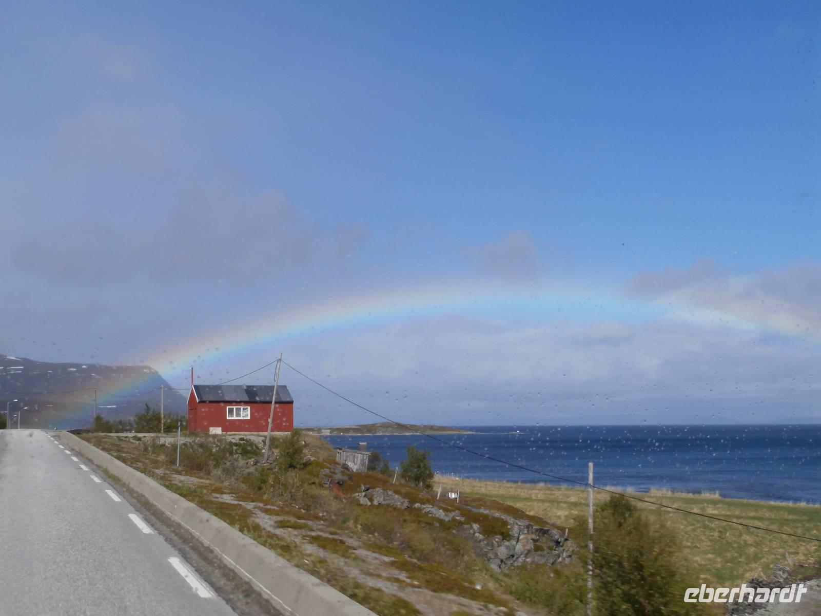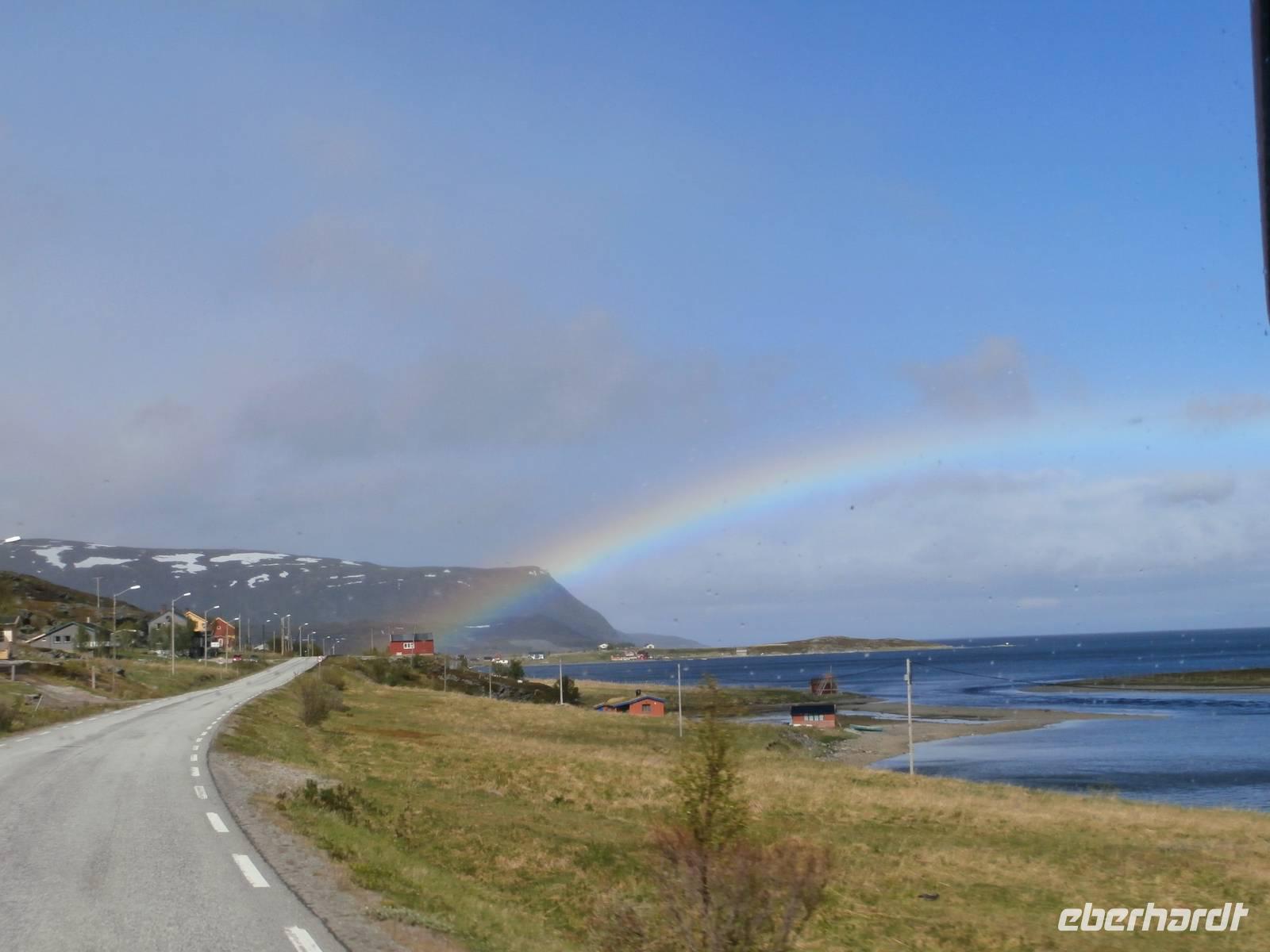 Kaffeestopp haben wir heute am Porsangerfjord bei schönem Wetter. Auch Rentiere kreuzen heute unseren Weg, teilweise rennen sie kurz vorm Bus über die Fahrbahn. Einen gigantischen Regenbogen können wir am Porsangerfjord vor der Kulisse eines Trockenfischgestelles aufnehmen und in der Silberschmiede zu Russens bekommen wir vom Chef eine Einweisung in die Geschichte des Stockfisches und Schmuck und Ansichtskarten werden hier eingekauft.