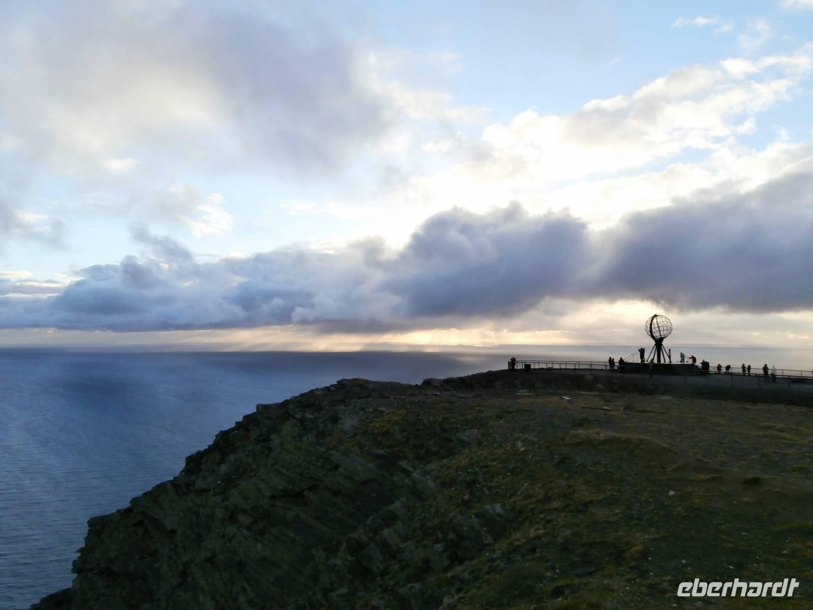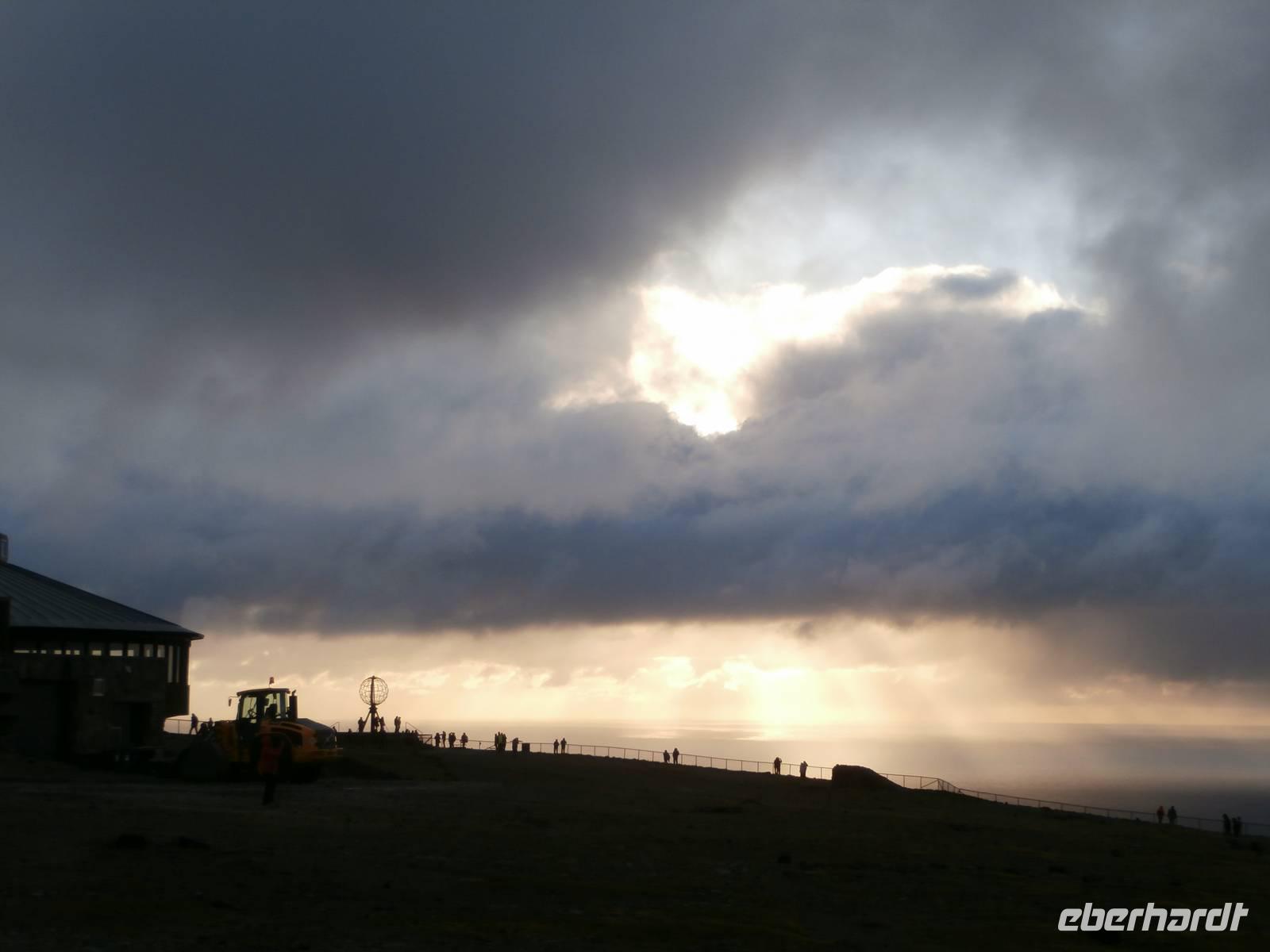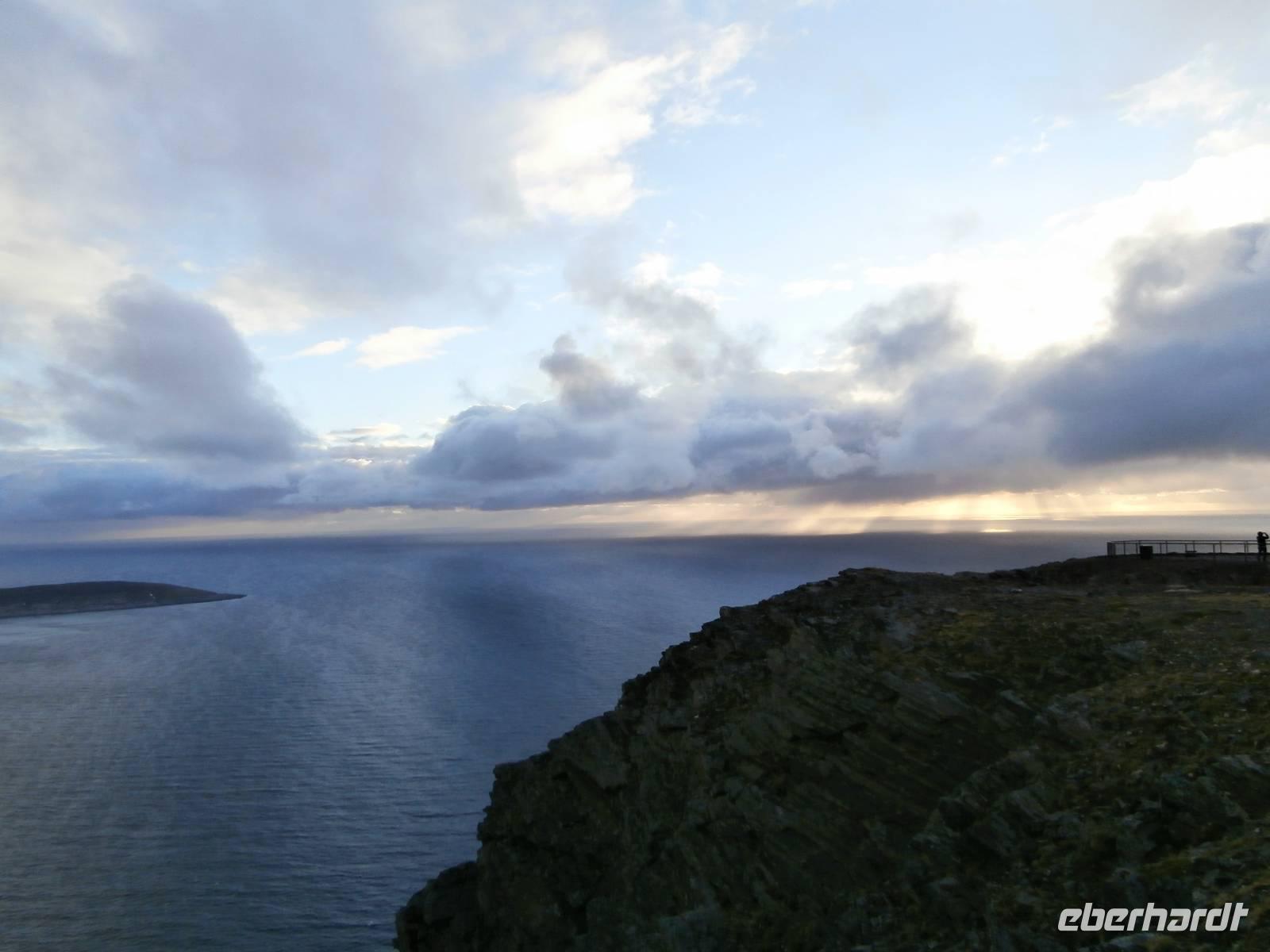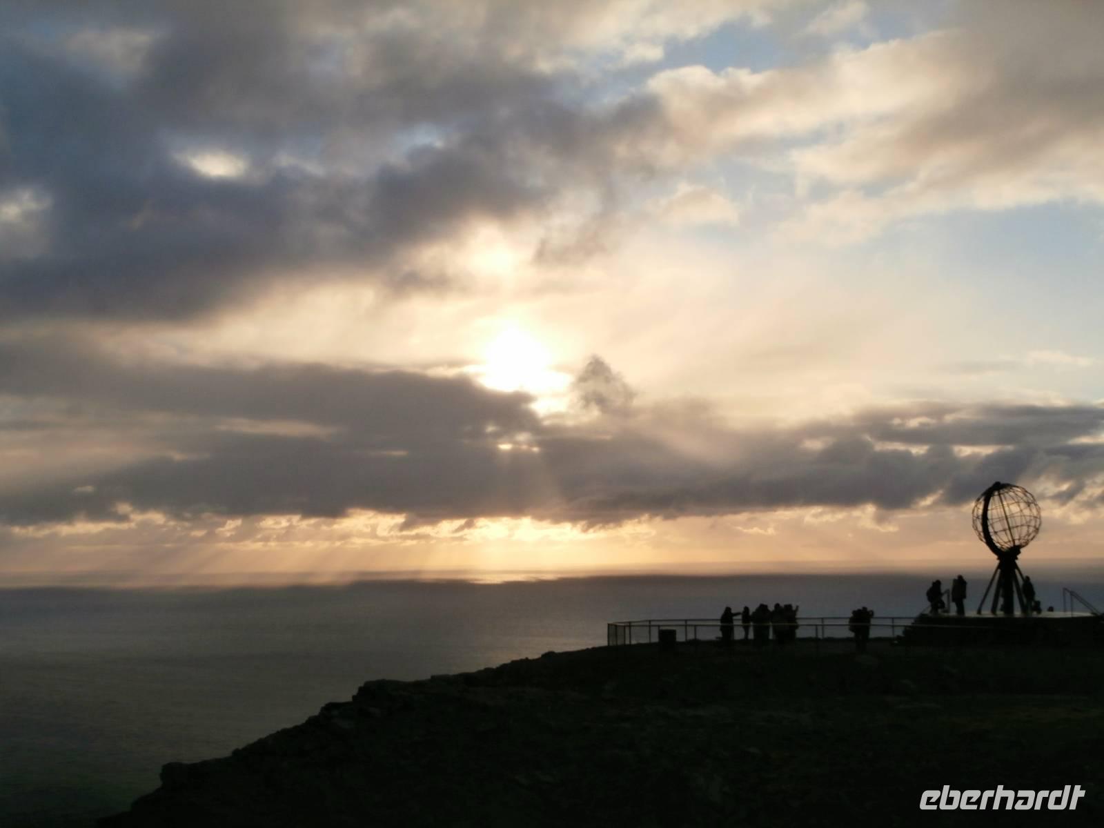 Durch den Nordkaptunnel gelangen wir auf die Insel Mageroya und übernachten heute in Honningsvag Skipsfjorden im Rica Hotel Nordkap. 21:00 Uhr starten wir mit Ivan, unserem estnischen Busfahrer, zum Nordkap. Mit Regenschauern, Kälte und Wind erleben wir in dieser Nacht den Tag am Nordkap. Ein Gruppenfoto nehmen wir auch auf, Filmvorführung und Postkarten an die Lieben zu Haus stehen noch auf dem Programm. Im Bus geben wir unseren Gästen ein Glas Sekt aus und Jeder bekommt sein Nordkap Diplom vom Reiseunternehmen Eberhardt überreicht.