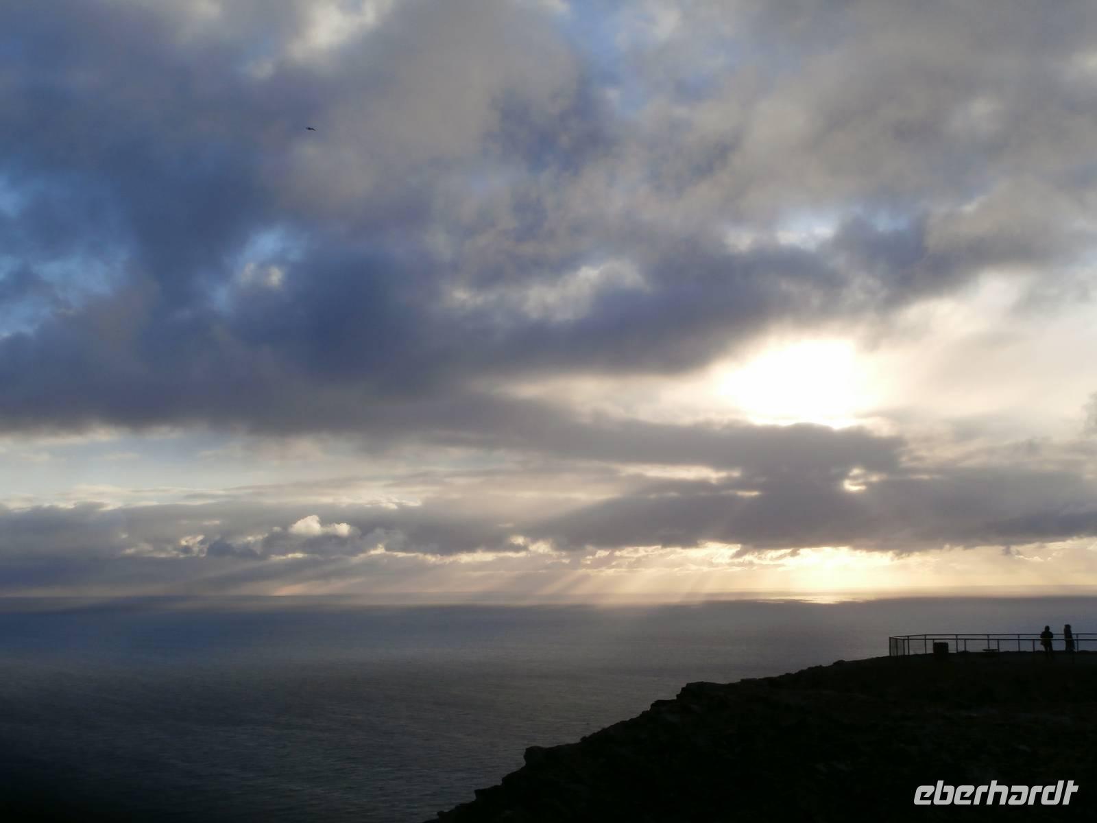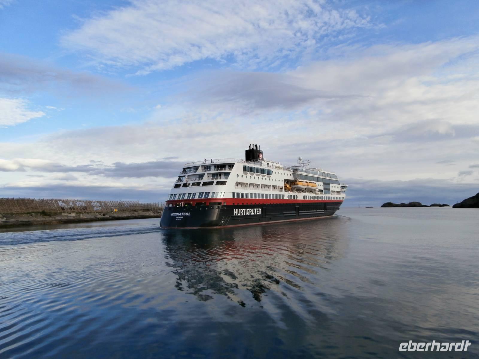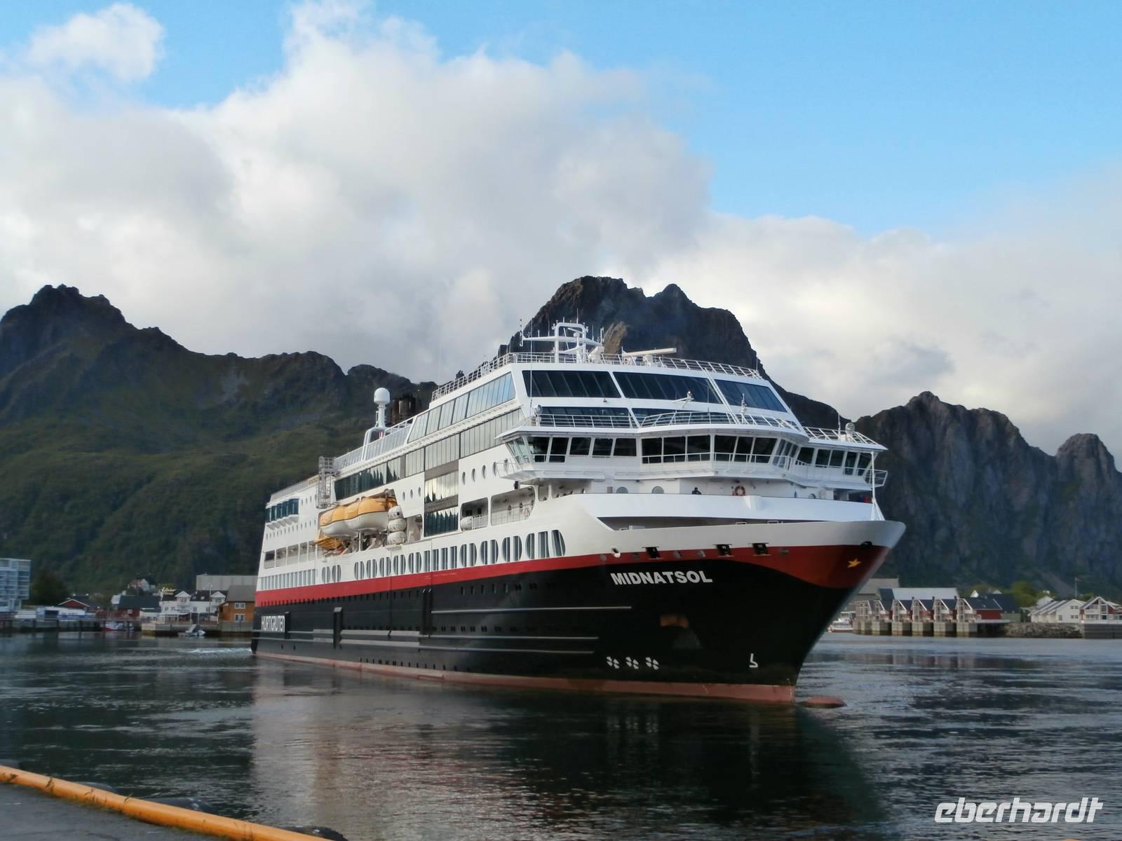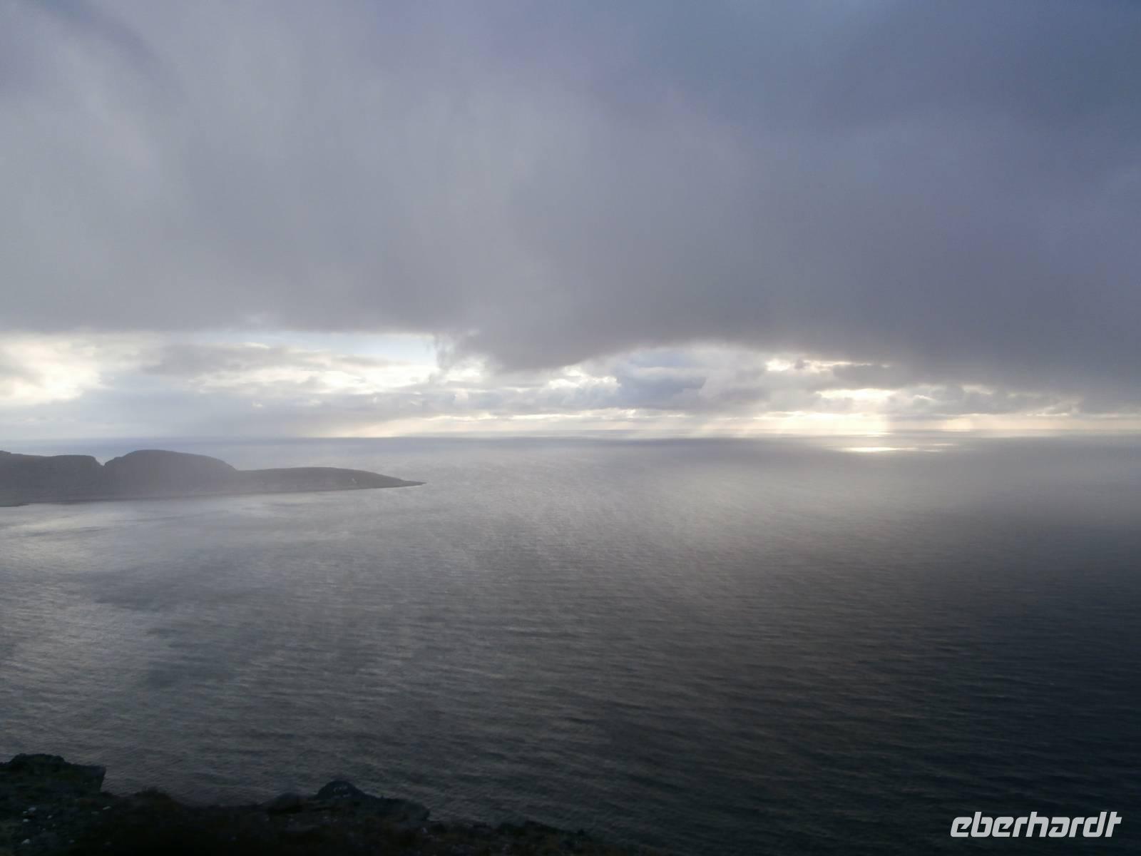 Durch den Nordkaptunnel gelangen wir auf die Insel Mageroya und übernachten heute in Honningsvag Skipsfjorden im Rica Hotel Nordkap. 21:00 Uhr starten wir mit Ivan, unserem estnischen Busfahrer, zum Nordkap. Mit Regenschauern, Kälte und Wind erleben wir in dieser Nacht den Tag am Nordkap. Ein Gruppenfoto nehmen wir auch auf, Filmvorführung und Postkarten an die Lieben zu Haus stehen noch auf dem Programm. Im Bus geben wir unseren Gästen ein Glas Sekt aus und Jeder bekommt sein Nordkap Diplom vom Reiseunternehmen Eberhardt überreicht.