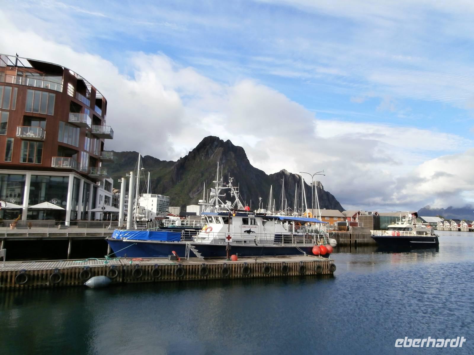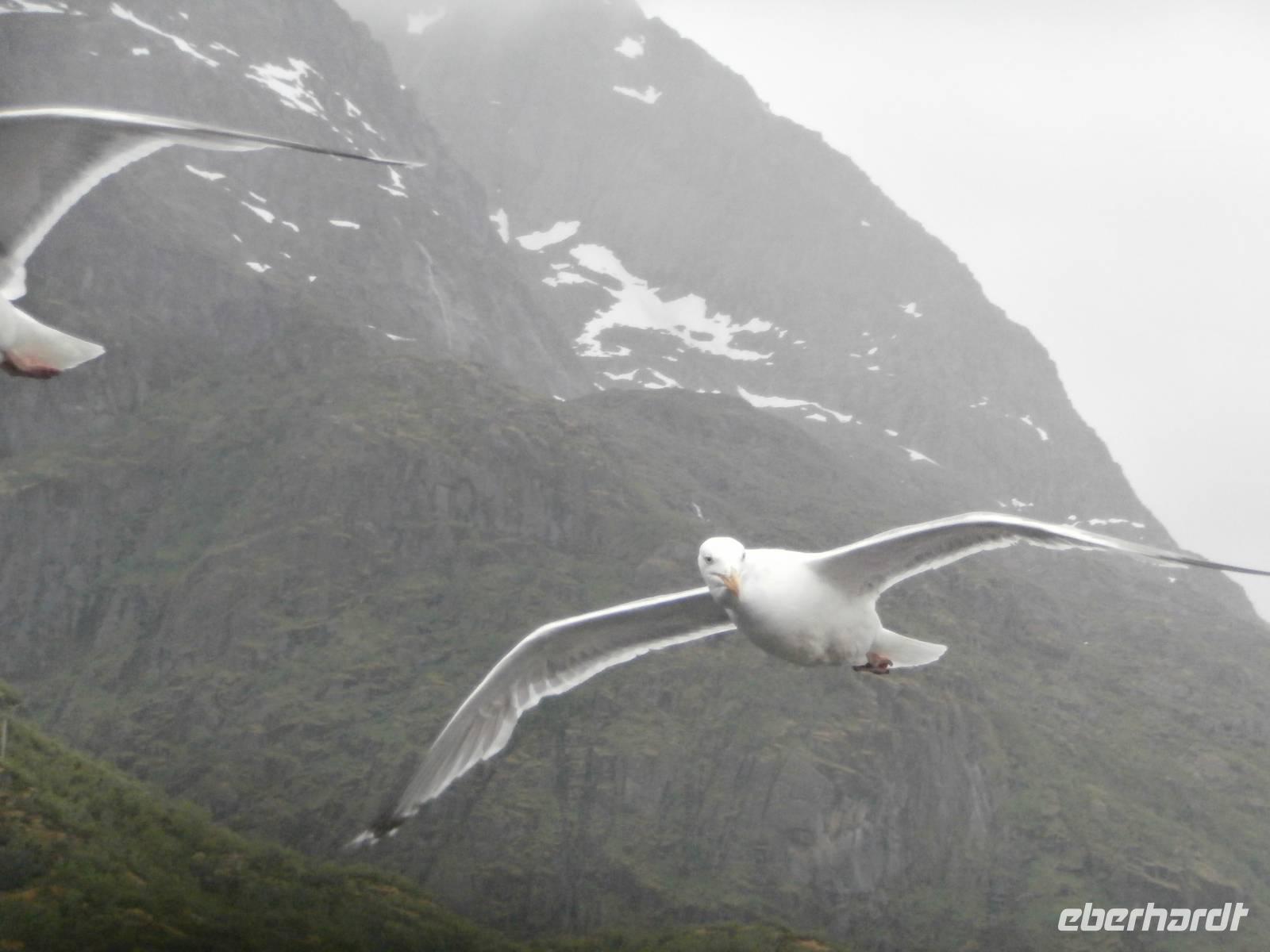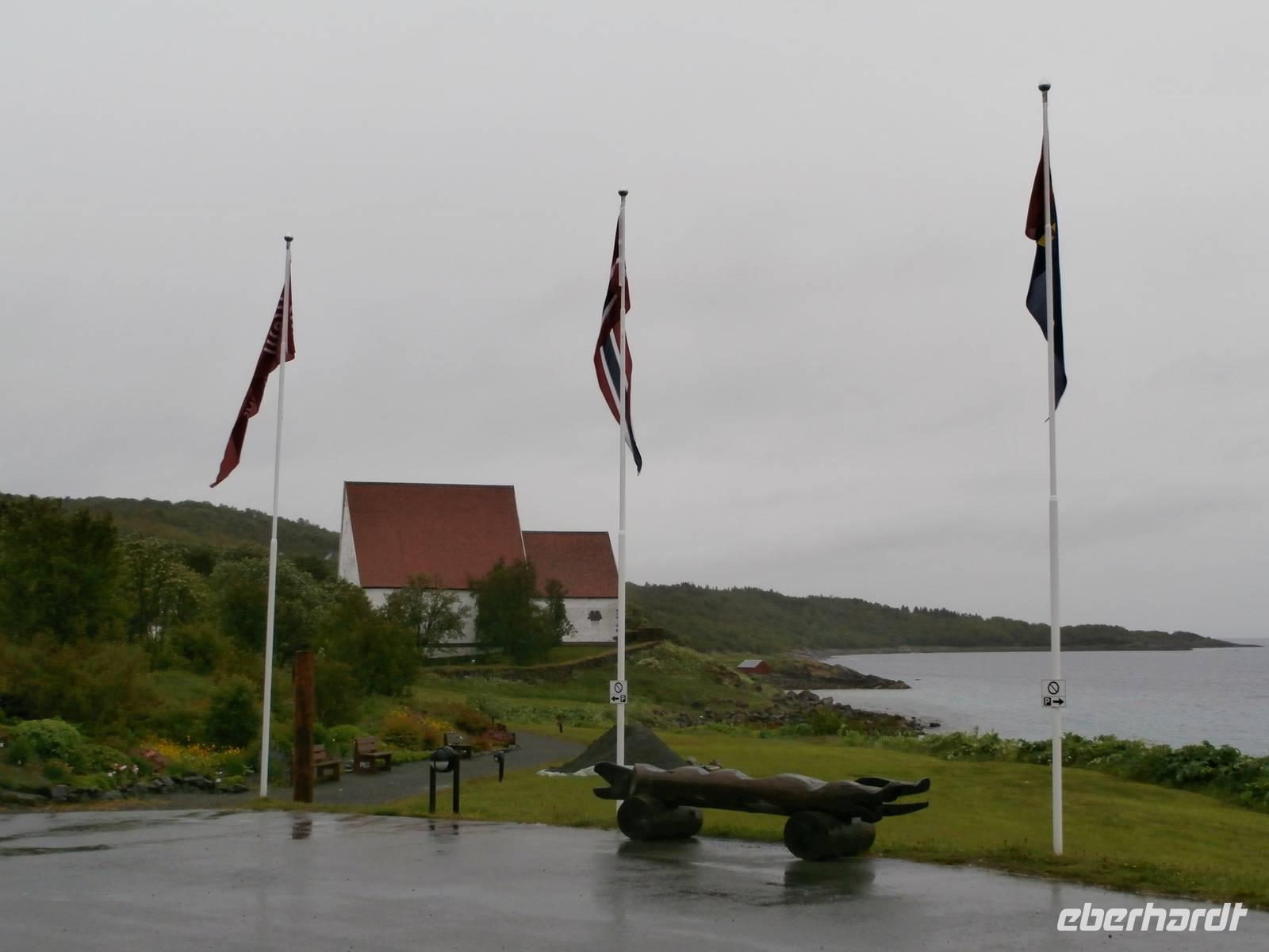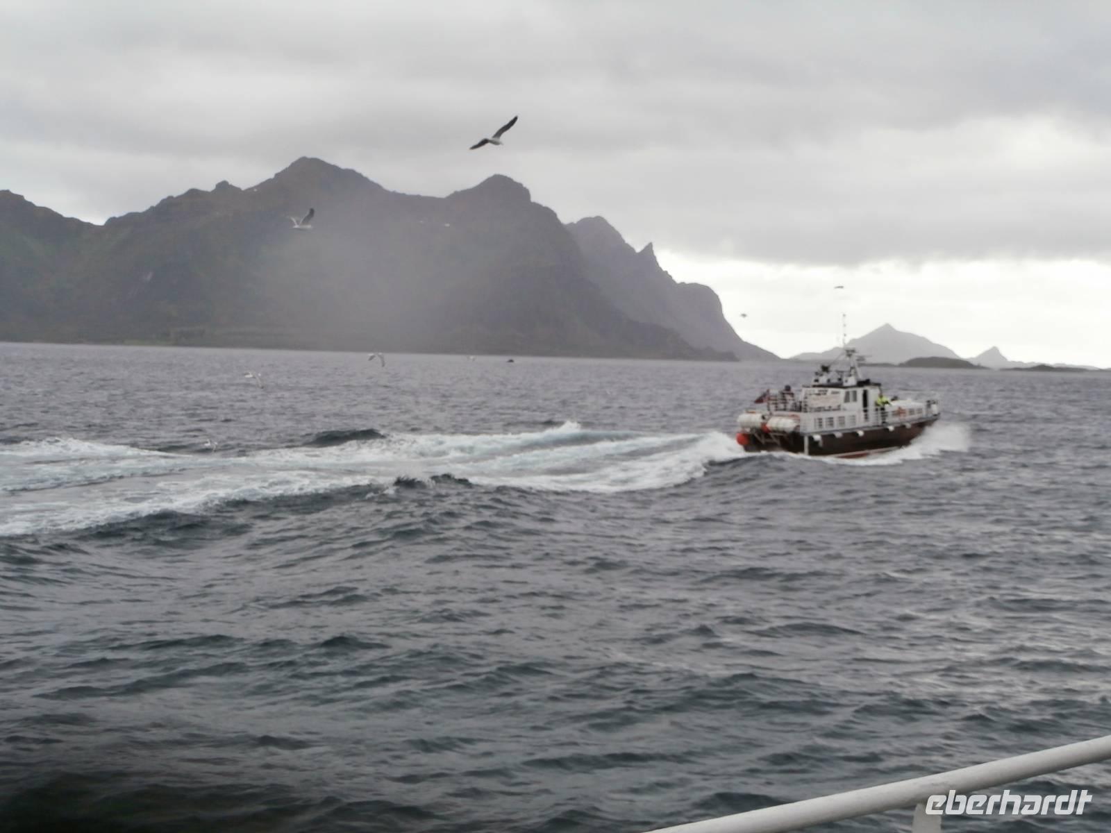 Zur Halbinsel Trondenes führt uns der Weg am Morgen, wieder mit Regen und Kälte sind wir unterwegs. Hier sehen wir uns die alte Steinkirche mit der noch im Original erhaltenen Eingangstür mit eingelassener Elle an. Im historischen Center kaufen wir noch ein, viele Gäste schauen auch in die Ausstellung hinein und ein Film wird uns auch gezeigt. Wir erleben die Fahrt auf einem kleinen Schiff durch den Raftsundet und den Trollfjorden zu unserer Seeadler Safari. Oben draußen auf Deck ist es kalt und windig, auch Regen kann uns nicht abhalten, der Anlockung von Seeadlern mit Fisch beizuwohnen. Mit Kaffee, Tee und leckerer Fischsuppe verwöhnt uns die Crew. In Svolvär werden wir von Roy im Hafen am Thon Hotel empfangen. Leider sind nicht alle Gäste mit den Zimmern zufrieden und auch Buschauffeur und Reiseleitung werden hier gar ausquartiert.