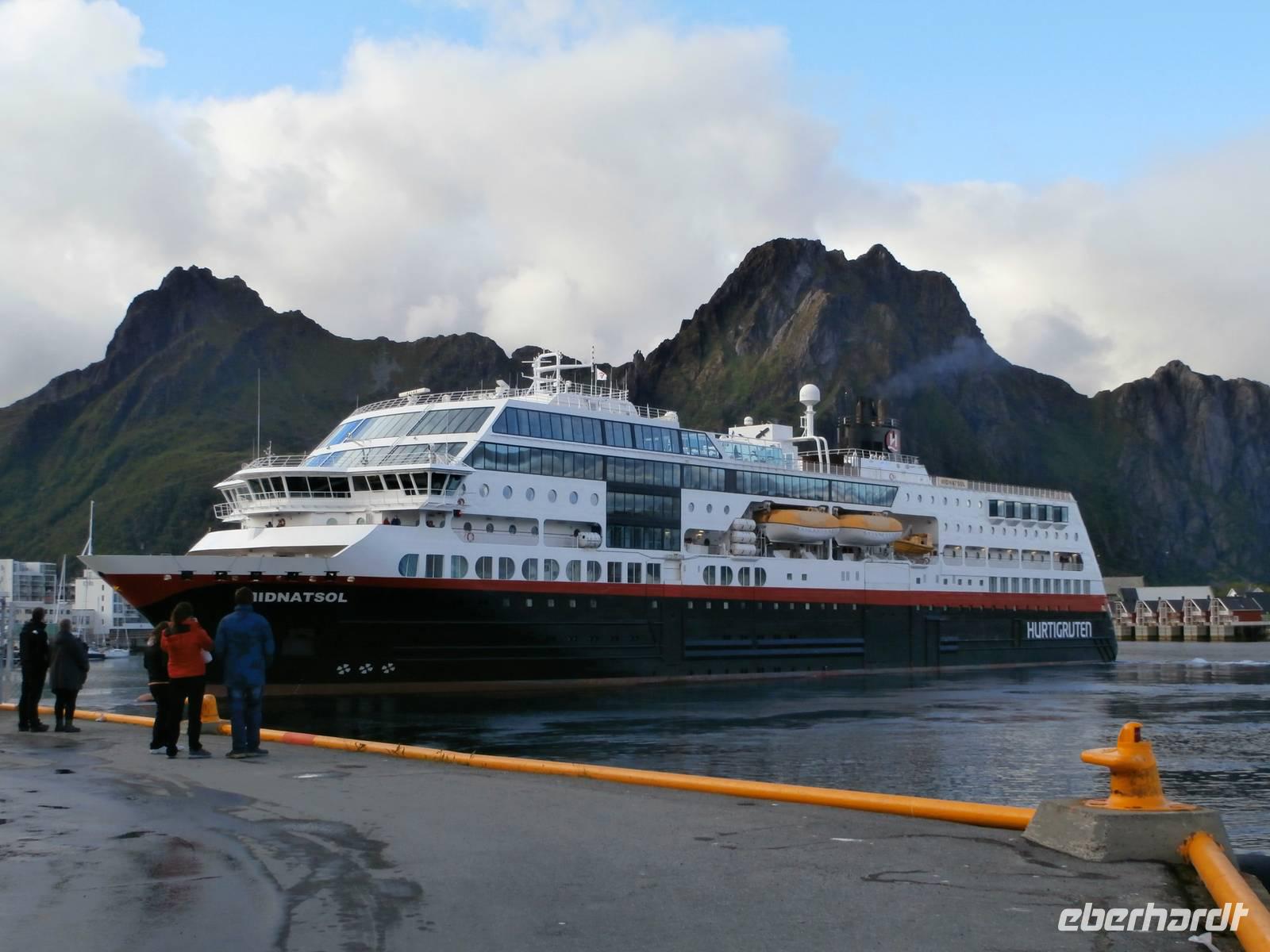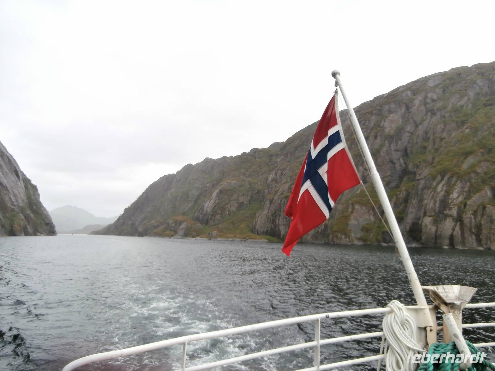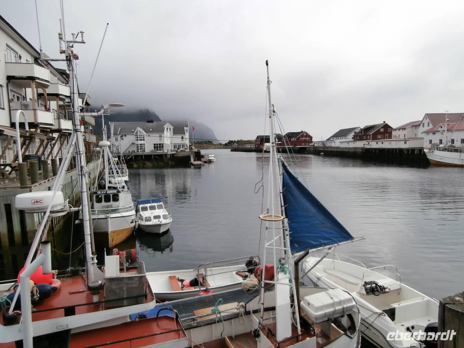 Zur Halbinsel Trondenes führt uns der Weg am Morgen, wieder mit Regen und Kälte sind wir unterwegs. Hier sehen wir uns die alte Steinkirche mit der noch im Original erhaltenen Eingangstür mit eingelassener Elle an. Im historischen Center kaufen wir noch ein, viele Gäste schauen auch in die Ausstellung hinein und ein Film wird uns auch gezeigt. Wir erleben die Fahrt auf einem kleinen Schiff durch den Raftsundet und den Trollfjorden zu unserer Seeadler Safari. Oben draußen auf Deck ist es kalt und windig, auch Regen kann uns nicht abhalten, der Anlockung von Seeadlern mit Fisch beizuwohnen. Mit Kaffee, Tee und leckerer Fischsuppe verwöhnt uns die Crew. In Svolvär werden wir von Roy im Hafen am Thon Hotel empfangen. Leider sind nicht alle Gäste mit den Zimmern zufrieden und auch Buschauffeur und Reiseleitung werden hier gar ausquartiert.