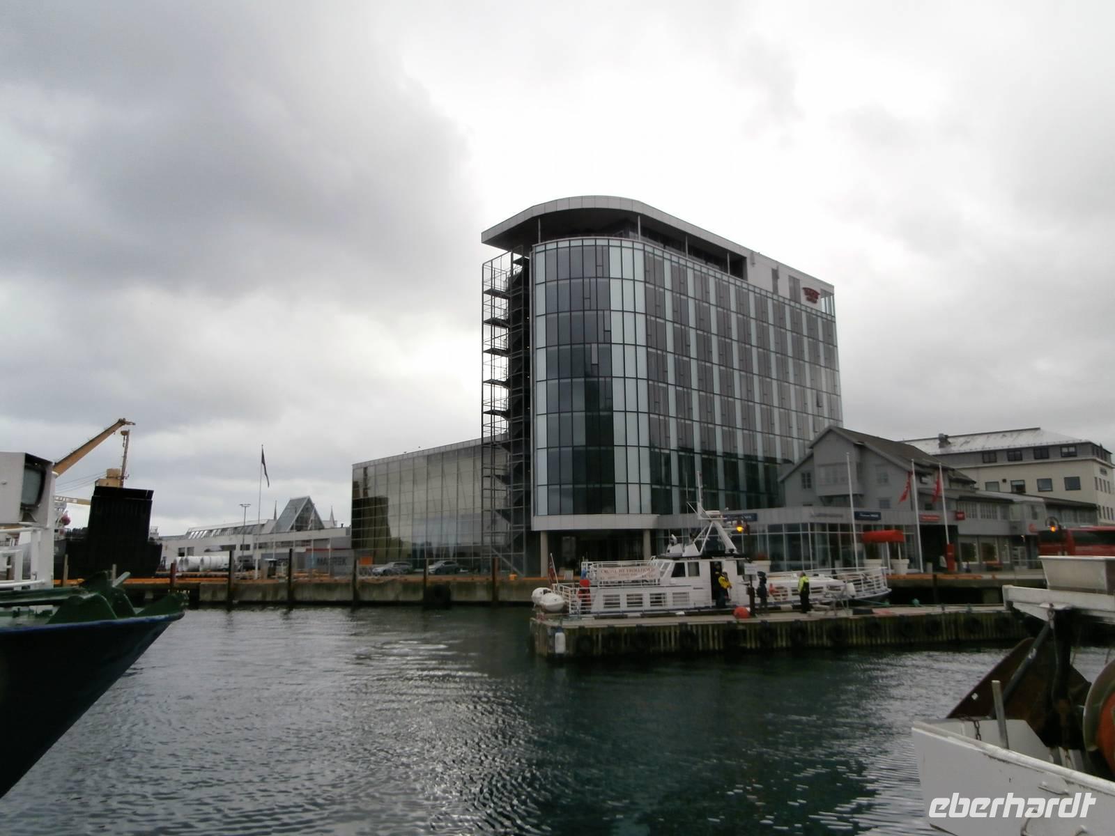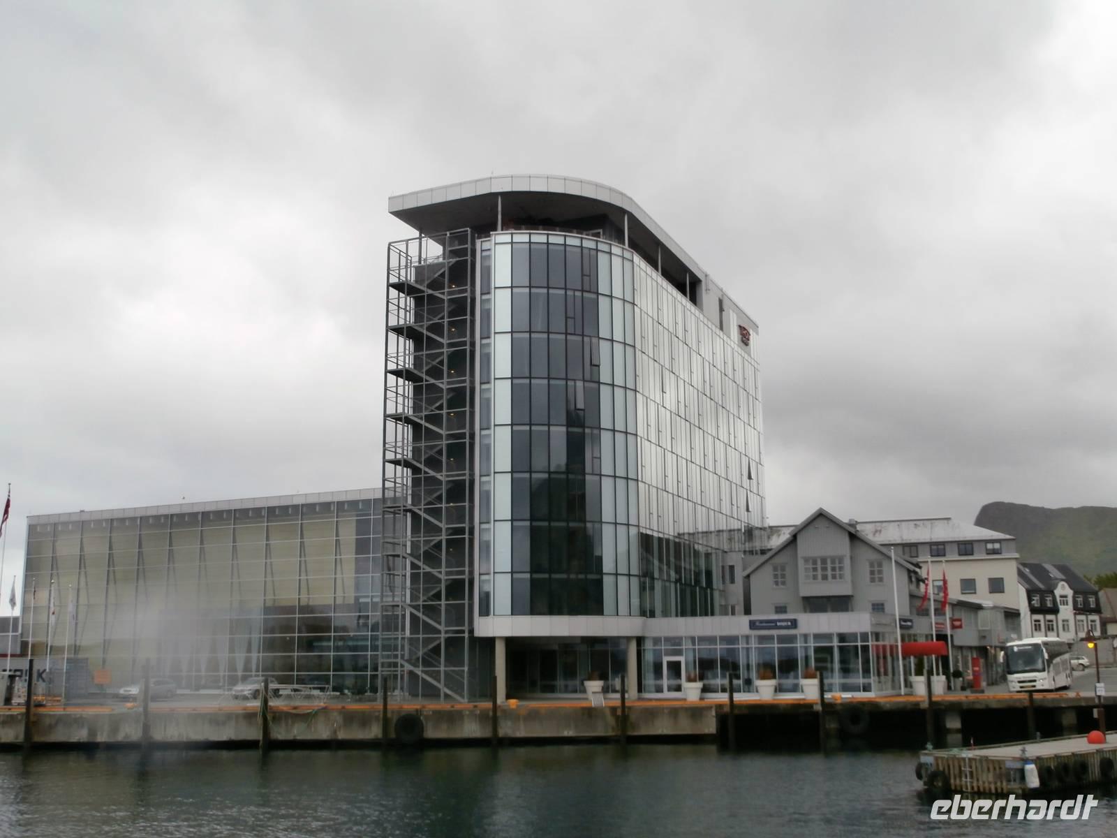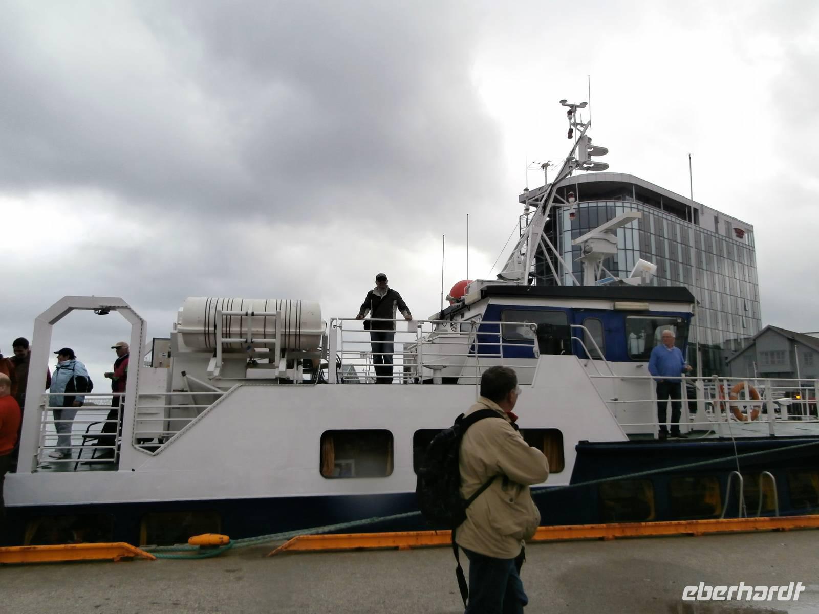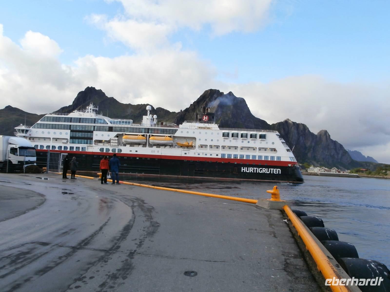 Zur Halbinsel Trondenes führt uns der Weg am Morgen, wieder mit Regen und Kälte sind wir unterwegs. Hier sehen wir uns die alte Steinkirche mit der noch im Original erhaltenen Eingangstür mit eingelassener Elle an. Im historischen Center kaufen wir noch ein, viele Gäste schauen auch in die Ausstellung hinein und ein Film wird uns auch gezeigt. Wir erleben die Fahrt auf einem kleinen Schiff durch den Raftsundet und den Trollfjorden zu unserer Seeadler Safari. Oben draußen auf Deck ist es kalt und windig, auch Regen kann uns nicht abhalten, der Anlockung von Seeadlern mit Fisch beizuwohnen. Mit Kaffee, Tee und leckerer Fischsuppe verwöhnt uns die Crew. In Svolvär werden wir von Roy im Hafen am Thon Hotel empfangen. Leider sind nicht alle Gäste mit den Zimmern zufrieden und auch Buschauffeur und Reiseleitung werden hier gar ausquartiert.