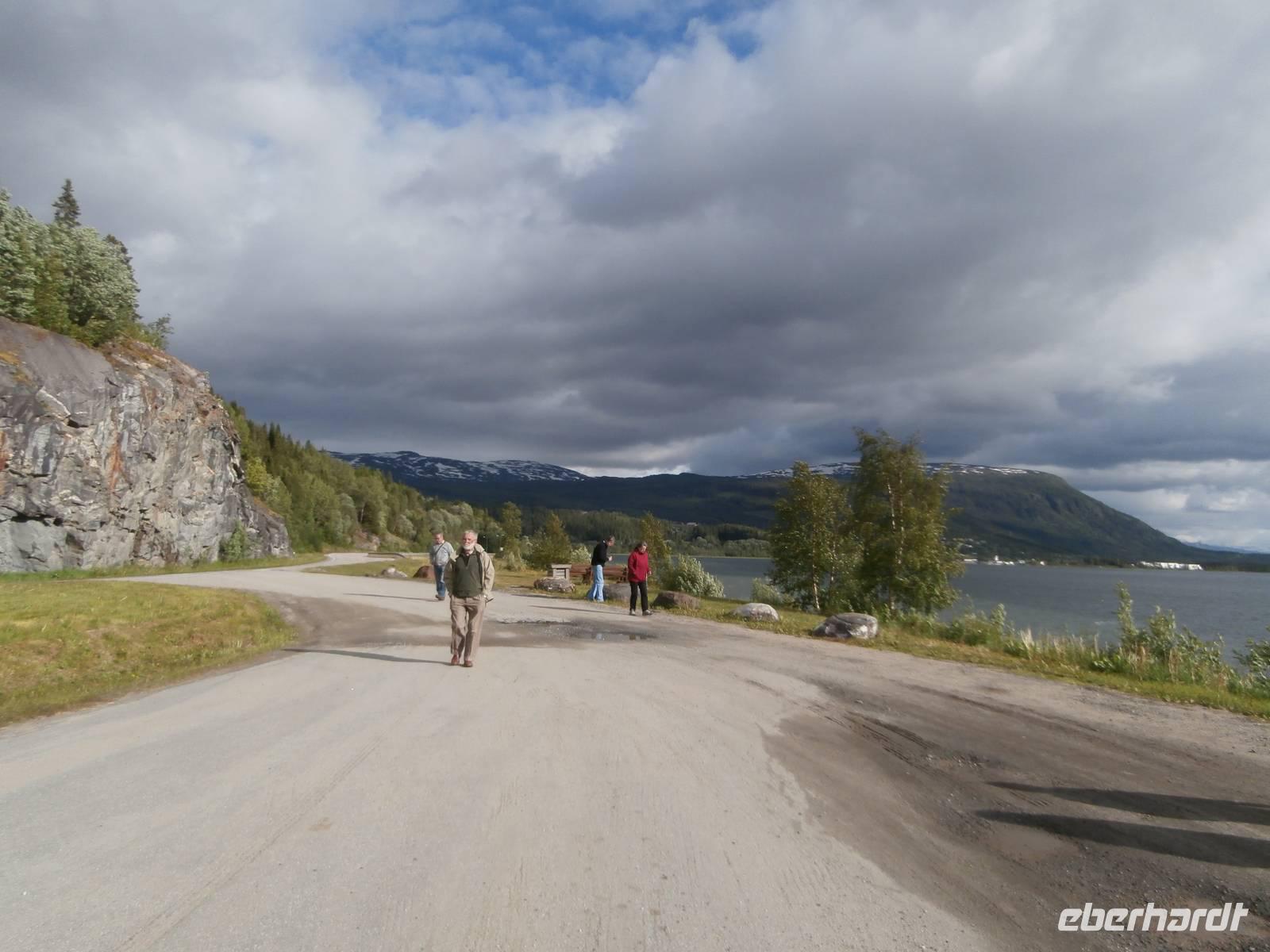 Wir dürfen etwas früher zum Frühstück kommen, denn unsere Fährüberfahrt nach Skutvik, auf das Festland, ist schon für 08.15 Uhr am Morgen geplant. Bei etwas Sonne, Wind und sehr kühlen Temperaturen starten wir unsere Fährüberfahrt gen Ost. Mit unserem Bus geht die Fahrt auf der E6 gen Süden weiter. Nach einem Mittagsstopp mit Einkauf im Landhandel und reichlich guten Aussichten auf Wasserfälle, Seen und Fjorde kommen wir am späten Nachmittag am Polarkreis an. Und hier werden wir wieder mit Kälte und sogar Schnee empfangen. Es werden Karten an die Lieben geschrieben, denn ein besonderer Stempel kommt auf die Marke. Nach Fotos und Einkäufen geht unsere Fahrt weiter über Mo i Rana bis nach Mosjoen zur nächsten Übernachtung.
