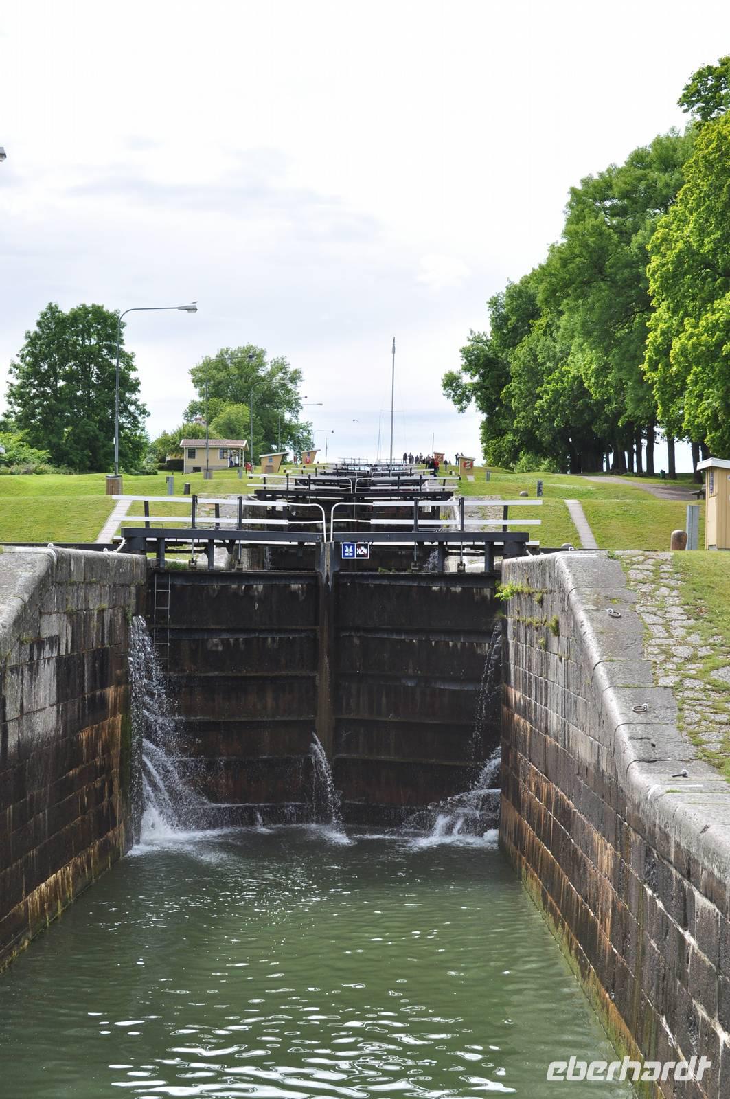 7-Kammern-Schleuse (7 Schleusen direkt nacheinander), die auf dem Weg vom See Roxen in Richtung Vättern an dieser Stelle einen Höhenunterschied von über 18m überwindet.