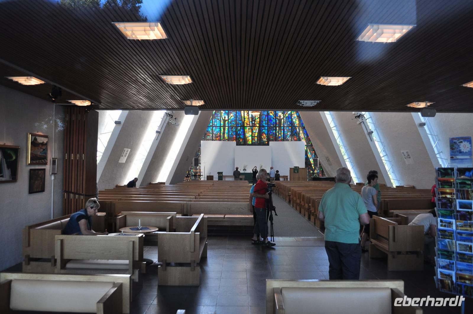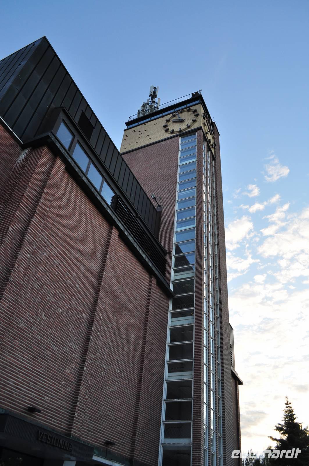 Die meisten anderen Reisegruppen verlassen Lahti nun auf dem schnellsten Weg über die Europastraße in Richtung Norden. Wir machen einen kleinen Abstecher in die Stadt und besuchen die Kreuzkirche geplant und erbaut von keinem geringen als den berühmtesten finnischen Architekten und Designer Alvar Aalto. Von der Kirche hat man über eine lange Sichtachse einen tollen Blick hinunter zum Marktplatz der Stadt und dem in einer geraden Linie gegenüberliegenden Backsteinrathaus. Zu den Klängen eines klassischen Konzertes erreichen wir die futuristische Sibeliushalle , in der das genannte Konzert aufgenommen wurde. In einem modernen Ensemble aus Backsteinfundament einer alten Fabrik mit einem modernen uns sehr ansprechenden Glas-Holz-Bau betrachten wir die direkt am See gelegene Konzerthalle.