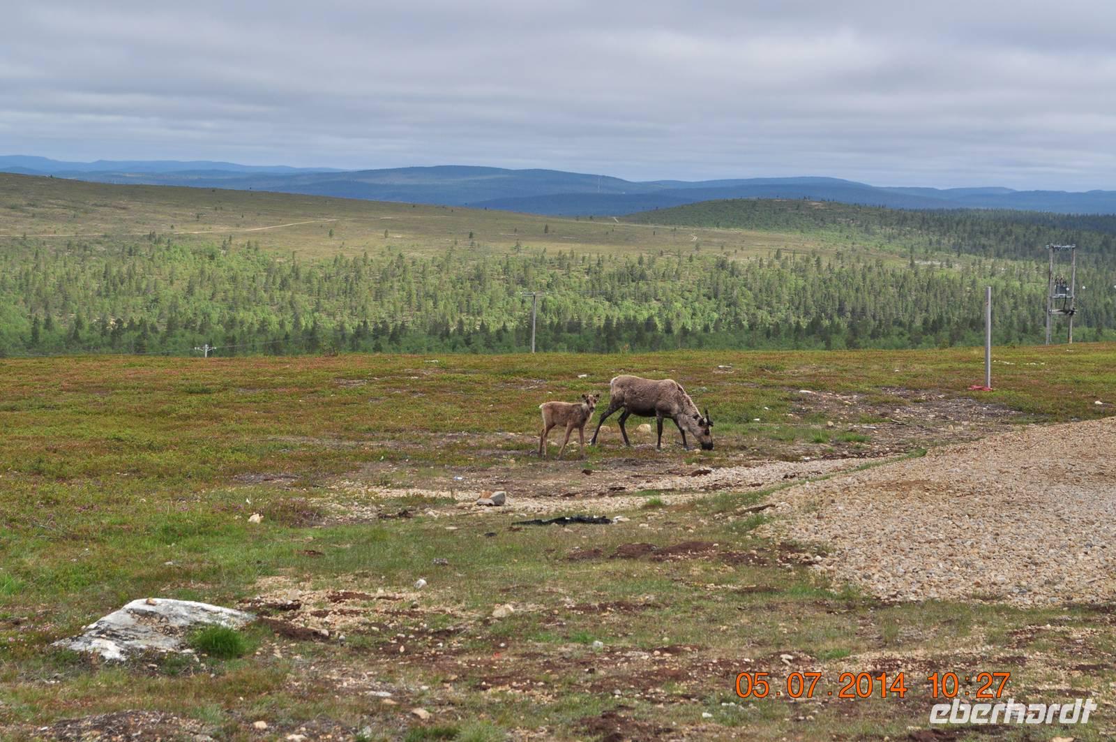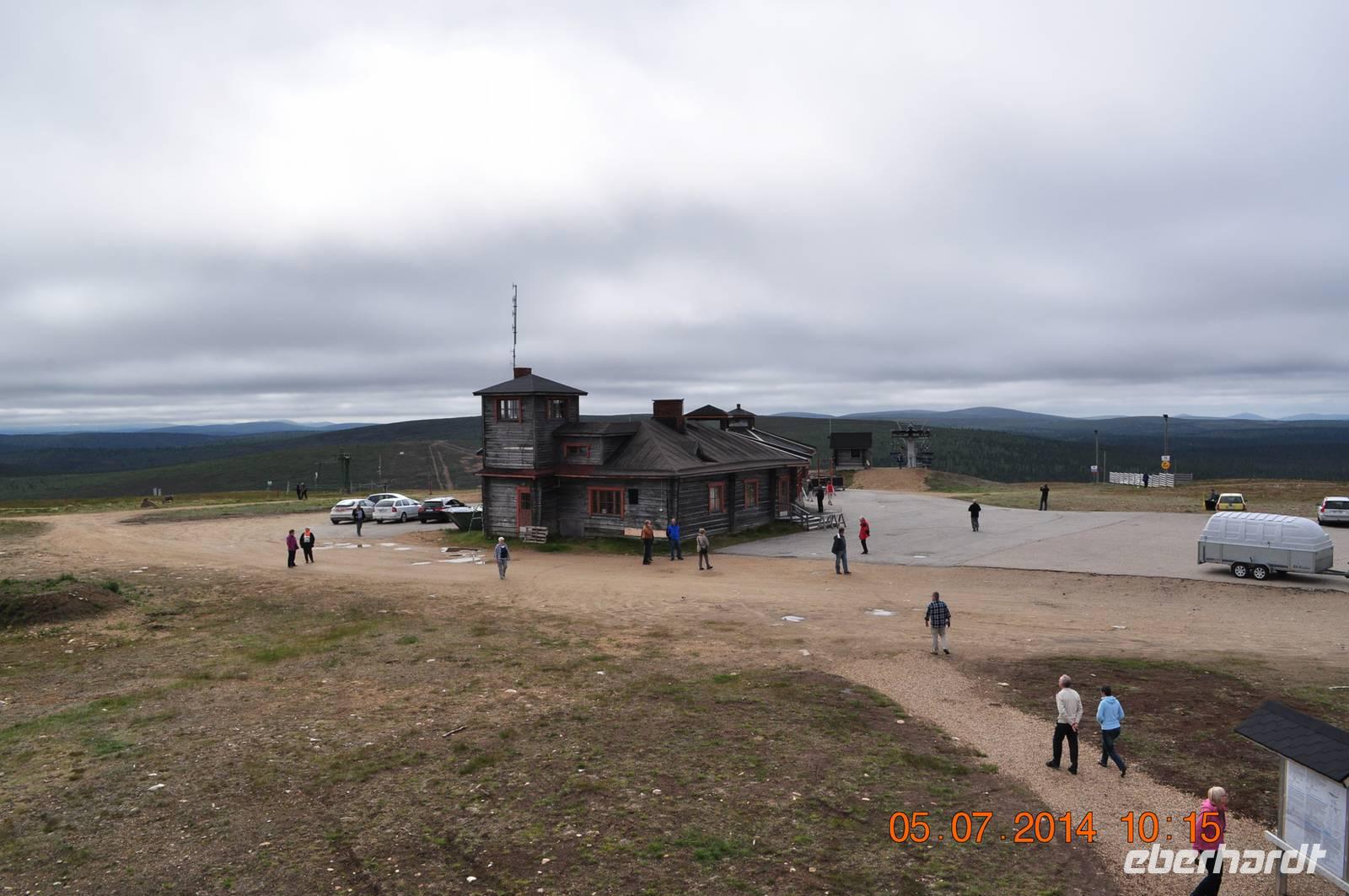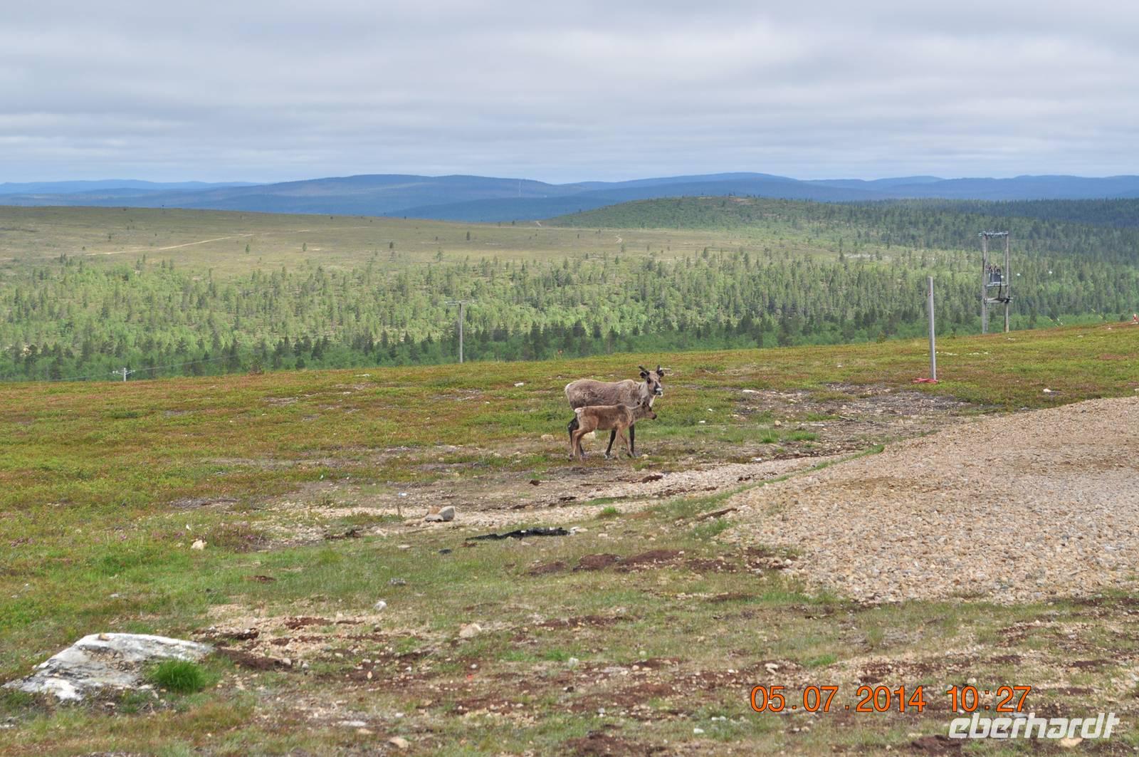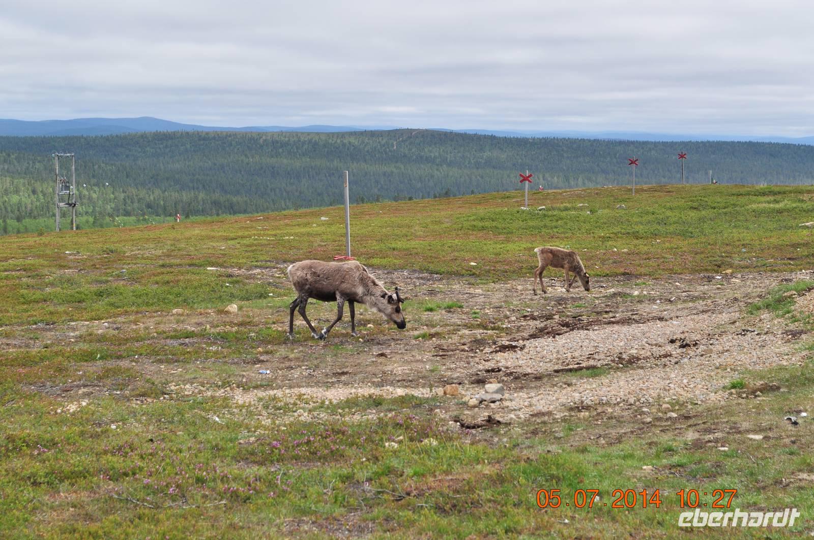 Nach dem alle wichtigen Weihnachtseinkäufe erledigt sind fahren wir weiter ins wilde Lappland. Unser heutiges Hotel liegt gewollt irgendwo im nirgendwo. Um uns herum liegt absolute Wildnis. Im Winter ein beliebtes Wintersporthotel, im Sommer lockt eine kurze Wanderung auf den nahe gelegenen Luostotunturi. Einer von diesen waldlosen Hügeln geprägt durch die karge Vegetation der Bergtundra. Mitten in der Wildnis. Die finnische Luftwaffe ist stark vertreten, kann uns aber von einem Abendspaziergang auf den Gipfel des Luostotunturi nicht abhalten. Unser Mut wird belohnt durch die Sichtung einer Rentiergruppe, die mit uns absteigt.