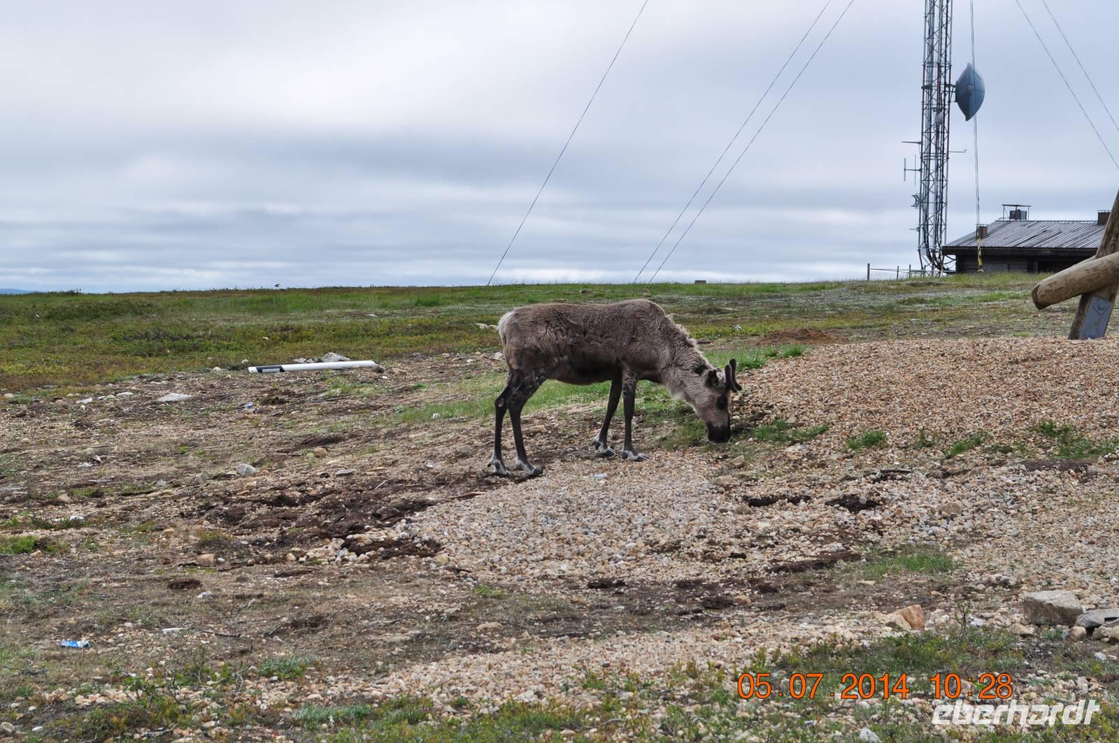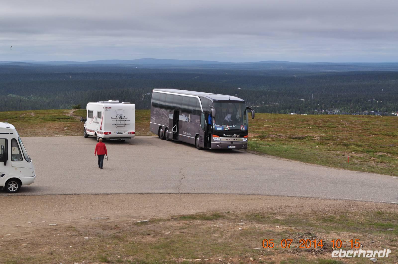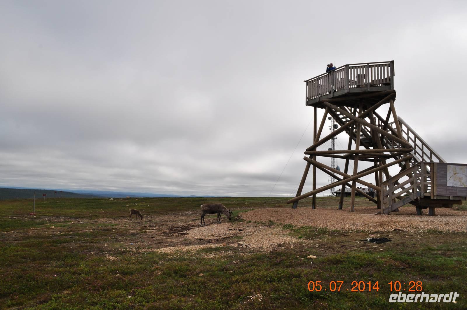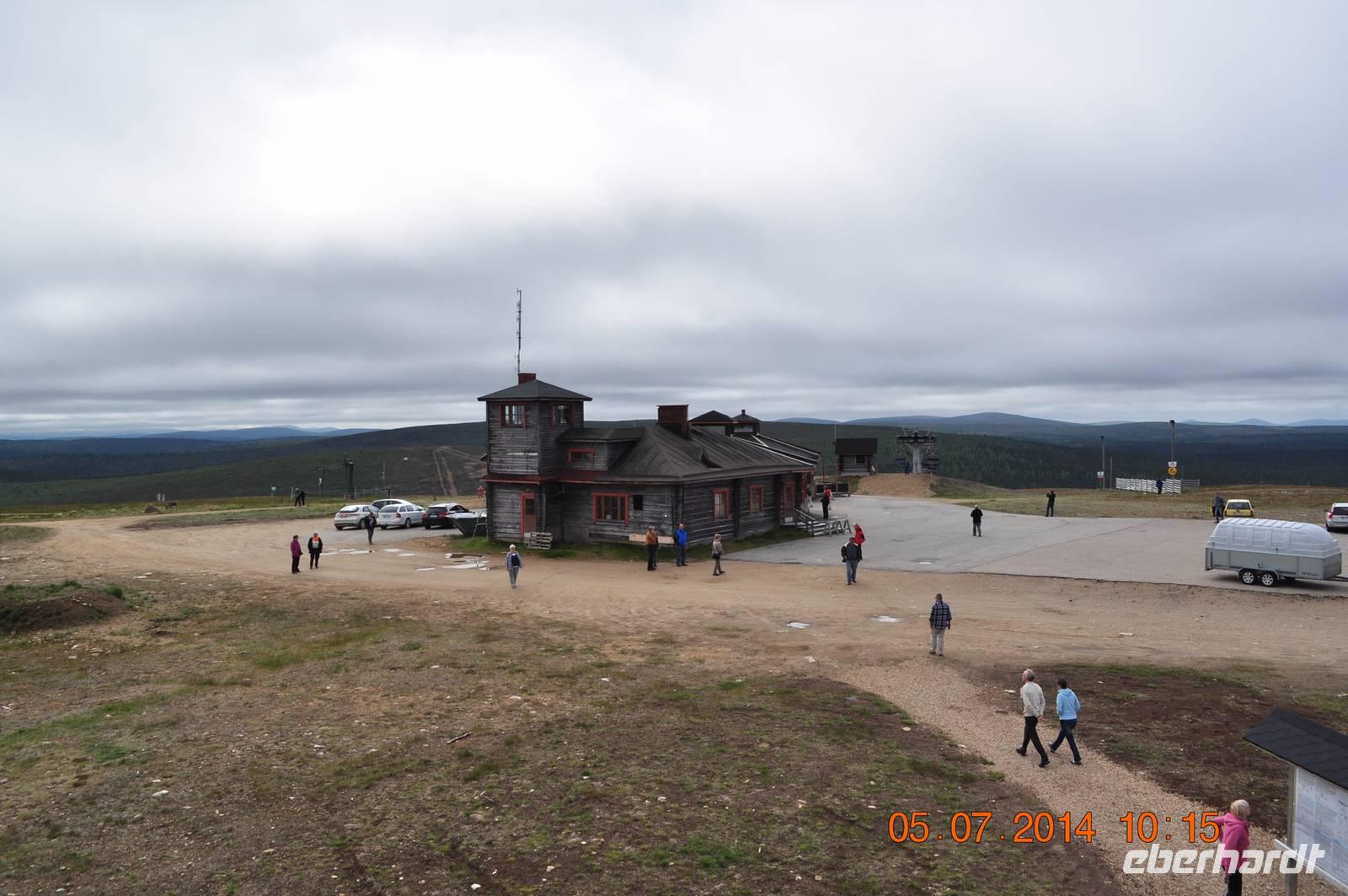 Nach dem alle wichtigen Weihnachtseinkäufe erledigt sind fahren wir weiter ins wilde Lappland. Unser heutiges Hotel liegt gewollt irgendwo im nirgendwo. Um uns herum liegt absolute Wildnis. Im Winter ein beliebtes Wintersporthotel, im Sommer lockt eine kurze Wanderung auf den nahe gelegenen Luostotunturi. Einer von diesen waldlosen Hügeln geprägt durch die karge Vegetation der Bergtundra. Mitten in der Wildnis. Die finnische Luftwaffe ist stark vertreten, kann uns aber von einem Abendspaziergang auf den Gipfel des Luostotunturi nicht abhalten. Unser Mut wird belohnt durch die Sichtung einer Rentiergruppe, die mit uns absteigt.