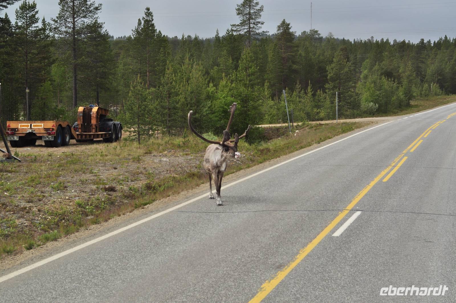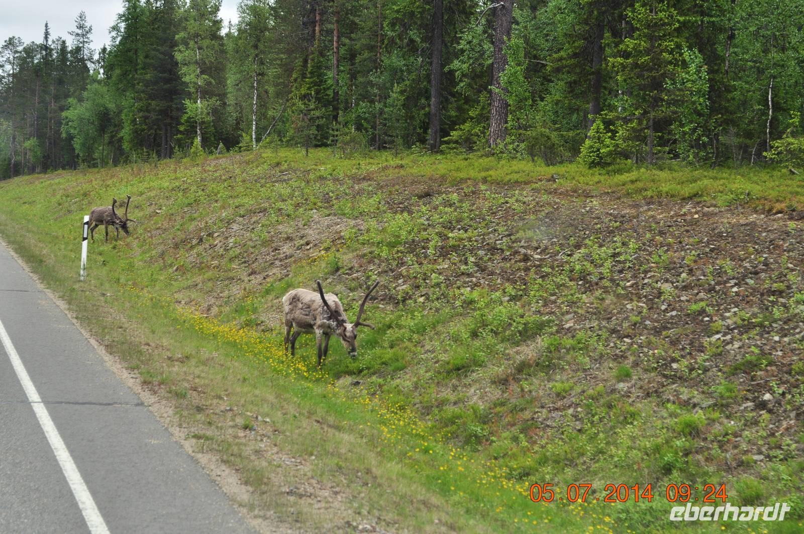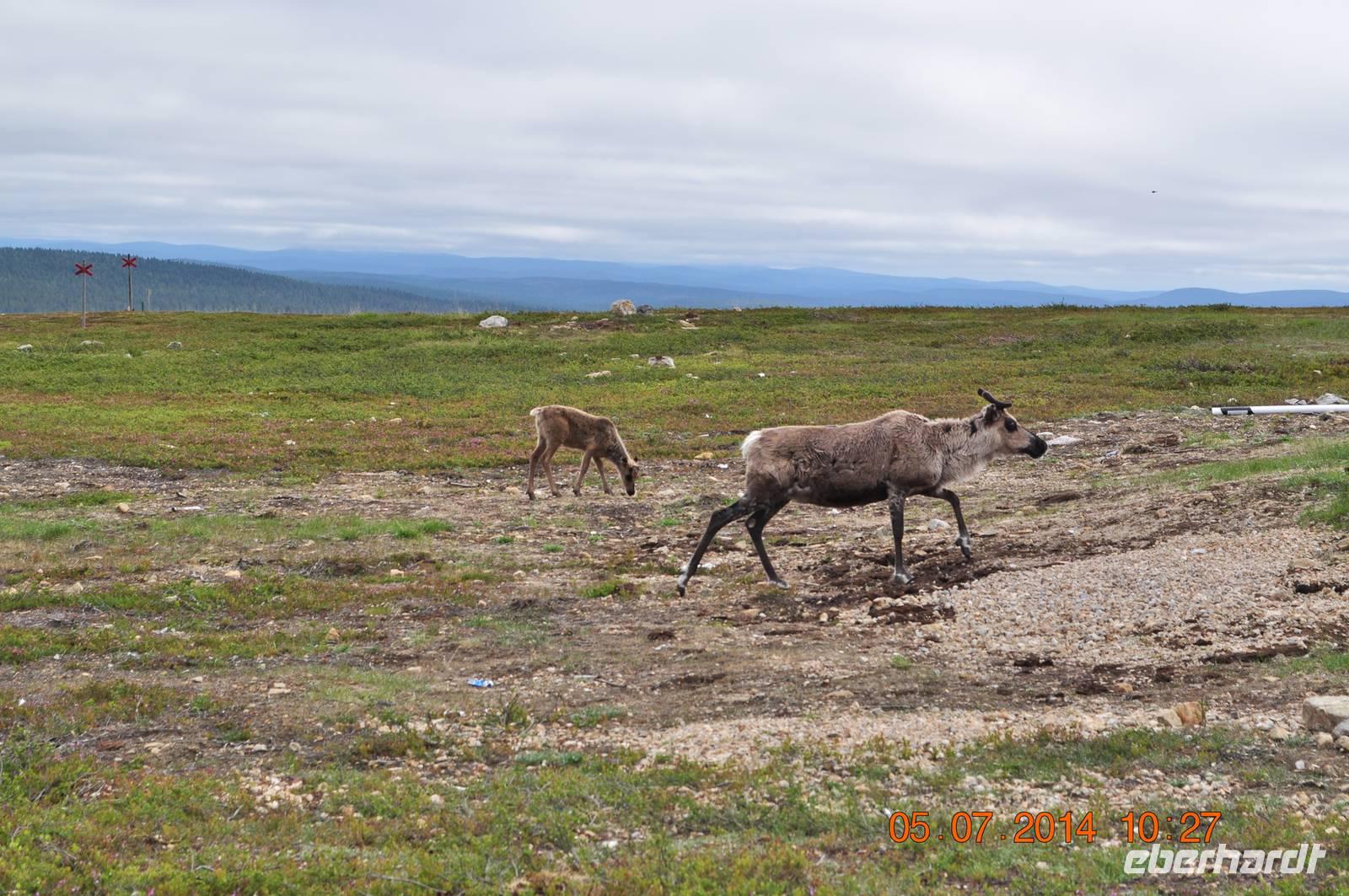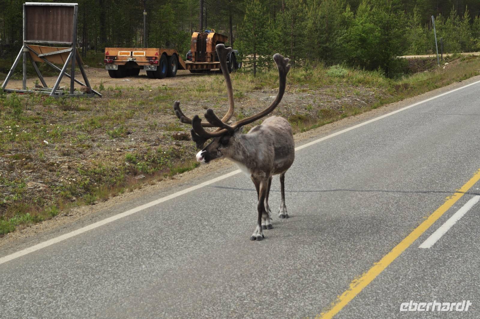 Nach dem alle wichtigen Weihnachtseinkäufe erledigt sind fahren wir weiter ins wilde Lappland. Unser heutiges Hotel liegt gewollt irgendwo im nirgendwo. Um uns herum liegt absolute Wildnis. Im Winter ein beliebtes Wintersporthotel, im Sommer lockt eine kurze Wanderung auf den nahe gelegenen Luostotunturi. Einer von diesen waldlosen Hügeln geprägt durch die karge Vegetation der Bergtundra. Mitten in der Wildnis. Die finnische Luftwaffe ist stark vertreten, kann uns aber von einem Abendspaziergang auf den Gipfel des Luostotunturi nicht abhalten. Unser Mut wird belohnt durch die Sichtung einer Rentiergruppe, die mit uns absteigt.